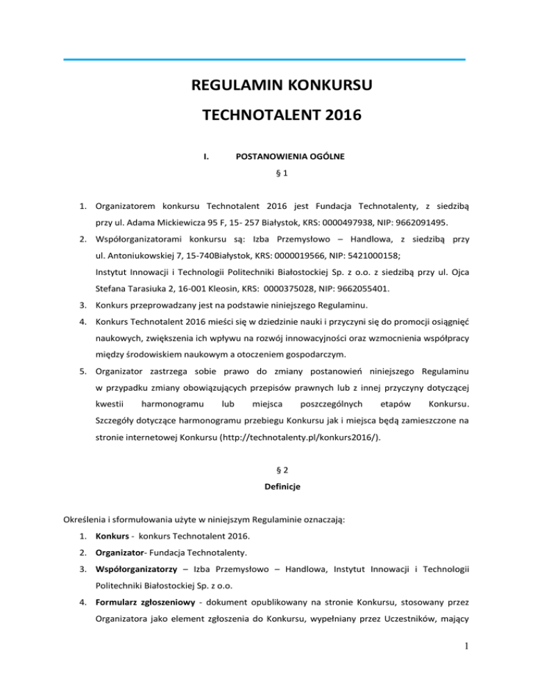 REGULAMIN KONKURSU TECHNOTALENT 2016 I. POSTANOWIENIA OGÓLNE §1 1. Organizatorem konkursu Technotalent 2016 jest Fundacja Technotalenty, z siedzibą przy ul. Adama Mickiewicza 95 F, 15- 257 Białystok, KRS: 0000497938, NIP: 9662091495. 2. Współorganizatorami konkursu są: Izba Przemysłowo – Handlowa, z siedzibą przy ul. Antoniukowskiej 7, 15-740Białystok, KRS: 0000019566, NIP: 5421000158; Instytut Innowacji i Technologii Politechniki Białostockiej Sp. z o.o. z siedzibą przy ul. Ojca Stefana Tarasiuka 2, 16-001 Kleosin, KRS: 0000375028, NIP: 9662055401. 3. Konkurs przeprowadzany jest na podstawie niniejszego Regulaminu. 4. Konkurs Technotalent 2016 mieści się w dziedzinie nauki i przyczyni się do promocji osiągnięd naukowych, zwiększenia ich wpływu na rozwój innowacyjności oraz wzmocnienia współpracy między środowiskiem naukowym a otoczeniem gospodarczym. 5. Organizator zastrzega sobie prawo do zmiany postanowieo niniejszego Regulaminu w przypadku zmiany obowiązujących przepisów prawnych lub z innej przyczyny dotyczącej kwestii harmonogramu lub miejsca poszczególnych etapów Konkursu. Szczegóły dotyczące harmonogramu przebiegu Konkursu jak i miejsca będą zamieszczone na stronie internetowej Konkursu (http://technotalenty.pl/konkurs2016/). §2 Definicje Określenia i sformułowania użyte w niniejszym Regulaminie oznaczają: 1. Konkurs - konkurs Technotalent 2016. 2. Organizator- Fundacja Technotalenty. 3. Współorganizatorzy – Izba Przemysłowo – Handlowa, Instytut Innowacji i Technologii Politechniki Białostockiej Sp. z o.o. 4. Formularz zgłoszeniowy - dokument opublikowany na stronie Konkursu, stosowany przez Organizatora jako element zgłoszenia do Konkursu, wypełniany przez Uczestników, mający 1 na celu zadeklarowanie chęci uczestnictwa, a także służący przekazaniu podstawowych informacji na temat osoby/osób zgłaszających się do Konkursu, jak i na temat zgłaszanego projektu. 5. Uczestnik – osoba lub zespół osób, które zadeklarują udział w Konkursie, posiadają prawo własności intelektualnej do projektu zgłaszanego w Konkursie, są związane poprzez miejsce urodzenia, zatrudnienia, nauki lub zamieszkaniaz regionem północno-wschodniej Polski* (w przypadku zespołu co najmniej jedna osoba) oraz wypełnią kompletnie Formularz zgłoszeniowy oraz udostępnią film albo prezentację konkursową.Zgłaszad się mogą jedynie osoby fizyczne nie prowadzące działalności gospodarczej. Uczestnik musi byd w wieku od 18 do 35 lat (rocznikowo). Możliwy jest udział niepełnoletnich uczniów szkół ponadgimnazjalnych, jeżeli są członkami zespołu, którego liderw dniu złożenia projektu jestpełnoletni i w wieku do 35 lat (rocznikowo). Wraz ze Zgłoszeniem zespołu należy przesład Organizatorowi wykaz członków zespołu autorskiego, sporządzony wg załącznika nr 1. Każda z osób wymienionych w wykazie musi złożyd podpis przy swoim nazwisku.W razie zajścia zdarzenia losowego, uniemożliwiającego udział w Konkursie członka zespołu dopuszcza się zmianę składu poprzez zastąpienie osoby nie mogącej uczestniczyd w Konkursie inną osobą, pod warunkiem uprzedniego pisemnego poinformowania Organizatora o powyższym wraz ze wskazaniem przyczyn zamiany oraz podaniem danych osoby zastępującej i po dołączeniu jej oświadczenia o zaakceptowaniu niniejszego Regulaminu oraz o dysponowaniu prawem do zgłaszanego projektu. 6. Zgłoszenie –wypełniony Formularz zgłoszeniowy oraz film albo prezentacja konkursowa, przedstawiająca projekt zrealizowany, będący w trakcie realizacji albo planowany do realizacji, które świadczą o uzdolnieniach Uczestnika. 7. Film lub prezentacja konkursowa – film lub prezentacja w dowolnej formieprzedstawiająca zrealizowany, realizowany lub planowany do realizacji projekt Uczestnika, świadczący o jego uzdolnieniach. 8. Kategorie Konkursu – kategorie do których zgłaszane są projekty Uczestników Konkursu: Technika, Technotalent PB, Biznes. 9. Kapituła Konkursu- gremium utworzone w celu dokonania oceny nadesłanych do Konkursu zgłoszeo i kwalifikacji wybranych Uczestników Konkursu do kolejnych jego etapów. Skład osobowy Kapituły powołuje Organizator. 10. Lider – osoba pełnoletnia do 35 lat, będąca Uczestnikiem Konkursu i stojąca na czele zespołu zgłoszonego do Konkursu. 11. Opiekun – osoba pełnoletnia będąca nauczycielem sprawująca opiekę nad zespołem uczestników zgłoszonych do Konkursu. 2 12. Projekt – pomysł lub projekt zrealizowany, będący w trakcie realizacji albo planowany do realizacji, który świadczy o uzdolnieniach Uczestnika. II. ZASADY UDZIAŁU W KONKURSIE I SELEKCJI PROJEKTÓW §3 Rodzaje Projektów kwalifikujących się do udziału w Konkursie 1. W Konkursie mogą brad udział Uczestnicy, którzynadeślą Zgłoszenie za pomocą Formularza zgłoszeniowego, w którym zaprezentują Projekt w formie Filmu lub prezentacji konkursowej. 2. Zgłoszone Projekty ocenia Kapituła Konkursu. 3. Projekty są zgłaszane w trzech Kategoriach Konkursu: a) Technika- Projekt nowego wynalazku/produktu/usługi, które są nowym rozwiązaniem technicznym związanym z wykorzystaniem nowoczesnej technologii. b) TechnotalentPB – Projekt nowego wynalazku/produktu/usługi, które są nowym rozwiązaniem technicznym związanym z wykorzystaniem nowoczesnej technologii. Kategoria skierowana do studentów, absolwentów i pracowników Politechniki Białostockiej. Do tej kategorii zastosowanie ma niniejszy regulamin z odrębnościami wskazanymi w Dziale III. c) Biznes - Projekt o wysokim potencjale komercjalizacji, w którym wykorzystywana jest nowoczesna technologia. 4. W jednym Zgłoszeniu Uczestnik może zgłosid Projekt tylko do jednej z trzech Kategorii: Technika, Technotalent PB, Biznes. 5. Organizator umożliwia Zgłoszenie Projektu jednocześnie w kilku Kategoriach Konkursu. 6. Projekt zgłoszony do Konkursu nie może byd Projektem, który był lub jest skome