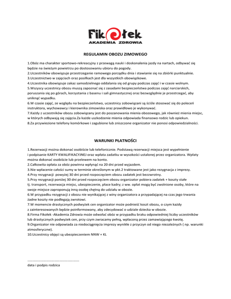 REGULAMIN OBOZU ZIMOWEGO 1.Obóz ma charakter sportowo-rekreacyjny z przewagą nauki i doskonalenia jazdy na nartach, odbywać się będzie na świeżym powietrzu po dostosowaniu ubioru do pogody. 2.Uczestników obowiązuje przestrzeganie ramowego porządku dnia i stawianie się na zbiórki punktualnie. 3.Uczestnictwo w zajęciach oraz posiłkach jest dla wszystkich obowiązkowe. 4.Uczestnika obowiązuje zakaz samodzielnego oddalania się od grupy podczas zajęć i w czasie wolnym. 5.Wszyscy uczestnicy obozu muszą zapoznać się z zasadami bezpieczeństwa podczas zajęć narciarskich, poruszania się po górach, korzystania z basenu i sali gimnastycznej oraz bezwzględnie je przestrzegać, aby uniknąć wypadku. 6.W czasie zajęć, ze względu na bezpieczeństwo, uczestnicy zobowiązani są ściśle stosować się do poleceń instruktora, wychowawcy i kierownika zimowiska oraz prawidłowo je wykonywać. 7.Każdy z uczestników obozu zobowiązany jest do poszanowania mienia obozowego, jak również mienia miejsc, w których odbywają się zajęcia.Za każde uszkodzenie mienia odpowiada finansowo rodzic lub opiekun. 8.Za przywiezione telefony komórkowe i zagubione lub zniszczone organizator nie ponosi odpowiedzialności. WARUNKI PŁATNOŚCI 1.Rezerwacji można dokonać osobiście lub telefonicznie. Podstawą rezerwacji miejsca jest wypełnienie i podpisanie KARTY KWALIFIKACYJNEJ oraz wpłata zadatku w wysokości ustalonej przez organizatora. Wpłaty można dokonać osobiście lub przelewem na konto. 2.Całkowita opłata za obóz powinna wpłynąć na 20 dni przed wyjazdem. 3.Nie wpłacenie całości sumy w terminie określonym w pkt.2 traktowane jest jako rezygnacja z imprezy. 4.Przy rezygnacji powyżej 30 dni przed rozpoczęciem obozu zadatek jest bezzwrotny. 5.Przy rezygnacji poniżej 30 dni przed rozpoczęciem obozu organizator pobiera zadatek + koszty stałe tj. transport, rezerwacja miejsc, ubezpieczenie, płace kadry; z ww. opłat mogą być zwolnione osoby, które na swoje miejsce zaproponują inną osobę chętną do udziału w obozie. 6.W przypadku rezygnacji z obozu nie wynikającej z winy organizatora a przypadającej na czas jego trwania żadne koszty nie podlegają zwrotowi. 7.W momencie drastycznych podwyżek cen organizator może podnieść koszt obozu, o czym każdy z zainteresowanych będzie poinformowany, aby zdecydować o udziale dziecka w obozie. 8.Firma Fikołek -Akademia Zdrowia może odwołać obóz w przypadku braku odpowiedniej liczby uczestników lub drastycznych podwyżek cen, przy czym zwracamy pełną, wpłaconą przez zamawiającego kwotę. 9.Organizator nie odpowiada za niedociągnięcia imprezy wynikłe z przyczyn od niego niezależnych ( np. warunki atmosferyczne). 10.Uczestnicy objęci są ubezpieczeniem NNW + KL …………………………………………………. data i podpis rodzica