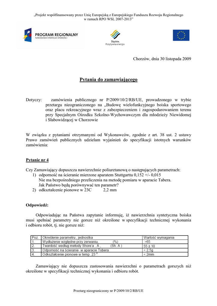 „Projekt współfinansowany przez Unię Europejską z Europejskiego Funduszu Rozwoju Regionalnego w ramach RPO WSL 2007-2013” Chorzów, dnia 30 listopada 2009 Pytania do zamawiającego Dotyczy: zamówienia publicznego nr P/2009/10/2/RB/UE, prowadzonego w trybie przetargu nieograniczonego na „Budowę wielofunkcyjnego boiska sportowego oraz placu rekreacyjnego wraz z zabezpieczeniem i zagospodarowaniem terenu przy Specjalnym Ośrodku Szkolno-Wychowawczym dla młodzieŜy Niewidomej i Słabowidzącej w Chorzowie W związku z pytaniami otrzymanymi od Wykonawców, zgodnie z art. 38 ust. 2 ustawy Prawo zamówień publicznych udzielam wyjaśnień do specyfikacji istotnych warunków zamówienia: Pytanie nr 4 Czy Zamawiający dopuszcza nawierzchnie poliuretanową o następujących parametrach: 1) odporność na ścieranie mierzone aparatem Stuttgartta 0,152 +/- 0,015 Nie ma bezpośredniego przeliczenia na metodę pomiaru w aparacie Tabera. Jak Państwo będą porównywać ten parametr? 2) odkształcenie pionowe w 23C 2,2 mm Odpowiedź: Odpowiadając na Państwa zapytanie informuję, iŜ nawierzchnia syntetyczna boiska musi spełniać parametry nie gorsze niŜ określone w specyfikacji technicznej wykonania i odbioru robót, tj. nie gorsze niŜ: Zamawiający nie dopuszcza zastosowania nawierzchni o parametrach gorszych niŜ określone w specyfikacji technicznej wykonania i odbioru robót. Przetarg nieograniczony nr P/2009/10/2/RB/UE Pytanie nr 5 Po zapoznaniu się z treścią ogłoszenia przetargu oraz po analizie dokumentacji technicznej, będącej w posiadaniu Inwestora, chcąc przystąpić do przetargu na budowę obiektu j.w. proszę uprzejmie o uzupełnienie treści SIWZ i przedmiaru kosztorysowego robót, jak następuje (lub ewentualnie o wyjaśnienie wątpliwości): 1) – Przedmiar, Dział 2; CPV 453100000-3 Oświetlenie: poz. – 15 – proszę o podanie mocy i ilości opraw na poszczególnych słupach; wg specyf. zastosowano projektory o mocy 400W, a wg obl. BMK, projektory 1000W poz. – 16 – j.w. dla słupów parkingowych (oczywiście inne moce opraw, do określenia) poz. – 23 – schemat tabl. ster. ośw. Lub szczegółowe zestawienie materiałów jej wyposaŜenia. Jednocześnie proszę o wyjaśnienie, czy w kosztorysie ofertowym naleŜy uwzględnić brakujące elementy typu pomiar skuteczności zerowania, pomiar obwodów, itp. pomiar elektr. oraz czy naleŜy uwzględnić instalację uziemiającą, czego nie przewiduje przedmiar robót. Wobec powyŜszych wątpliwości proszę o informację, czy naleŜy się posługiwać nie kompletnym przedmiarem robót, czy teŜ logiką projektowo-wykonawczą. Inwestor, w trakcie mojej wizyty na miejscu, w dniu 26-11-2009, nie przedstawił szczegółowej dokumentacji technicznej branŜy elektr.-oświetl. W zaleŜności od odpowiedzi Inwestora powstanie róŜnica cenowa. Reasumując proszę o udostępnienie kompletnego projektu wykonawczego branŜy elektroinstalacyjnej lub o kompleksowe wyjaśnienie wątpliwości, w postaci schematów elektr. lub szczegółowych zestawień materiałów. PoniewaŜ przedstawione wątpliwości mają charakter cenotwórczy, proszę o szybką odpowiedź, co jest bardzo istotne dla terminowego sporządzenia rzetelnego kosztorysu przetargowego. Odpowiedź: Odpowiadając na Państwa zapytanie z dnia 27 listopada 2009 roku wyjaśniamy: 1. Przedmiar: 1) poz. 15 - naleŜy przyjąć po 1 oprawie na słup – moc projektora 1000 W 2) poz. 16 - naleŜy przyjąć moc opraw 160 W 3) poz. 23, 24 - naleŜy przyjąć typowe na podstawie projektu wykonawczego, który sporządzi Wykonawca robót elektrycznych. 2. W kosztorysach ofertowych uwzględnić instalację uziemiającą oraz pomiary obwodów i skuteczność zaworów. 3. Wykonawca robót elektrycznych powinien opracować projekt wykonawczy instalacji elektrycznych na podstawie parametrów oświetlenia podanych w projekcie budowlanym. Pytanie nr 6 W projekcie budowlano-wykonawczym dla wyŜej wymienionego zadania brak jest schematów szafki obsługi imprez SJ oraz tablicy zasilającej „TZS” (szczegółowa specyfikacja techniczna ST – 10 – Część elektryczna w pkt. 1.3 informuje, iŜ owe schematy są w projekcie). Prosimy o udostępnienie wyŜej wymienionych schematów. Przetarg nieograniczony nr P/2009/10/2/RB/UE 2 Ponadto w projekcie budowlano – wykonawczym dla oświetlenia boiska wydano słup o wysokości 8m – w przedmiarze natomiast 10m. prosimy o wyjaśnienie, jakiej wysokości słup naleŜy wycenić. Odpowiedź: Odpowiadając na Państwa zapytanie wyjaśniamy iŜ: 1. naleŜy przyjąć słupy oświetleniowe o wysokości 8,0m, 2. szafki i tablice przyjąć typowe według logiki projektowo –wykonawczej, 3. projekt wykonawczy sporządzi wykonawca robót elektrycznych. Przetarg nieograniczony nr P/2009/10/2/RB/UE 3