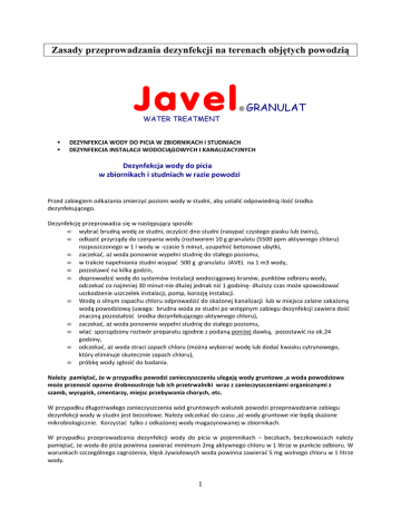 Zasady przeprowadzania dezynfekcji na terenach objętych powodzią ® GRANULAT WATER TREATMENT DEZYNFEKCJA WODY DO PICIA W ZBIORNIKACH I STUDNIACH DEZYNFEKCJA INSTALACJI WODOCIĄGOWYCH I KANALIZACYJNYCH Dezynfekcja wody do picia w zbiornikach i studniach w razie powodzi Przed zabiegiem odkażania zmierzyć poziom wody w studni, aby ustalić odpowiednią ilość środka dezynfekującego. Dezynfekcję przeprowadza się w następujący sposób: • wybrać brudną wodę ze studni, oczyścić dno studni (nasypać czystego piasku lub żwiru), • odkazić przyrządy do czerpania wody (roztworem 10 g granulatu (5500 ppm aktywnego chloru) rozpuszczonego w 1 l wody w -czasie 5 minut, uzupełnić betonowe ubytki, • zaczekać, aż woda ponownie wypełni studnię do stałego poziomu, • w trakcie napełniania studni wsypać 500 g granulatu JAVEL na 1 m3 wody, • pozostawić na kilka godzin, • doprowadzić wodę do systemów instalacji wodociągowej-kranów, punktów odbioru wody, odczekać co najmniej 30 minut-nie dłużej jednak niż 1 godzinę- dłuższy czas może spowodować uszkodzenie uszczelek instalacji, pomp, korozję instalacji. • Wodę o silnym zapachu chloru odprowadzić do skażonej kanalizacji lub w miejsca zalane zakażoną wodą powodziową (uwaga: brudna woda ze studni po wstępnym zabiegu dezynfekcji zawiera dość znaczną pozostałość środka dezynfekującego-aktywnego chloru), • zaczekać, aż woda ponownie wypełni studnię do stałego poziomu, • wlać sporządzony roztwór preparatu zgodnie z podaną poniżej dawką, pozostawić na ok.24 godziny, • odczekać, aż woda straci zapach chloru (można wybierać wodę lub dodać kwasku cytrynowego, który eliminuje skutecznie zapach chloru), • próbkę wody zgłosić do badania. Należy pamiętać, że w przypadku powodzi zanieczyszczeniu ulegają wody gruntowe ,a woda powodziowa może przenosić oporne drobnoustroje lub ich przetrwalniki wraz z zanieczyszczeniami organicznymi z szamb, wysypisk, cmentarzy, miejsc przebywania chorych, etc. W przypadku długotrwałego zanieczyszczenia wód gruntowych wskutek powodzi przeprowadzanie zabiegu dezynfekcji wody w studni jest bezcelowe. Należy odczekać do czasu ,aż wody gruntowe nie będą skażone mikrobiologicznie. Korzystać tylko z odkażonej wody magazynowanej w zbiornikach. W przypadku przeprowadzania dezynfekcji wody do picia w pojemnikach – beczkach, beczkowozach należy pamiętać, że woda do picia powinna zawierać minimum 2mg aktywnego chloru w 1 litrze w punkcie odbioru. W warunkach szczególnego zagrożenia, klęsk żywiołowych woda powinna zawierać 5 mg wolnego chloru w 1 litrze wody. 1 Należy pamiętać, iż mętność wody zmniejsza skuteczność dezynfekcyjną. Woda silnie zanieczyszczona, mętna wymaga dodatkowej dezynfekcji i filtracji przez warstwę tkaniny, przed dokonaniem puryfikacji. Skuteczność biobójcza wolnego chloru ulega zmniejszeniu w wodach o silnie alkalicznym pH, która wymaga dłuższego lub większego kontaktu z chlorem. Woda nadająca się do picia magazynowana w zbiornikach( np. dla zwierząt hodowlanych), które są narażone na silne działanie słońca, wysoką temperaturę otoczenia należy okresowo dezynfekować, aby zawierała minimalną ilość aktywnego chloru-2 ppm w 1 litrze. Substancja aktywna zawarta w granulacie - NaDCC -określona jest wg norm europejskich jako substancja chemiczna do puryfikacji wody pitnej w wypadkach zagrożenia epidemiologicznego . Zalecana w Wytycznych WHO dotyczących dezynfekcji wody do picia. UWAGA: Dezynfekcja wody pitnej nie usuwa zanieczyszczeń chemicznych zawartych w wodzie. Wodę z niesprawdzonych źródeł należy zawsze traktować jako skażoną pod względem mikrobiologicznym. Chlor nie kumuluje się w organizmie jest tolerowany przez komórki i materiały żywe w stężeniu 1,5% czynnego chloru, a pozostałością uboczną są nieznaczne ilości chlorku sodu(soli). Dezynfekcja wody do picia: Warunki dezynfekcji Warunki ekstremalne (powódź) Dawka początkowa (odkażanie studni po powodzi) Warunki normalne (profilaktyka) Dawkowanie środka dezynfekcyjnego 6-10 g granulatu Ilość wody dezynfekowanej 500g granulatu na 1 m3 wody na 1 m3 wody 3 g granulatu 600 L wody (2 ppm w 1 L). 300 L wody (4-6 ppm w 1 L). Dezynfekcja instalacji wodociągowych i kanalizacyjnych Aby skutecznie dokonać dezynfekcji instalacji wodociągowych należy : wlać do instalacji zwiększoną dawkę preparatu do ujęcia wody (studni) , doprowadzić odkażoną wodę do wszystkich ujęć (kranów) wody pitnej, a następnie odczekać co najmniej 30 minut (dłuższy czas oczekiwania zwiększa działanie dezynfekujące, ale może powodować dodatkową korozję instalacji), przepłukać solidnie instalację ,aż do czasu zaniku silnego zapachu chloru w wodzie, przed spożyciem - próbkę wody zgłosić do badania. W profilaktyce – stosować okresowo dawki tak, jak w przypadku dezynfekcji wody pitnej w studniach dla warunków normalnych. Zachować środki ostrożności w trakcie przeprowadzania dezynfekcji – używać rękawic, chronić oczy oraz zabezpieczyć miejsce dezynfekcji i środki do niej użyte przed dostępem dzieci. Przed zabiegiem dezynfekcji zapoznać się z Kartą Charakterystyki Substancji na stronie internetowej www.javel.pl Preparat biobójczy JAVEL®GRANULAT w postaci granulek wykazuje pełne działanie bakteriobójcze, prątkobójcze (Tbc), wirusobójcze, grzybobójcze. Posiada Pozwolenie Ministra Zdrowia RP. Informacja o produkcie : JAVEL Polska www.javel.pl [email protected] Dystrybucja: Chem-jan , Warszawa, ul. Marywilska 44 tel/fax:228110154, [email protected] 2