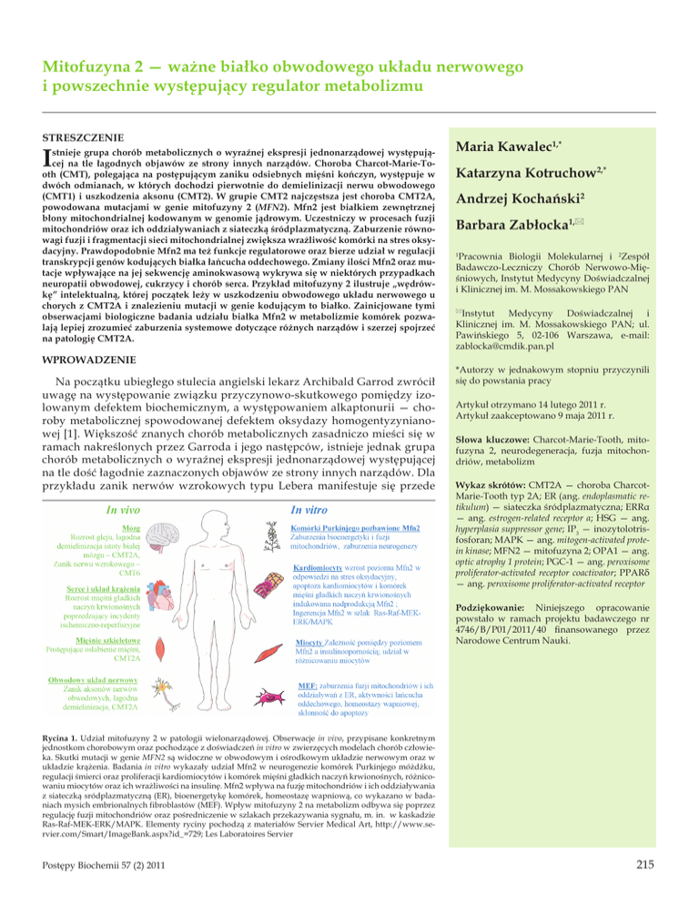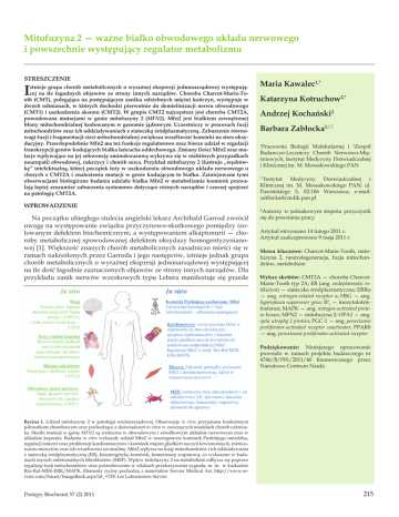 Mitofuzyna 2 — ważne białko obwodowego układu nerwowego i powszechnie występujący regulator metabolizmu Streszczenie I stnieje grupa chorób metabolicznych o wyraźnej ekspresji jednonarządowej występującej na tle łagodnych objawów ze strony innych narządów. Choroba Charcot-Marie-Tooth (CMT), polegająca na postępującym zaniku odsiebnych mięśni kończyn, występuje w dwóch odmianach, w których dochodzi pierwotnie do demielinizacji nerwu obwodowego (CMT1) i uszkodzenia aksonu (CMT2). W grupie CMT2 najczęstsza jest choroba CMT2A, powodowana mutacjami w genie mitofuzyny 2 (MFN2). Mfn2 jest białkiem zewnętrznej błony mitochondrialnej kodowanym w genomie jądrowym. Uczestniczy w procesach fuzji mitochondriów oraz ich oddziaływaniach z siateczką śródplazmatyczną. Zaburzenie równowagi fuzji i fragmentacji sieci mitochondrialnej zwiększa wrażliwość komórki na stres oksydacyjny. Prawdopodobnie Mfn2 ma też funkcje regulatorowe oraz bierze udział w regulacji transkrypcji genów kodujących białka łańcucha oddechowego. Zmiany ilości Mfn2 oraz mutacje wpływające na jej sekwencję aminokwasową wykrywa się w niektórych przypadkach neuropatii obwodowej, cukrzycy i chorób serca. Przykład mitofuzyny 2 ilustruje „wędrówkę” intelektualną, której początek leży w uszkodzeniu obwodowego układu nerwowego u chorych z CMT2A i znalezieniu mutacji w genie kodującym to białko. Zainicjowane tymi obserwacjami biologiczne badania udziału białka Mfn2 w metabolizmie komórek pozwalają lepiej zrozumieć zaburzenia systemowe dotyczące różnych narządów i szerzej spojrzeć na patologię CMT2A. WPROWADZENIE Na początku ubiegłego stulecia angielski lekarz Archibald Garrod zwrócił uwagę na występowanie związku przyczynowo-skutkowego pomiędzy izolowanym defektem biochemicznym, a występowaniem alkaptonurii — choroby metabolicznej spowodowanej defektem oksydazy homogentyzynianowej [1]. Większość znanych chorób metabolicznych zasadniczo mieści się w ramach nakreślonych przez Garroda i jego następców, istnieje jednak grupa chorób metabolicznych o wyraźnej ekspresji jednonarządowej występującej na tle dość łagodnie zaznaczonych objawów ze strony innych narządów. Dla przykładu zanik nerwów wzrokowych typu Lebera manifestuje się przede Maria Kawalec1,* Katarzyna Kotruchow2,* Andrzej Kochański2 Barbara Zabłocka1,* 1 Pracownia Biologii Molekularnej i 2Zespół Badawczo-Leczniczy Chorób Nerwowo-Mięśniowych, Instytut Medycyny Doświadczalnej i Klinicznej im. M. Mossakowskiego PAN Instytut Medycyny Doświadczalnej i Klinicznej im. M. Mossakowskiego PAN; ul. Pawińskiego 5, 02-106 Warszawa, e-mail: [email protected] * *Autorzy w jednakowym stopniu przyczynili się do powstania pracy Artykuł otrzymano 14 lutego 2011 r. Artykuł zaakceptowano 9 maja 2011 r. Słowa kluczowe: Charcot-Marie-Tooth, mitofuzyna 2, neurodegeneracja, fuzja mitochondriów, metabolizm Wykaz skrótów: CMT2A — choroba CharcotMarie-Tooth typ 2A; ER (ang. endoplasmatic retikulum) — siateczka śródplazmatyczna; ERRα — ang. estrogen-related receptor α; HSG — ang. hyperplasia suppressor gene; IP3 — inozytolotrisfosforan; MAPK — ang. mitogen-activated protein kinase; MFN2 — mitofuzyna 2; OPA1 — ang. optic atrophy 1 protein; PGC-1 — ang. peroxisome proliferator-activated receptor coactivator; PPARδ — ang. peroxisome proliferator-activated receptor Podziękowanie: Niniejszego opracowanie powstało w ramach projektu badawczego nr 4746/B/P01/2011/40 finansowanego przez Narodowe Centrum Nauki. Rycina 1. Udział mitofuzyny 2 w patologii wielonarządowej. Obserwacje in vivo, przypisane konkretnym jednostkom chorobowym oraz pochodzące z doświadczeń in vitro w zwierzęcych modelach chorób człowieka. Skutki mutacji w genie MFN2 są widoczne w obwodowym i ośrodkowym układzie nerwowym oraz w układzie krążenia. Badania in vitro wykazały udział Mfn2 w neurogenezie komórek Purkinjego móżdżku, regulacji śmierci oraz proliferacji kardiomiocytów i komórek mięśni gładkich naczyń krwionośnych, różnicowaniu miocytów oraz ich wrażliwości na insulinę. Mfn2 wpływa na fuzję mitochondriów i ich oddziaływania z siateczką sródplazmatyczną (ER), bioenergetykę komórek, homeostazę wapniową, co wykazano w badaniach mysich embrionalnych fibroblastów (MEF). Wpływ mitofuzyny 2 na metabolizm odbywa się poprzez regulację fuzji mitochondriów oraz pośredniczenie w szlakach przekazywania sygnału, m. in. w kaskadzie Ras-Raf-MEK-ERK/MAPK. Elementy ryciny pochodzą z materiałów Servier Medical Art, http://www.servier.com/Smart/ImageBank.aspx?id_=729; Les Laboratoires Servier Postępy Biochemii 57 (2) 2011 215 wszystkim ślepotą, jednakże u chorych opisywane są również objawy dodatkowe (polineuropatia obwodowa) [2]. Kolejnym przykładem może być choroba Pompego, gdzie obserwuje się współistnienie uszkodzenia mięśnia sercowego (kardiomiopatia) z uszkodzeniem mięśni szkieletowych [3]. Mitofuzyna 2 (Mfn2) jest białkiem błony mitochondrialnej występującym w wielu tkankach i narządach, a jednak najsilniej wyrażonym efektem uszkodzenia genu MFN2 jest zwyrodnienie aksonalne nerwów obwodowych [4]. Inne skutki uszkodzenia genu mitofuzyny ujawniają się, w ośrodkowym układzie nerwowym w nieporównanie bardziej dyskretny sposób (łagodna demielinizacja). A zatem białko Mfn2, którego funkcja początkowo była wiązana z ograniczonym procesem zwyrodnienia aksonalnego okazuje się być ważnym regulatorem metabolizmu w ośrodkowym układzie nerwowym. Przykład mitofuzyny wydaje się interesującą ilustracją pewnej „wędrówki” intelektualnej, której początku należy szukać w uszkodzeniu jednej tkanki — obwodowego układu nerwowego, a która już dziś pozwala lepiej zrozumieć zaburzenia systemowe dotyczące różnych narządów, na które, jak się okazuje, mają wpływ defekty w mitofuzynie 2. Tak właśnie, w uj