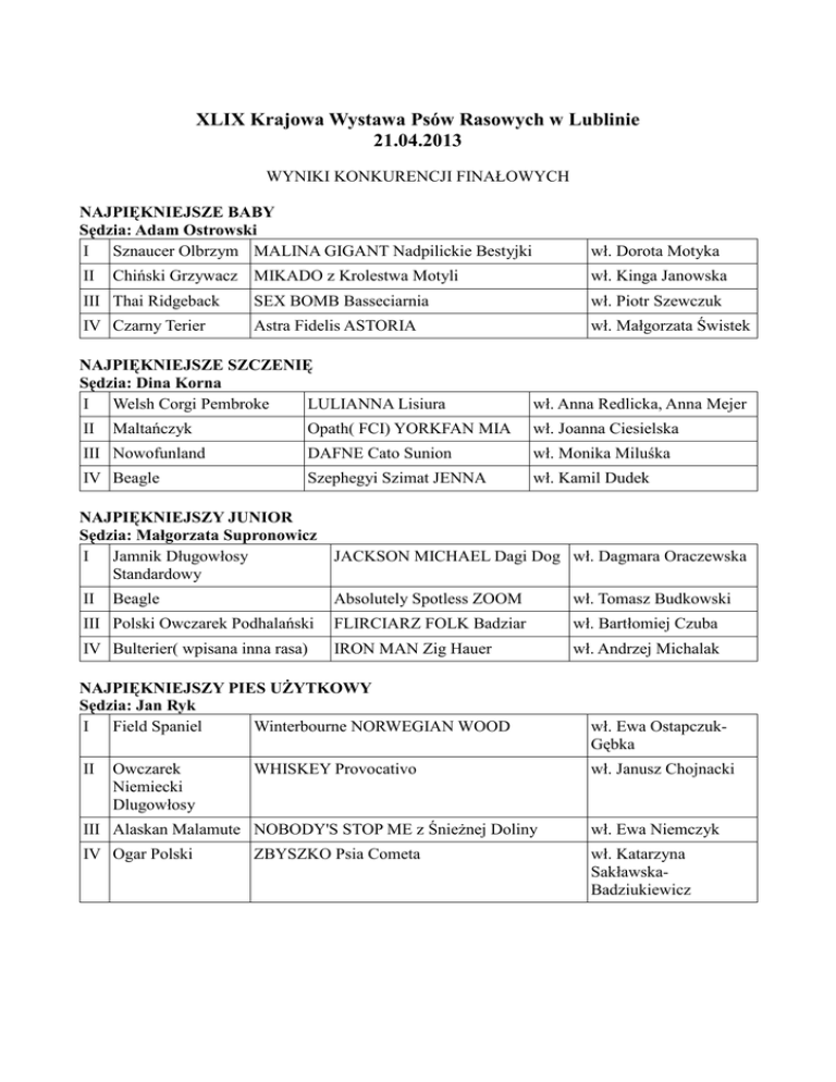 XLIX Krajowa Wystawa Psów Rasowych w Lublinie 21.04.2013 WYNIKI KONKURENCJI FINAŁOWYCH NAJPIĘKNIEJSZE BABY Sędzia: Adam Ostrowski I Sznaucer Olbrzym MALINA GIGANT Nadpilickie Bestyjki wł. Dorota Motyka II wł. Kinga Janowska Chiński Grzywacz MIKADO z Krolestwa Motyli III Thai Ridgeback SEX BOMB Basseciarnia wł. Piotr Szewczuk IV Czarny Terier Astra Fidelis ASTORIA wł. Małgorzata Świstek NAJPIĘKNIEJSZE SZCZENIĘ Sędzia: Dina Korna I Welsh Corgi Pembroke LULIANNA Lisiura wł. Anna Redlicka, Anna Mejer II Opath( FCI) YORKFAN MIA wł. Joanna Ciesielska III Nowofunland DAFNE Cato Sunion wł. Monika Miluśka IV Beagle Szephegyi Szimat JENNA wł. Kamil Dudek Maltańczyk NAJPIĘKNIEJSZY JUNIOR Sędzia: Małgorzata Supronowicz I Jamnik Długowłosy Standardowy II Beagle JACKSON MICHAEL Dagi Dog wł. Dagmara Oraczewska Absolutely Spotless ZOOM wł. Tomasz Budkowski III Polski Owczarek Podhalański FLIRCIARZ FOLK Badziar wł. Bartłomiej Czuba IV Bulterier( wpisana inna rasa) IRON MAN Zig Hauer wł. Andrzej Michalak NAJPIĘKNIEJSZY PIES UŻYTKOWY Sędzia: Jan Ryk I Field Spaniel Winterbourne NORWEGIAN WOOD II Owczarek Niemiecki Dlugowłosy WHISKEY Provocativo wł. Ewa OstapczukGębka wł. Janusz Chojnacki III Alaskan Malamute NOBODY'S STOP ME z Śnieżnej Doliny wł. Ewa Niemczyk IV Ogar Polski wł. Katarzyna SakławskaBadziukiewicz ZBYSZKO Psia Cometa NAJPIĘKNIEJSZY PIES RAS POLSKICH Sędzia: Tomasz Borkowski I Ogar Polski DRUŻBA Herbu Węszynos (FCI) II Polski Owczarek Podhalański III Polski Owczarek Nizinny wł. Magda Kuśmierczyk HAJNÓWKA-BUKSA Filos Iwona i Katarzyna Taraszkiewicz KROPLA Mościc Regina i Tomasz Szyszkowscy NAJPIĘKNIEJSZY WETERAN Sędzia: Adam Ostrowski I Seter Szkocki NARIS Wiart z Żurawiej Doliny Gordon wł. Ewa OstapczukGębka II wł. Slawomir Nowak Szpic Wilczy Friendly Malinako's BOLERO III Whippet BOKAMARO AMAZING BEAUTY Jesterland wł. Monika Sepołowicz IV Polski Owczarek Podhalański HAJNÓWKA-BUKSA Filos NAJPIĘKNIEJSZY PIES/SUKA ODDZIAŁU LUBLIN Sędzia: Elżbieta Chwalibóg I Siberian Husky MARGERITA Artico Encanto II Akita wł. Iwona, Katarzyna Taraszkiewicz wł. Bartosz Staszek TAKA CI YA Yeti Yeti wł. Sławomir Kaczmarski III Ogar Polski DRUZBA Herbu Węszynos( FCI) wł. Magda Kuśmierczyk IV Shih Tzu KAJETAN Pumilo wł. Agata Hunek NAJPIĘKNIEJSZA PARA HODOWLANA Sedzia: Małgorzata Supronowicz I Ogar Polski ZBYSZKO Psia Cometa ZACHCIANKA ZUZIA Psia Cometa II Flat Coated Retriever wł. Katarzyna SakławskaBadziukiewicz WILDEST SAM THE FIREFIGHTER z wł. Barbara i Katarzyna BasiSfory Lauzer WILDEST GEOREGETTE BURNT MUFFINS z BasiSfory III Angielski Springer NIGHT PRINCE Avendesora Spaniel COLD AND FIRE GORDIUS Avendesora Poland FCI wł. Monika Malitka, Justyna Kamińska wł. Bożena i Monika Malitka IV Ceskoslovensky Vlcak wł. Ewa Bednarska DECLAN Wilk z Polskiego Dworu ENID Wild z Polskiego Dworu ZWYCIĘZCA Grupy I Sędzia: Marek Czerniakowski I Owczarek Niemiecki WHISKEY Provocativo Długowłosy II Owczarek Szkocki Długowłosy JASIKA Preeminent Line Jasika wł. Janusz Chojnacki wł. Marzena Chwołka III Ceskoslovensky Vlcak DECLAN Wilk z Polskiego Dworu wł. Ewa Bednarska IV Owczarek Niemiecki FIGO Kierkis-Hof wł. Jacek Pazdan ZWYCIĘZCA Grupy II Sędzia: Anna Sekrecka I Czarny Terier DARGAS Drugelis wł. Adam Florczuk II Sznaucer Miniaturowy Made in Spain DUTY FREE Czarny wł. Aleksandra Lolo III Tosa CAMBELO Ja-Na wł. Wojciech Nowakowski IV Sznaucer Średni Pieprz i Sól WERA z Białeckiej Ostoi wł. Renata i Jacek Kurzyńscy Colacoda YOU OUGHT TO BE IN MOVIES wł. Raffaella Gammella ZWYCIĘZCA Grupy III Sędzia: Katarzyna Nitka I Bedlington Terrier II American Staffordshire BLUE PRINCESS BLOSSOMING ROSE Terrier Blossoming Rose wł. Łukasz Pietras III Yorkshire Terrier MY QUEEN Contenders wł. Iwona, Katarzyna Taraszkiewicz IV Czeski Terier Norkinstein ZOYDBERG wł. Sergey Afanasyev JACKSON MICHAEL Dagi Dog wł. Dagmara Oraczewska CHARLI CHAPLIN Credo wł. Mariusz Warda III Jamnik Miniaturowy Szorstkowłosy MERLIN Viva Zabajka wł. Małgorzata Bukiewicz IV Jamnik Króliczy Długowłosy CAKE Dagansta wł. Żaneta AraszkiewiczWęglińska ZWYCIĘZCA Grupy IV Sędzia: Paweł Ossak I Jamnik Standardowy Długowłosy II Jamnik Standardowy Szorstkowlosy ZWYCIĘZCA Grupy V Sędzia: Tomasz Borkowski I Siberian Husky MARGERITA Artico Encanto II Shiba wł. Bartosz Staszek AIKO NO MIU Go Shun'You Kensha III Alaskan Malamute NOBODY'S STOP ME z Śnieżnej Doliny wł. Ewa Niemczyk IV Szpic Miniaturowy Sasquehanna SOMETHING NICE Pomeranian wł. Magdalena i Ewelina Stanaszek ZWYCIĘZCA Grupy VI Sędzia: Anna Rajs I Beagle Absolutely Spotless ZOOM wł. Tomasz Budkowski II DRUŻBA Herbu Węszynos( FCI) wł. Magda Kuśmierczyk BASZA Skierbieszowskie Łąki wł. Zygmunt Nowogrodzki Ogar Polski III Gończy Słowacki IV Posokowiec Bawarski BRENDA z Babskiego Jaru FCI wł. Andrzej Kuna ZWYCIĘZCA Grupy VII Sędzia: Jan Ryk I Seter Angielski Fairray JETSET wł. Agata Bujnowicz II SAMIR Zielone Chrusty wł. Anna Dobrowolska III Pointer ARGOS z Halikarnasu wł. Bartosz Kopera IV Seter Irlandzki JOE COCKER z Arislandu wł. Aneta Komsta Wyżeł Weimarski Krótkowłosy ZWYCIĘZCA Grupy VIII Sędzia: Elżbieta Chwalibóg I Angielski Springer Spaniel NIGHT PRINCE Avendesora wł. Monika Malitka, Justyna Kamińska II BEN KENOBI da Real Corte Karolina Pastusiak III Angielski Cocker Spaniel Bleper's( FCI) GEORGIA wł. Magdalena Kudła IV Flat Coated Retriever Compendio ALL MY LOVING wl. Maja Kwiatek Labrador Retriever ZWYCIĘZCA Grupy IX Sędzia: Sara Nordin I Boston Terier FLORENCE Face to Face II Executive LEAGUE OF GENTELMEN wł. Danuta Szwedowska Pudel Toy wł. Agnieszka Bieniek III Chihuahua Krótkowłosy YAKUZA Capu Di Capi wł. Izabela Szwałek IV Pudel Duży wł. Justyna Targosińska FELISITY NON Scordar ZWYCIĘZCA Grupy X Sędzia: Jan Ryk BASANTI-INU Czatyrdach I Chart Afgański wł. Marzena Lorenc II Astra Bravissimo NICOLLETA wł. Magdalena Niewińska NAJID Orma