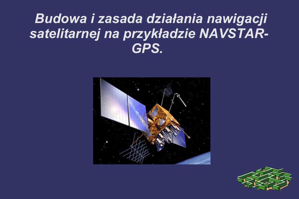 Budowa i zasada działania nawigacji satelitarnej na przykładzie NAVSTARGPS. Budowa nawigacji satelitarnej System składa się z 3 następujących segmentów: ➲ ➲ ➲ Segmentu kosmicznego Segmentu naziemnego Segmentu użytkownika Segment kosmiczny ➲ ➲ ➲ Składa się z 31 satelitów Poruszają się po orbitach kołowych o nachyleniu 63 stopni. Aby wyznaczyć pozycję na powierzchni Ziemi w układzie 2D wystarczą 3 satelity, w 3D minimum 4 Segment naziemny ➲ ➲ Składa się z 12 stacji monitorujących Główne Centrum kontroli (MCS) znajduje się w Colorado Springs Segment użytkownika ➲ ➲ ➲ ➲ Przykładowe funkcje odbiornika GPS określenie współrzędnych według różnych układów współrzędnych pomiar odległości wyznaczenie powierzchni (np. działki) track back Działanie NAVSTAR-GPS ➲ ➲ ➲ ➲ Wyznaczanie pozycji użytkownika polega na: Odebrania sygnałów z minimum 3 satelitów Wyznaczenia lokalizacji każdego z satelitów w chwili nadania depeszy nawigacyjnej Wyznaczanie czasu przebiegu sygnałów od każdego z satelitów do odbiornika Wyznaczenie pseudoodległości od każdego z satelitów Zastosowanie ➲ ➲ ➲ ➲ ➲ ➲ Budownictwo Geodezja Geologia Kartografia Meteorologia Policja