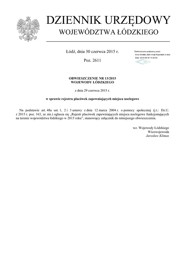 DZIENNIK URZĘDOWY WOJEWÓDZTWA ŁÓDZKIEGO Łódź, dnia 30 czerwca 2015 r. Elektronicznie podpisany przez: Anna Siwińska; Łódzki Urząd Wojewódzki w Łodzi Poz. 2611 Data: 2015-06-30 13:32:04 OBWIESZCZENIE NR 13/2015 WOJEWODY ŁÓDZKIEGO z dnia 29 czerwca 2015 r. w sprawie rejestru placówek zapewniających miejsca noclegowe Na podstawie art. 48a ust. 1, 2 i 3 ustawy z dnia 12 marca 2004 r. o pomocy społecznej (j.t.: Dz.U. z 2015 r. poz. 163, ze zm.) ogłasza się „Rejestr placówek zapewniających miejsca noclegowe funkcjonujących na terenie województwa łódzkiego w 2015 roku”, stanowiący załącznik do niniejszego obwieszczenia. wz. Wojewody Łódzkiego Wicewojewoda Jarosław Klimas Dziennik Urzędowy Województwa Łódzkiego –2– Poz. 2611 Załącznik do obwieszczenia nr 13/2015 Wojewody Łódzkiego z dnia 29 czerwca 2015 r. REJESTR PLACÓWEK ZAPEWNIAJĄCYCH MIEJSCA NOCLEGOWE FUNKCJONUJĄCYCH NA TERENIE WOJEWÓDZTWA ŁÓDZKIEGO W 2015 ROKU Liczba miejsc MężKobiety czyźni Nazwa placówki Adres Telefon E-mail 1 Noclegownie dla bezdomnych przy OPSCPRIUS Warszawska 10, 95-70 Aleksandrów Łódzki 42 712 17 71 [email protected] 2 Bełchatowskie Centrum Pomocy Bliźniemu „MONARMARKOT” ul. Czapliniecka 19B, 97-400 Bełchatów 3 Schronisko dla Bezdomnych ul. Czapliniecka 7A, 97-400 Bełchatów 698 886 121 [email protected] całodobowa, całoroczna 41 4 4 Towarzystwo Pomocy im. św. Brata Alberta Koło Brzezińskie ul. Św. Anny 35, 95-060 Brzeziny 796 880 079 [email protected] sezonowe schronisko dla bezdomnych mężczyzn, punkt wydawania żywności (Program PEAD) 14 0 5 Regionalny Ośrodek Pomocy w Dalikowie Dalików 146, powiat radomszczański 519 618 693 [email protected] 6 Regionalny Ośrodek Pomocy w Grabach Graby 14, 97-540 Gidle 34 327 23 45 Stowarzyszenie Pomocy „Przebudzenie” Fundacja Wzajemnej Pomocy „Alternatywa” Piaszcze Kol. 1, gmina Gomunice Karkoszki 22, 97-545 Gomunice Lp. 7 8 44 733 05 96 [email protected] Typ placówki Zasięg gminny hostel 10 70 4 30 Numer i data wydania zezwolenia Podmiot prowadzący OPS Stowarzyszenie MONATR Stowarzyszenie Rodzin Katolickich Archidiecezji Łódzkiej Oddział W Bełchatowie Towarzystwo Pomocy im. Św. Brata Alberta Zarząd Główny we Wrocławiu Inne informacje - Pracuje w okresie od listopada do kwietnia 12.03.2001 r. - możliwość zapewnienia schronienia, wyżywienia, odzieży, środków czystości - doraźna pomoc psychologiczna i prawna 2003 r. możliwość zapewnienia schronienia i odzieży, - zajęcia terapeutyczne KRS 0000069581 - Dom dla bezdomnych 10 11 Stowarzyszenie PANACEUM 17.07.2004 Regionalny Ośrodek Pomocy w Dalikowie prowadzony jest przez Stowarzyszenie PANACEUM w Radomsku [email protected] Ośrodek dla bezdomnych 23 22 Stowarzyszenie Centrum Pomocy „Panaceum” LD.XXNSREJ.K RS/21 582/12/967 z dnia 19.07.2004 r. _ 44 682 47 38 [email protected] Dom dla bezdomnych 35 0 Stowarzyszenie 19.10.2001 r. KRS0000052184 - 534 184 000 [email protected] Dom dla bezdomnych 7 3 Fundacja 4.04.2012 r. KRS0000104318 - Dziennik Urzędowy Województwa Łódzkiego –3– Poz. 2611 9 Dom dla Osób Bezdomnych i Najuboższych Klizin 18, 97-512 Kodrąb 44 681 96 96 [email protected] placówka całodobowa 30 10 Stowarzyszenie Monar Markot - placówka świadczy pomoc całodobową 10 Dom dla Osób Starszych Wola Malowana 22, 97-512 Kodrąb 44 681 93 07 [email protected] placówka całodobowa 10 10 Stowarzyszenie Monar Markot - placówka świadczy pomoc całodobową Miejski Ośrodek Pomocy Społecznej ul. Słowackiego 11, 95-050 Konstantynów Łódzki 5 Miejski Ośrodek Pomocy Społecznej uchwała nr III/24/98 Rady Miejskiej w Konstantynowie Łódzkim z dnia 18.12.1998 r. Zapewnia noclegi, posiłek, odzież, obuwie, środki czystości oraz pomoc socjalną. Schronisko zapewnia 3 miejsca dla dzieci do lat 3 12 Noclegownia Krośniewice ul. Łęczycka 15A/4 99-340 Krośniewice 24 25 23 54 [email protected] Ośrodek Wsparcia 3 0 Miejsko-Gminny Ośrodek Pomocy Społecznej w Krośniewicach uchwała nr XV/96/07 Rady Miejskiej w Krośniewicach z dnia 22.11.2007 r. - 13 Dom Noclegowy ul. Wyszyńskiego 11a 99-300 Kutno 24 253 43 90 [email protected] Dom Noclegowy 20 13 Miejski Ośrodek Pomocy Społecznej w Kutnie w strukturach MOPS - 14 Katolickie Stowarzyszenie Wychowania w Trzeźwości przy Sanktuarium Maryjnym w Głogowcu Głogowiec 10, 99-300 Kutno 24 254 23 80 [email protected] Stowarzyszenie - miejsca noclegowe 12 0 Stowarzyszenie brak - Punkt Pomocy Mieszkaniowej ul. Kaliska 6B, ul. Świętojańska 2/8, 99-400 Łowicz 11 15 16 Schronisko dla Bezdomnych Kobiet ul. Gałczyńskiego 7, 93-259 Łódź 42 211 19 67 792 792 412 42 647 03 33 [email protected] [email protected] [email protected] schronisko noclegownia schronisko 10 18 0 4 82 MOPS w Łowiczu Miejski Ośrodek Pomocy Społecznej w Łodzi uchwała Rady Miasta nr XCV/768/00 Zarządu Miasta Łowicza z dnia 1.08.2000 r. Zarządzenie nr 38/2012 Dyrektora MOPS w Łodzi z dnia 13 lipa 2012 roku w sprawie ustalania wewnętrznej struktury organizacyjnej, wchodzącego w skład MOPS w Łodzi III Wydziału Pracy Liczba miejsc 62 w systemie stacjonarnym oraz 20 w ramach miejsc noclegowych; Schronisko zapewnia pomoc i wsparcie w działaniach zmierzających do wychodzenia z bezdomności, pomoc w rozwiązywaniu trudnych spraw socjalnych i bytowych, poradnictwo i wsparcie Dziennik Urzędowy Województwa Łódzkiego –4– Poz. 2611 17 Schronisko dla Bezdomnych Mężczyzn ul. Szczytowa 11, 92-114 Łódź 42 679 31 35 [email protected] schronisko 48 18 Schronisko dla Bezdomnych Mężczyzn ul. Nowe Sady 94-102 Łódź 42 259 27 05 [email protected] schronisko 170 19 Schronisko dla Bezdomnych Kobiet ul. Kwietniowa 2/4, 93-361 Łódź 42 683 38 00 [email protected] schronisko 20 Schronisko dla Bezdomnych Mężczyzn ul. Szczytowa 11, 92-114 Łódź 42 679 31 35 [email protected] schronisko 21 Dom Samotnej Matki ul. Broniewskiego 1a, 93-162 Łódź 22 Specjalistyczny Ośrodek Wsparcia