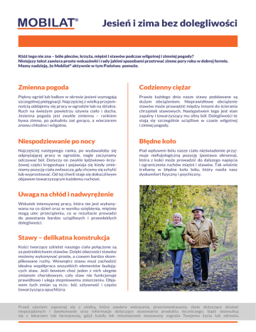 Jesień i zima bez dolegliwości Któż tego nie zna – bóle pleców, krzyża, mięśni i stawów podczas wilgotnej i zimniej pogody? Niniejszy tekst zawiera proste wskazówki i rady jakimi sposobami przetrwać zimne pory roku w dobrej formie. Mamy nadzieję, że Mobilat® aktywnie w tym Państwu pomoże. Zmienna pogoda Codzienny ciężar Piękny ogród lub balkon w okresie jesieni wymagają szczególnej pielęgnacji. Najczęściej z wielką przyjemnością oddajemy się pracy w ogrodzie lub na działce. Ruch na świeżym powietrzu ożywia ciało i ducha. Jesienna pogoda jest zwykle zmienna – rankiem bywa zimno, po południu zaś gorąco, a wieczorem znowu chłodno i wilgotno. Prawie każdego dnia nasze stawy poddawane są dużym obciążeniom. Nieprawidłowe obciążenie stawów może prowadzić między innymi do ścierania chrząstek stawowych. Następstwem tego jest stan zapalny i towarzyszący mu silny ból. Dolegliwości te stają się szczególnie uciążliwe w czasie wilgotnej i zimnej pogody. Niespodziewanie po nocy Błędne koło Najczęściej następnego ranka, po wydawałoby się odprężającej pracy w ogrodzie, nagle zaczynamy odczuwać ból. Dotyczy on zwykle lędźwiowo–krzyżowej części kręgosłupa i pojawiaja się kiedy zmieniamy pozycję ciała zwłaszcza, gdy chcemy się schylić lub wyprostować. Od tej chwili staje się dokuczliwym objawem towarzyszącym każdemu ruchowi. Pod wpływem bólu nasze ciało nieświadomie przyjmuje niefizjologiczną pozycję (postawa obronna), która z kolei może prowadzić do dalszego napięcia i ograniczenia ruchów mięśni i stawów. Tak właśnie trafiamy w błędne koło bólu, który nasila nasz dyskomfort fizyczny i psychiczny. Uwaga na chłód i nadwyrężenie Wskutek intensywnej pracy, która nie jest wykonywana na co dzień oraz w wyniku oziębienia, mięśnie mogą ulec przeciążeniu, co w rezultacie prowadzi do powstania bardzo uciążliwych i przewlekłych dolegliwości. Stawy – delikatna konstrukcja Kości tworzące szkielet naszego ciała połączone są za pośrednictwem stawów. Dzięki obecności stawów możemy wykonywać proste, a czasem bardzo skomplikowane ruchy. Wewnątrz stawu musi zachodzić idealna współpraca wszystkich elementów budujących staw. Jeśli bowiem choć jeden z nich ulegnie zmianom chorobowym, cały staw nie funkcjonuje prawidłowo i ulega stopniowemu zniszczeniu. Objawem tych zmian są m.in.: ból, sztywność i często towarzysząca opuchlizna. Przed użyciem zapoznaj się z ulotką, która zawiera wskazania, przeciwwskazania, dane dotyczące działań niepożądanych i dawkowanie oraz informacje dotyczące stosowania produktu leczniczego, bądź skonsultuj się z lekarzem lub farmaceutą, gdyż każdy lek niewłaściwie stosowany zagraża Twojemu życiu lub zdrowiu. Jesień i zima bez dolegliwości Pomóżcie Państwo swoim stawom Dzięki kilku prostym zasadom można chronić mięśnie, kości i stawy przed zmianami chorobowymi. Należy unikać zimna, wilgoci i przeciągów. • Zwłaszcza w okresie zimnych pór roku warto zadbać o wystarczająco ciepłe okrycia (szczególnie szyi, ramion i pleców). • Wygodne obuwie pozwoli uniknąć dolegliwości, szczególnie po długim spacerze. • Należy unikać jednostronnego obciążenia poszczególnych części ciała. Robić przerwy podczas wyczerpującej, żmudnej pracy (np. pracy w ogrodzie). Przeciążenie mięśni, ścięgien i więzadeł prowadzi do powstania stanów zapalnych. • Nie należy dźwigać ciężarów, a jeśli już, to unosząc je nie obciążając tylko jednej strony ciała (np. przenosić torby rozkładając ciężar na obie ręce). • Podczas siedzenia, leżenia i stania należy dbać o właściwą postawę ciała. Wadliwa postawa może prowadzić do uszkodzenia narządu ruchu. • Regularne ćwiczenia ruchowe np. pływanie, jazda na rowerze i gimnastyka wpływają na poprawę postawy ciała i prawidłowe funkcjonowanie narządu ruchu. • Pamiętaj, aby pozbyć się nadwagi. Zadbaj o urozmaicony jadłospis, bogaty w witaminy oraz składniki będące źródłem energii. • Przy pierwszych oznakach przeciążenia lub uszkodzenia mięśni, bólach pleców i dolegliwościach stawowych należy skorzystać z fachowej porady medycznej, a co za tym idzie pomocy farmakologicznej. Jednym z zalecanych leków w miejscowym leczeniu bólu i stanu zapalnego jest Mobilat®, trójskładnikowy preparat występujący w postaci maści i żelu. Substancje lecznicze zawarte w preparacie Mobilat® wnikają w zmienione chorobowo tkanki i wywierają miejscowe działanie: • przeciwbólowe • przeciwzapalne • przeciwobrzękowe i regeneracyjne Żyj nie! aktyw Preparat Mobilat® w postaci maści i żelu jest dostępny w aptekach bez recepty. Mobilat® (0,2 g+1,0 g+2,0 g)/100 g maść, Mobilat® (0,2 g+1,0 g+2,0 g)/100 g żel. Skład jakościowy i ilościowy: 100 g maści/żelu zawiera: mukopolisacharydowy polisiarczan 0,2 g, ekstrakt z kory nadnerczy 1,0 g, kwas salicylowy 2,0 g. Substancje pomocnicze m.in. glikol propylenowy 8,0 g (Mobilat® żel) - patrz także pkt. 6.1 ChPL. Wskazania do stosowania: leczenie pourazowych i miejscowych stanów zapalnych, choroby zwyrodnieniowej stawów i tkanek okołostawowych. Miejscowe, wspomagające leczenie zmienionych zapalnie stawów w chorobach reumatycznych (Mobilat® maść). Leczenie pourazowych stanów zapalnych stawów i krwiaków. Leczenie bólów występujących podczas ruchu i w stanach przeciążeniowych mięśni i ścięgien (Mobilat® żel). Przeciwwskazania: nadwrażliwość na substancje czynne lub na którąkolwiek substancję pomocniczą tego leku. Lek może być stosowany jedynie po wnikliwej analizie korzyści do ryzyka w przypadkach: ospy wietrznej, reakcji poszczepiennej, grzybiczych lub bakteryjnych zakażeniach skóry, lub innych swoistych zmianach skórnych w obszarze podawania leku (np. zmiany gruźlicze, kiła), u dzieci oraz w przypadku przedłużonego stosowania l