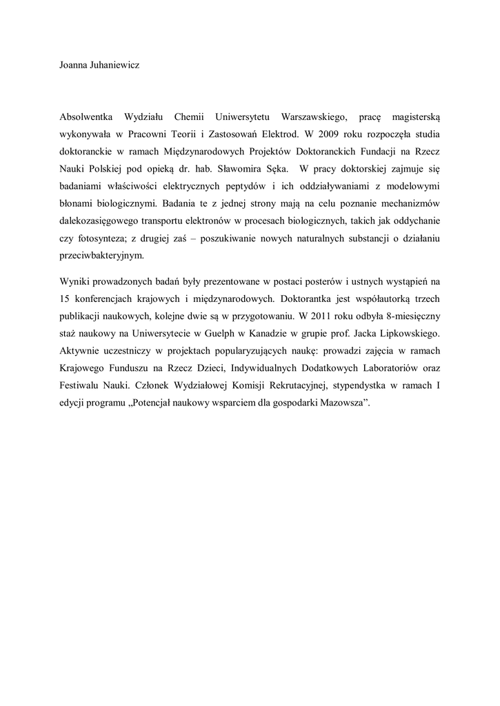 Joanna Juhaniewicz Absolwentka Wydziału Chemii Uniwersytetu Warszawskiego, pracę magisterską wykonywała w Pracowni Teorii i Zastosowań Elektrod. W 2009 roku rozpoczęła studia doktoranckie w ramach Międzynarodowych Projektów Doktoranckich Fundacji na Rzecz Nauki Polskiej pod opieką dr. hab. Sławomira Sęka. W pracy doktorskiej zajmuje się badaniami właściwości elektrycznych peptydów i ich oddziaływaniami z modelowymi błonami biologicznymi. Badania te z jednej strony mają na celu poznanie mechanizmów dalekozasięgowego transportu elektronów w procesach biologicznych, takich jak oddychanie czy fotosynteza; z drugiej zaś – poszukiwanie nowych naturalnych substancji o działaniu przeciwbakteryjnym. Wyniki prowadzonych badań były prezentowane w postaci posterów i ustnych wystąpień na 15 konferencjach krajowych i międzynarodowych. Doktorantka jest współautorką trzech publikacji naukowych, kolejne dwie są w przygotowaniu. W 2011 roku odbyła 8-miesięczny staż naukowy na Uniwersytecie w Guelph w Kanadzie w grupie prof. Jacka Lipkowskiego. Aktywnie uczestniczy w projektach popularyzujących naukę: prowadzi zajęcia w ramach Krajowego Funduszu na Rzecz Dzieci, Indywidualnych Dodatkowych Laboratoriów oraz Festiwalu Nauki. Członek Wydziałowej Komisji Rekrutacyjnej, stypendystka w ramach I edycji programu „Potencjał naukowy wsparciem dla gospodarki Mazowsza”.