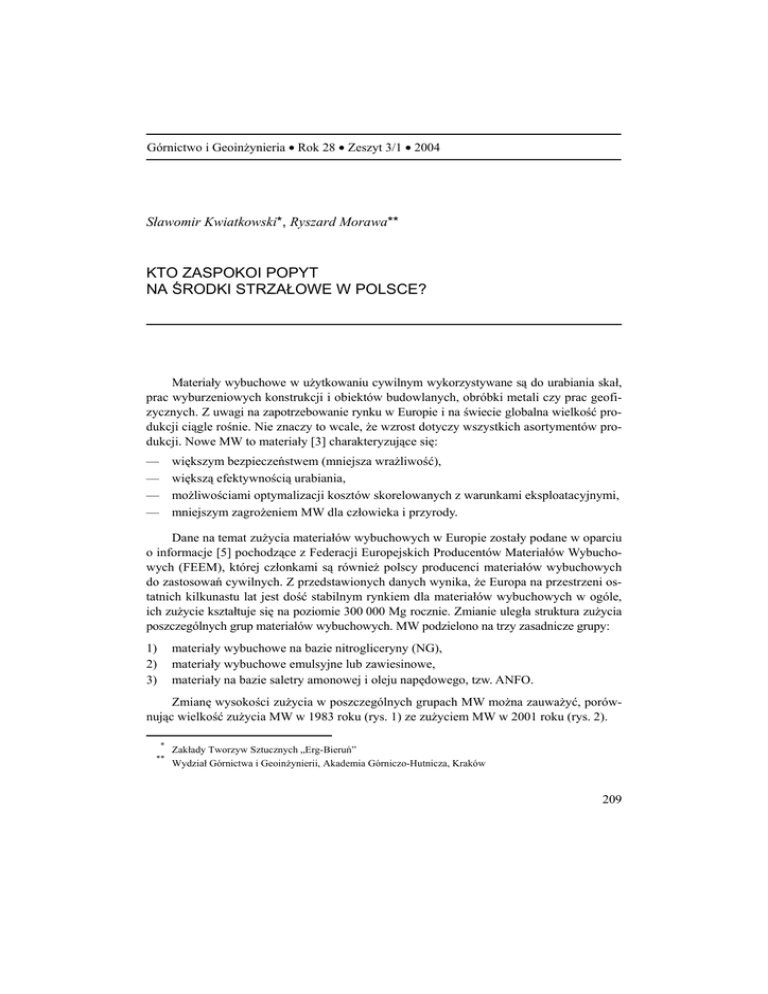 Górnictwo i Geoinżynieria • Rok 28 • Zeszyt 3/1 • 2004 Sławomir Kwiatkowski*, Ryszard Morawa** KTO ZASPOKOI POPYT NA ŚRODKI STRZAŁOWE W POLSCE? Materiały wybuchowe w użytkowaniu cywilnym wykorzystywane są do urabiania skał, prac wyburzeniowych konstrukcji i obiektów budowlanych, obróbki metali czy prac geofizycznych. Z uwagi na zapotrzebowanie rynku w Europie i na świecie globalna wielkość produkcji ciągle rośnie. Nie znaczy to wcale, że wzrost dotyczy wszystkich asortymentów produkcji. Nowe MW to materiały [3] charakteryzujące się: — — — — większym bezpieczeństwem (mniejsza wrażliwość), większą efektywnością urabiania, możliwościami optymalizacji kosztów skorelowanych z warunkami eksploatacyjnymi, mniejszym zagrożeniem MW dla człowieka i przyrody. Dane na temat zużycia materiałów wybuchowych w Europie zostały podane w oparciu o informacje [5] pochodzące z Federacji Europejskich Producentów Materiałów Wybuchowych (FEEM), której członkami są również polscy producenci materiałów wybuchowych do zastosowań cywilnych. Z przedstawionych danych wynika, że Europa na przestrzeni ostatnich kilkunastu lat jest dość stabilnym rynkiem dla materiałów wybuchowych w ogóle, ich zużycie kształtuje się na poziomie 300 000 Mg rocznie. Zmianie uległa struktura zużycia poszczególnych grup materiałów wybuchowych. MW podzielono na trzy zasadnicze grupy: 1) 2) 3) materiały wybuchowe na bazie nitrogliceryny (NG), materiały wybuchowe emulsyjne lub zawiesinowe, materiały na bazie saletry amonowej i oleju napędowego, tzw. ANFO. Zmianę wysokości zużycia w poszczególnych grupach MW można zauważyć, porównując wielkość zużycia MW w 1983 roku (rys. 1) ze zużyciem MW w 2001 roku (rys. 2). * ** Zakłady Tworzyw Sztucznych „Erg-Bieruń” Wydział Górnictwa i Geoinżynierii, Akademia Górniczo-Hutnicza, Kraków 209 Rys. 1. Struktura zużycia przemysłowych MW w Europie w 1983 roku Rys. 2. Struktura zużycia przemysłowych MW w Europie w 2001 roku W ciągu ostatnich kilkunastu lat odnotowano wyraźny spadek zużycia materiałów wybuchowych na bazie nitrogliceryny, z około 120 000 Mg w 1983 roku do nieco ponad 40 000 Mg w 2001 roku. Zakłada się, że tendencja spadkowa utrzyma się jeszcze przez kilka lat, aż do ustalenia się pewnego poziomu — około 30 000÷35 000 Mg rocznie. Poziom ten będzie utrzymywany głównie przez sypkie materiały wybuchowe o specjalnym przeznaczeniu, do zastosowania w warunkach zagrożenia wybuchem metanu i pyłu węglowego (metanity, karbonity), oraz dynamity, używane wszędzie tam, gdzie zastąpienie ich innymi materiałami nie jest możliwe ze względu na warunki eksploatacji lub też z powodu specyficznych parametrów strzałowych. 210 Główną przyczyną zmniejszania się udziału tej grupy materiałów wybuchowych w ogólnej strukturze zużycia jest zastępowanie ich bardziej bezpiecznymi w stosowaniu i bardziej ekologicznymi emulsyjnymi materiałami wybuchowymi [3] o zbliżonych parametrach strzałowych. Bezpieczeństwo i możliwość wykorzystywania tych materiałów na miejscu prowadzenia robót strzałowych pozwoliły także na zmechanizowanie ich załadunku do otworów strzałowych. Znajduje to odzwierciedlenie w danych na temat udziału emulsyjnych materiałów wybuchowych w ogólnej strukturze zużycia (rys. 1 i 2). W 1983 roku 17%, tj. około 50 000 Mg całkowitego zużycia, stanowiły emulsyjne/zawiesinowe materiały wybuchowe, a w 2001 roku udział ten wzrósł do 110 000 Mg i stanowi 37%. Jeśli weźmie się pod uwagę, że zużycie ANFO na przestrzeni lat 1983–2001 wzrosło o 4%, to widać wyraźnie, że główne przyczyny zmian wywołane są zastępowaniem materiałów wybuchowych na bazie nitrogliceryny emulsyjnymi/zawiesinowymi materiałami wybuchowymi. Tendencje zastępowania dynamitów emulsyjnymi materiałami wybuchowymi spowodowane są przede wszystkim zaletami, jakie posiadają emulsyjne materiały wybuchowe: — wyższy poziom bezpieczeństwa, — większe możliwości zastosowań (materiały nabojowane i luzem), — możliwość wytwarzania na miejscu prowadzonych robót strzałowych oraz mechanizacji załadunku, — bardzo dobra możliwość korygowania parametrów strzałowych, — konkurencyjność ceny w porównaniu do cen dynamitów. ANFO stanowi obecnie najtańszy i najczęściej wykorzystywany typ materiału wybuchowego stosowanego do urabiania skał i wydobywania surowców mineralnych. Jego zasadniczą wadą jest brak wodoodporności. Niemniej jednak wiodące firmy europejskie i światowe oferują już tzw. wodoodporne ANFO. Jest to odmiana ANFO zawierająca specjalne dodatki, nadające temu materiałowi cechę odporności na działanie wody przez pewien określony czas. Pozwala to na zastosowanie go nawet w warunkach zawodnionych otworów (po uprzednim wypompowaniu wody lub ładowaniu MW pod ciśnieniem od dna otworu) [4]. Podobny kierunek w zużyciu materiałów wybuchowych zauważa się na rynku amerykańskim. W raporcie opracowanym przez IME (Institute of Makers of Explosives) na temat zużycia materiałów wybuchowych w 2002 roku w zależności od ich typów można odnaleźć następujące informacje: Materiały wybuchowe do stosowania w specjalnych warunkach: 1 360 Mg Inne materiały wybuchowe na bazie NG: 38 100 Mg Środki strzałowe i utleniacze1: 2 470 000 Mg Razem około: 1 2 510 000 Mg W tej grupie, zgodnie z klasyfikacją przyjętą przez IME, znajdują się materiały wybuchowe typu ANFO, zawiesinowe, wodne żele, emulsyjne zarówno w postaci nabojów, jak i luzem. 211 Na rysunku 3 przedstawiono zużycie przemysłowych materiałów wybuchowych w Stanach Zjednoczonych na przestrzeni lat 1993–2002. Rys. 3. Zużycie przemysłowych materiałów wybuchowych w USA w latach 1993–2002 Obecnie najlepiej rozwijającymi się rynkami dla materiałów wybuchowych są Azja i Afryka. Międzynarodowe firmy, takie jak ORICA, UEE, Dyno, zainwestowały w bu