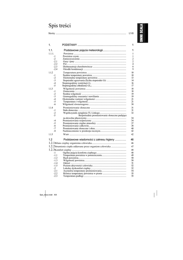 Spis treści Skróty .................................................................................................................. 1. 1.1. LVII PODSTAWY ............................................................... 1 Podstawowe pojęcia meteorologii.............................. 1 1 1 2 2 4 8 9 10 10 13 14 16 17 18 18 19 19 21 21 30 31 31 32 1.1.5 Powietrze ..................................................................................... Powietrze czyste ............................................................................ Zanieczyszczenia .......................................................................... Gazy i pary ................................................................................... Pył................................................................................................. Drobnoustroje chorobotwórcze ...................................................... Ośrodki kondensacji ..................................................................... Temperatura powietrza ............................................................... Średnie temperatury powietrza ...................................................... Ekstremalne temperatury powietrza .............................................. Stopniodni ogrzewania (liczba stopniodni Gt) ................................ Stopniogodziny wentylacji GL.................................................................................................... Stopniogodziny chłodzenia GLK.................................................................................................. Wilgotność powietrza ................................................................. Oznaczenia ................................................................................... Średnia wilgotność ........................................................................ Gramogodziny osuszania i nawilżania ........................................... Ekstremalne wartości wilgotności ................................................. Temperatura i wilgotność.............................................................. Wilgotność równowagowa ............................................................ Promieniowanie słoneczne ......................................................... Stała słoneczna .............................................................................. Współczynnik zamglenia TL Linkego........................................... Bezpośrednie promieniowanie słoneczne padające na dowolne płaszczyzny................................................................ Promieniowanie rozproszone ........................................................ Promieniowanie cieplne atmosfery ................................................ Promieniowanie całkowite............................................................ Promieniowanie słoneczne i okna................................................... Nasłonecznienie w przekroju rocznym.......................................... Wiatr ............................................................................................ 34 34 37 38 40 42 42 1.2 Podstawowe wiadomości z zakresu higieny .............. 46 1.2.1Bilans cieplny organizmu człowieka........................................................ 1.2.2Strumienie ciepła oddawane przez organizm człowieka ........................ 1.2.3Komfort cieplny ........................................................................................ 46 47 48 48 49 50 50 51 52 52 54 55 55 1.1.1. -1 -2 -2.1 -2.2 -2.3 -2.4 1.1.2 -1 -2 -3 -4 -5 1.1.3 -1 -2 -3 -4 -5 -6 1.1.4 -1 -2 -3 -4 -5 -6 -7 -8 -1 -1.1 -1.2 -1.3 -1.4 -1.5 -2 -2.1 -2.2 -2.3 Spis_tresci.indd XIX Ogólne pojęcia komfortu cieplnego................................................ Temperatura powietrza w pomieszczeniu....................................... Ruch powietrza............................................................................. Wilgotność powietrza.................................................................... Odzież .......................................................................................... Poziom aktywności człowieka....................................................... Lokalny dyskomfort cieplny.......................................................... Asymetria temperatury promieniowania........................................ Różnice temperatury powietrza w pionie ...................................... Temperatura podłogi .................................................................... XX Spis treści -2.4 -3 -4 -4.1 -4.2 -4.3 -4.4 -5 -5.1 -5.2 -5.3 -5.4 1.2.4 -1 -2 -3 -4 -5 -6 -7 -8 -9 -10 -11 1.2.5 -1 -1.1 -1.2 -2 -2.1 -2.2 -2.3 -2.4 -3 -3.1 -3.2 -3.3 -3.4 -4 -5 Zjawiska przeciągu........................................................................ Pomiary warunków cieplnych w pomieszczeniu............................ Wzajemne oddziaływania innych wielkości z komfortem cieplnym....................................................................................... Akustyka, hałas.............................................................................. Światło/oślepianie........................................................................... Jakość i wilgotność powietrza........................................................ Inne czynniki wpływające na komfort cieplny................................ Pozostałe czynniki wpływające na zdrowie i dobre samopoczucie .................................................................... Zapylenie powietrza ...................................................................... Zanieczyszczenia powietrza w pomieszczeniach ........................... Pola elektryczne i magnetyczne ..................................................... Promieniowanie jonizujące i radioaktywność.................................. Jakość powietrza wewnątrz pomieszczenia................................ Definicje ............