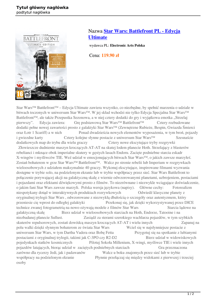 Tytuł główny nagłówka podtytuł nagłówka Nazwa Star Wars: Battlefront PL - Edycja Ultimate wydawca PL: Electronic Arts Polska Cena: 119.90 zł Star Wars™ Battlefront™ – Edycja Ultimate zawiera wszystko, co niezbędne, by spełnić marzenia o udziale w bitwach toczonych w uniwersum Star Wars™. W jej skład wchodzi nie tylko Edycja Specjalna Star Wars™ Battlefront™, ale także Przepustka Sezonowa, a w niej cztery dodatki do gry i wyjątkowa emotka „Strzelaj pierwszy”. Edycja zawiera: Grę podstawową Star Wars™ Battlefront™ Cztery rozbudowane dodatki pełne nowej zawartości prosto z galaktyki Star Wars™ (Zewnętrzne Rubieże, Bespin, Gwiazda Śmierci oraz Łotr 1 Scariff) a w nich Ponad dwadzieścia nowych elementów wyposażenia, w tym broń, pojazdy i gwiezdne karty Cztery kolejne słynne postacie z uniwersum Star Wars™ Szesnaście dodatkowych map do trybu dla wielu graczy Cztery nowe ekscytujące tryby rozgrywki Złowieszcze dudnienie maszyn kroczących AT-AT na skutej lodem planecie Hoth. Strzelający z blasterów rebelianci i mknące obok imperialne skutery w gęstych lasach Endoru. Zacięte podniebne starcia eskadr X-wingów i myśliwców TIE. Weź udział w emocjonujących bitwach Star Wars™, o jakich zawsze marzyłeś. Zostań bohaterem w grze Star Wars™ Battlefront™. Walcz po stronie rebelii lub Imperium w rozgrywkach wieloosobowych z udziałem maksymalnie 40 graczy. Wykonuj ekscytujące, inspirowane filmami wyzwania dostępne w trybie solo, na podzielonym ekranie lub w trybie współpracy przez sieć. Star Wars Battlefront to połączenie porywającej akcji na galaktyczną skalę z wiernie odwzorowanymi planetami, uzbrojeniem, postaciami i pojazdami oraz efektami dźwiękowymi prosto z filmów. To niezrównane i niezwykle wciągające doświadczenie, o jakim fani Star Wars zawsze marzyli. Polska wersja językowa (napisy). Główne cechy: Fotorealizm niespotykany dotąd w interaktywnych produktach rozrywkowych Odwiedź klasyczne planety z oryginalnej trylogii Star Wars , odwzorowane z niezwykłą dbałością o szczegóły oraz autentyzmem, który przeniesie cię wprost do odległej galaktyki Przekonaj się, jak dzięki wykorzystywanej przez DICE technice zwanej fotogrametrią na nowo ożywają modele z filmów Star Wars Starcia lądowe na galaktyczną skalę Bierz udział w wieloosobowych starciach na Hoth, Endorze, Tatooine i na niezbadanej planecie Sullust. Zasiądź za sterami szerokiego wachlarza pojazdów, w tym szybkich skuterów repulsorowych, zostań dowódcą maszyn kroczących AT-AT i wielu innych Zapanuj na polu walki dzięki słynnym bohaterom ze świata Star Wars Wciel się w najsłynniejsze postacie z uniwersum Star Wars, w tym Dartha Vadera oraz Bobę Fetta Przygotuj się na spotkanie z lubianymi postaciami z oryginalnej trylogii, takimi jak C-3PO czy R2-D2 Bierz udział w widowiskowych pojedynkach statków kosmicznych Pilotuj Sokoła Millenium, X-wingi, myśliwce TIE i wiele innych pojazdów latających, biorąc udział w zaciętych podniebnych starciach Gra przeznaczona zarówno dla rycerzy Jedi, jak i padawanów Walcz u boku znajomych przez sieć lub w trybie współpracy na podzielonym ekranie Płynnie przełączaj się między widokami z pierwszej i trzeciej osoby 1/2 Tytuł główny nagłówka podtytuł nagłówka Nazwa Wartość Wydawca PL EA Digital Illusions/EA DICE Data premiery 18.11.2016 Producent Tryb gry Kategoria wiekowa Wersja językowa Format Electronic Arts Polska Single / Multiplayer 16+ PL (napisy) DVD 2/2