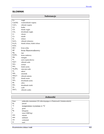 Słownik SŁOWNIK Substancje Ca Ca(OH) CaCl2 Cd CO CO2 Cr Cu Fe FeCl2 Fe2O3 FeOx HCl HF Hg H2SO4 Mn N2 NaCl NO2NOx Na2SO4 Ni NH3 NH4Cl NO NO2 Pb SO2 Zn ZnCl2 wapń wodorotlenek wapnia chlorek wapnia kadm tlenek węgla dwutlenek węgla chrom miedź żelazo chlorek żelazawy tlenek żelaza, tlenki żelaza kwas solny kwas fluorowodorowy rtęć kwas siarkowy mangan azot cząsteczkowy chlorek sodu azotyn tlenki azotu siarczan sodu nikiel amoniak chlorek amonu tlenek azotu dwutlenek azotu ołów dwutlenek siarki cynk chlorek cynku Jednostki Euro Pa °C g kg t min mm cm m jednostka monetarna UE (obowiązująca w Państwach Członkowskich) pascal temperatura wyrażana w °C gram kilogram tona (1000 kg) minuta milimetr centymetr metr Przetwórstwo żelaza i stali 522 Słownik m2 m3 Nm3 KWh kWth J s h d y t/d t/y bar l vol% Mt/a metr kwadratowy metr sześcienny m3 gazu suchego w temp. 273 K i ciśnieniu 101,3 Pa kilowatogodzina kW określający moc termiczną dżul sekunda godzina dzień rok ton/dzień ton/rok 105 Pa litr procent objętościowy milion ton na rok Przedrostki jednostek pod i wielokrotnych mikro 10-6 mili 10-3 centy 10-2 kilo 103 mega 106 giga 109 µ m c k M G Skróty ∅ BAT BF BFG BOF BREF CC COD COG CR EIPPCB EP € or EUR FF FMP Average -wartość średnia Best available technique as defined in Article 2(11) of the IPPC Directive -Zgodnie z art.2 ust.11 dyrektywy IPPC -najlepsze dostępne techniki Blast Furnace - wielki piec Blast Furnace Gas - gaz wielkopiecowy Basic Oxygen Furnace - zasadowy konwertor tlenowy BAT reference document - dokument odnoszący się do BAT Continuous coating/continuous coated - ciągłe powlekanie /powłoka ciągła Chemical oxygen demand indicating the amount of chemically oxidisable organic matter in waste waters – ChZT - chemiczne zapotrzebowanie tlenu określające ilość chemicznie utlenialnych substancji organicznych znajdujących się w ściekach Coke Oven Gas -gaz koksowniczy Cold rolling/cold rolled - walcowanie na zimno /zimno walcowany European Integrated Pollution Prevention and Control Bureau -Europejskie Biuro IPPC w Sewilli Electrostatic Precipitator - filtr elekrostatyczny European currency unit - jednostka monetarna Unii Europejskiej Fabric Filter - filtr tkaninowy Ferrous metals processing - przetwórstwo żelaza i stali Przetwórstwo żelaza i stali 523 Słownik HC HNx gas HOWAQ HR HTC H2O2 IEF n.a. NG PCDD/F ppm SCR SNCR SS TSS TWG VOC Hydrocarbon - weglowodór Nitrogen-hydrogen mixture - mieszanina azotu i wodoru Hot water quench - hartowanie w gorącej wodzie Hot rolling/hot rolled - walcowanie na gorąco / gorąco walcowany Hourly technical capacity -technicznie określona wydajność godzinowa Hydrogen peroxide - nadtlenek wodoru Information exchange forum - forum wymiany informacji Not available – niedostępne lub, w zależności od kontekstu, nie dotyczy Natural gas - gaz ziemny Polychlorinated Dibenzo-p-Dioxins/Furans -Polichlorowane dibenzodioksyny/dibenzofurany Parts per million - ilość części na milion -ppm Selective -catalytic reduction - selektywna redukcja katalityczna Selective non-catalytic reduction - selektywna redukcja niekatalityczna Suspended solids (in waste water) - zawiesina stała / w ściekach / Total suspended solids (in wastewater)- całkowita zawiesina stała /w ściekach Technical Working Group – Techniczna Grupa Robocza Volatile organic compounds - Lotne Związki Organiczne Definicje użytych pojęć Mixed acid/ Mixed liquor HCl stosowany do trawienia stali i do usuwania powłoki galwanicznej ze stali Mixed acid Mieszanina kwasu azotowego i fluorowodorowego stosowana do trawienia stali nierdzewnej. Stripping Usuwanie powłoki cynkowej przez zanurzenie w kwasie (HCl) Przetwórstwo żelaza i stali 524 Bibliografia BIBLIOGRAFIA [ABAG] ABAG (Magdalena Sordo, Dominik Toussaint), 1993 Vermeidung von Abfällen durch abfallarme Produktionsverfahre – Feuerverzinkereien [ABAG-BIO] Kunz, P. 1996 Reststoffvermeidung durch ein biologisches Entfettungsspülbad in einer Feuerverzinkerei [ABAG-Flux] Frauenhofer Institut, ISI (D) Toussaint, D.; Rotter, U. 1995 Aufbereitung von Altfluxen aus Feuerverzinkereien [AC-Kolloq] J. Schultes, R. Degel Moderne Prozeβroute zur Erzeugung neuer Flachprodukte (Vortrag 23) 12. Aachener Stahl Kolloquium 19.-20.6.1997 [algoma.com] Strona internetowa, 1998 Direct Strip Production Complex (DSPC) [Bed-95] Beddows & Company, 1995 The EU Cold Rolled Strip Industry [Bekaert94] N.V. Bekaert S.A., 1994 Company Information on Wire Technology [Bekaert98] Bekaert, Bert Gielen, 1998 Bert Gielen – przekazana osobiście informacja dot. Celu i krótkiego opisu procesów w przemyśle walcówki [BG-Com] Kontakt osobisty: P. Gielen, Bekaert [BGielen 31.3] Kontakt osobisty: P. Gielen, Bekaert [BSW-WWT-90] Prof. Dr. Schwandtner, 1990 BSW. Abwasserbehandlung (Stand Mai 1990) Badische Stahlwerke Aktiengesellschaft [CC-11/99] Przetwórstwo żelaza i stali 525 Bibliografia Informacja od CC-Shadow Group. EUROFER [CEAM] Centro de Estudios y Asesoramiento Metalúrgico, 1995 La fabricación de tubos de acero en la Comunidad (Steel Tube Production in the Community) [CET] Comité Européen de la Tréfilerie, 1998 The european steel wire-drawing industry: description [CET-BAT] Kontakt osobisty: P. Bert Gielen [Choice-Barr] G. Choice, N. Barr A continuous electrolytic preflux treatment unit [CITEPA] CITEPA, 1994 Technical Note on BAT to reduce emissions of pollutants into the air from hot and cold rolling mills in iron and steel industry [Com A] Komentarze do 1. projektu FMP z Austrii [Com2 A] Komentarze do 2. projektu FMP z Austrii [Com2 B] Komentarze do 2. projektu FMP z Belgii [Com BG] Komentarze do 1. projektu FMP: Bert Gielen [Com2 BG] Komentarze do 2. projektu FMP: Bert Gielen [Com BG2] Komentarze do 1. projektu FMP: Bert Gielen, dodatkowe [Com BG3] Komentarze do 1. projektu FMP: Bert Gielen, dodatkowe [Com-CC-2] Komentarze do 1. projektu FMP: Continuous Coating Shadow Group [Com2 CC] Komentarze 
