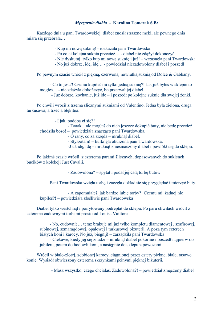 Męczarnie diabła - Karolina Tomczak 6 B: KaŜdego dnia u pani Twardowskiej diabeł znosił straszne męki, ale pewnego dnia miara się przebrała… - Kup mi nową suknię! - rozkazała pani Twardowska - Po co ci kolejna suknia przecieŜ… - diabeł nie zdąŜył dokończyć - Nie dyskutuj, tylko kup mi nową suknię i juŜ! – wrzasnęła pani Twardowska - No juŜ dobrze, idę, idę… - powiedział niezadowolony diabeł i poszedł Po pewnym czasie wrócił z piękną, czerwoną, nowiutką suknią od Dolce & Gabbany. - Co to jest?! Czemu kupiłeś mi tylko jedną suknię?! Jak juŜ byłeś w sklepie to mogłeś… - nie zdąŜyła dokończyć, bo przerwał jej diabeł - JuŜ dobrze, kochanie, juŜ idę – i poszedł po kolejne suknie dla swojej Ŝonki. Po chwili wrócił z trzema ślicznymi sukniami od Valentino. Jedna była zielona, druga turkusowa, a trzecia błękitna. - I jak, podoba ci się?! - Taaak…ale mogłeś do nich jeszcze dokupić buty, nie będę przecieŜ chodziła boso! – powiedziała znacząco pani Twardowska. - O rany, co za zrzęda – mruknął diabeł. - Słyszałam! – burknęła oburzona pani Twardowska. -J uŜ idę, idę – mruknął zniesmaczony diabeł i powlókł się do sklepu. Po jakimś czasie wrócił z czterema parami ślicznych, dopasowanych do sukienek bucików z kolekcji Just Cavalli. - Zadowolona? – spytał i podał jej całą torbę butów Pani Twardowska wzięła torbę i zaczęła dokładnie się przyglądać i mierzyć buty. - A zapomniałeś, jak bardzo lubię torby?! Czemu mi Ŝadnej nie kupiłeś?! – powiedziała złośliwie pani Twardowska Diabeł tylko westchnął i poirytowany podreptał do sklepu. Po paru chwilach wrócił z czterema cudownymi torbami prosto od Louisa Vuittona. - No, cudownie… teraz brakuje mi juŜ tylko kompletu diamentowej , szafirowej, rubinowej, szmaragdowej, opalowej i turkusowej biŜuterii. A poza tym czterech białych koni i karocy. No juŜ, biegnij! – zarządziła pani Twardowska - Ciekawe, kiedy jej się znudzi – mruknął diabeł pokornie i poszedł najpierw do jubilera, potem do hodowli koni, a następnie do sklepu z powozami. Wrócił w biało-złotej, zdobionej karocy, ciągnionej przez cztery piękne, białe, rasowe konie. Wysiadł obwieszony czterema skrzynkami pełnymi pięknej biŜuterii. - Masz wszystko, czego chciałaś. Zadowolona?! – powiedział zmęczony diabeł 2 - Tak! - pisnęła z zachwytem pani Twardowska – A teraz musisz mi doradzić w co się ubrać, jak umalować i jaką biŜuterię załoŜyć. Idziemy do teatru – powiedziała podekscytowana. Zmęczony diabeł nie miał nawet siły protestować, więc westchnął tylko i podreptał za panią Twardowską do pokoju. Pani Twardowska wskoczyła do łazienki i po paru minutach wyszła w zielonej sukni. - I jak? - No…dobrze… - mruknął diabeł z obrzydzeniem -Hmm… niewygodnie mi, idę po czerwoną – stwierdziła i poszła się przebrać Gdy wróciła w czerwonej sukni, zastała diabła śpiącego na kanapie. -Mefistofel! Wstawaj natychmiast, jesteś wyjątkowo niepomocny! Przydałbyś się choć raz! – wrzasnęła oburzona pani Twardowska -Aaa… - jękną zaspany diabeł – Ta baba mnie zamęczy! -A jak ci się podobam w błękitnej? – spytała pani Twardowska przeglądając się w lustrze. -Wyglądasz świetnie – powiedział diabeł ze sztucznym podziwem. -Nie do twarzy mi w niej, spróbuję z turkusową – powiedziała pani Twardowska pełna entuzjazmu i poszła przymierzyć turkusową kreację Gdy wróciła diabła nie było, znalazła go dopiero w kuchni i wrzasnęła. -Co jest?! Co ty tu robisz?! -Jeść mi się chce – bąknął diabeł -To na co czekasz?! Zrób sobie coś albo wyczaruj, przecieŜ jesteś diabłem, nie?! – wrzasnęła zirytowana pani Twardowska -Ale takie wyczarowane jest niedobre… - jęknął diabeł -No i co mnie to obchodzi?! Masz dwie ręce, moŜesz sobie zrobić! –powiedziała pani Twardowska i wróciła do przymierzania swoich nowych kreacji Zmęczony i głodny diabeł próbował zrobić sobie tosty, ale niestety mu się spaliły, więc wrócił do pani Twardowskiej, aby pomóc jej wybrać ubiór. Gdy wszedł, pani Twardowska zaczęła dokonywać oceny turkusowej sukni. - Eee…nie, jakoś źle na mnie leŜy – mruczała pod nosem. - Co ty gadasz, jest świetnie – powiedział do niechcenia diabeł. - Nie. Stwierdziłam, Ŝe najlepiej będzie mi w fioletowej – powiedziała i znacząco spojrzała na diabła -A nie moŜesz załoŜyć juŜ, którejś z tych? – westchnął diabeł -Nie! Ja chcę fioletową i koniec! – wydarła się pani Twardowska Diabeł poszedł bez słowa wraz z wyjątkowo nieprzyjemnym bólem głowy. Po paru chwilach wrócił z fioletową kreacją od Prady. Składała się ona z fioletowej sukni, butów, torby i innych dodatków. Gdy wszedł, pani Twardowska stwierdziła Ŝe jednak załoŜy zieloną kreację i szmaragdową biŜuterię. Gdy byli juŜ pod samym teatrem, pani Twardowskiej przypomniało się, Ŝe zapomniała torebki z biletami, więc trzeba było wracać. Kiedy za 3 drugim razem udało się niczego nie zapomnieć, weszli na salę. Podczas przedstawienia pani Twardowska parę razy się wzruszyła, a diabeł prawie zasnął. Gdy sztuka się skończyła, wrócili do domu i poszli spać. Diabeł ledwo co zdąŜył zasnąć, a juŜ pani Twardowska go budzi i z pretensjami zaczyna się czepiać, po co mu te widły, co stoją zakurzone w rogu i czemu ich nigdy nie czyści. A tak poza tym po co mu ten okropny czarny ogon i te wstrętne rogi. Wtedy diabeł nie wytrzymał i wrzasnął: -To gorsze niŜ piekło! – i uciekł 4