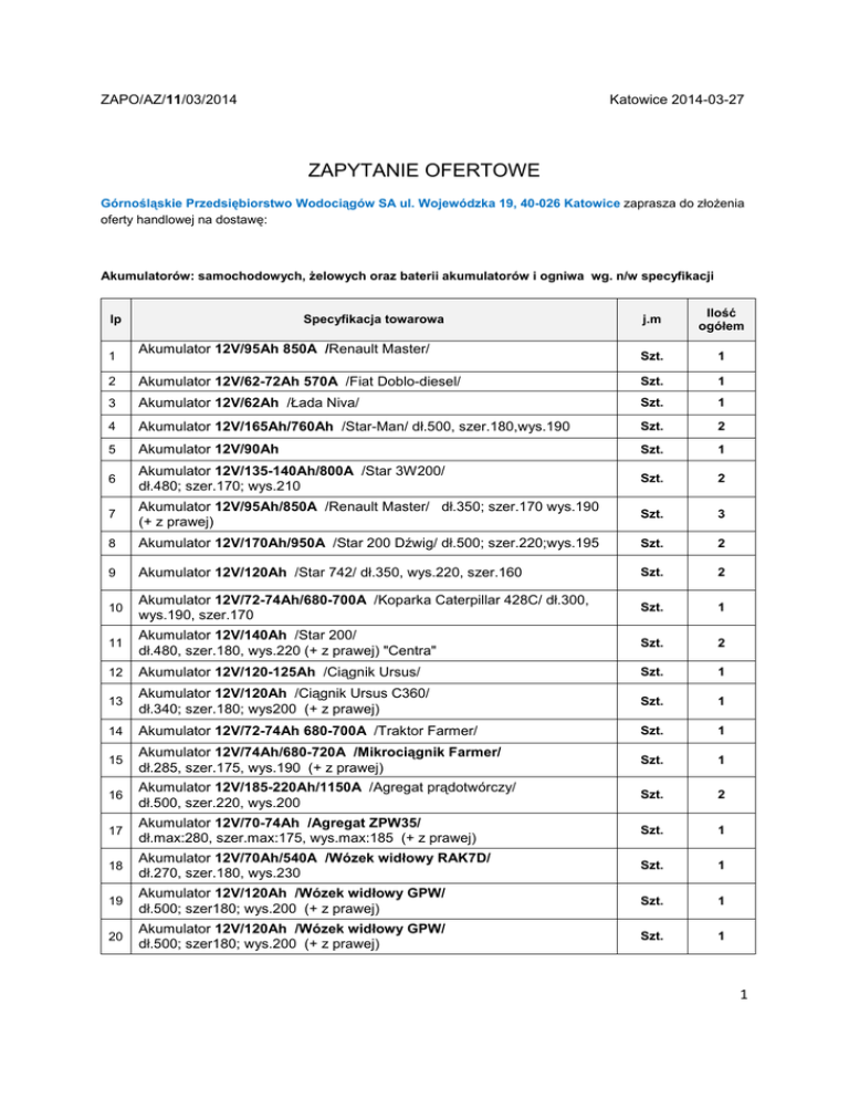 ZAPO/AZ/11/03/2014 Katowice 2014-03-27 ZAPYTANIE OFERTOWE Górnośląskie Przedsiębiorstwo Wodociągów SA ul. Wojewódzka 19, 40-026 Katowice zaprasza do złoŜenia oferty handlowej na dostawę: Akumulatorów: samochodowych, Ŝelowych oraz baterii akumulatorów i ogniwa wg. n/w specyfikacji lp 1 Specyfikacja towarowa Akumulator 12V/95Ah 850A /Renault Master/ j.m Ilość ogółem Szt. 1 2 Akumulator 12V/62-72Ah 570A /Fiat Doblo-diesel/ Szt. 1 3 Akumulator 12V/62Ah /Łada Niva/ Szt. 1 4 Akumulator 12V/165Ah/760Ah /Star-Man/ dł.500, szer.180,wys.190 Szt. 2 5 Akumulator 12V/90Ah Szt. 1 6 Akumulator 12V/135-140Ah/800A /Star 3W200/ dł.480; szer.170; wys.210 Szt. 2 7 Akumulator 12V/95Ah/850A /Renault Master/ dł.350; szer.170 wys.190 (+ z prawej) Szt. 3 8 Akumulator 12V/170Ah/950A /Star 200 Dźwig/ dł.500; szer.220;wys.195 Szt. 2 9 Akumulator 12V/120Ah /Star 742/ dł.350, wys.220, szer.160 Szt. 2 10 Akumulator 12V/72-74Ah/680-700A /Koparka Caterpillar 428C/ dł.300, wys.190, szer.170 Szt. 1 11 Akumulator 12V/140Ah /Star 200/ dł.480, szer.180, wys.220 (+ z prawej) "Centra" Szt. 2 12 Akumulator 12V/120-125Ah /Ciągnik Ursus/ Szt. 1 13 Akumulator 12V/120Ah /Ciągnik Ursus C360/ dł.340; szer.180; wys200 (+ z prawej) Szt. 1 14 Akumulator 12V/72-74Ah 680-700A /Traktor Farmer/ Szt. 1 15 Akumulator 12V/74Ah/680-720A /Mikrociągnik Farmer/ dł.285, szer.175, wys.190 (+ z prawej) Szt. 1 16 Akumulator 12V/185-220Ah/1150A /Agregat prądotwórczy/ dł.500, szer.220, wys.200 Szt. 2 17 Akumulator 12V/70-74Ah /Agregat ZPW35/ dł.max:280, szer.max:175, wys.max:185 (+ z prawej) Szt. 1 18 Akumulator 12V/70Ah/540A /Wózek widłowy RAK7D/ dł.270, szer.180, wys.230 Szt. 1 19 Akumulator 12V/120Ah /Wózek widłowy GPW/ dł.500; szer180; wys.200 (+ z prawej) Szt. 1 20 Akumulator 12V/120Ah /Wózek widłowy GPW/ dł.500; szer180; wys.200 (+ z prawej) Szt. 1 1 21 Bateria akumulatorów 2x40V /Wózek akumulatorowy BALKANCAR/ dł.820; szer.870; wys.415 Szt. 2 22 Akumulator AML 160/12 x 1 szt Szt. 1 Kpl. 1 Szt. 10 Szt. 5 Bateria akumulatorów 12V/100Ah /zasilanie awaryjne/, kpl.=18szt, Ŝelowe (z łącznikami / bez stelaŜa) Uwaga: dostawa baterii wraz z montaŜem nowej i demontaŜem starej oraz uruchomieniem dostarczonego urządzenia. Akumulator-bateria 12V/7,0-7,2Ah /do UPS-a/ dł.max:150mm; szer.max:64mm; wys:93mm/ Akumulator-bateria 12V/5,8Ah /do UPS-a/ dł.max:70mm; szer.max:90mm; wys:100mm HR5.8-12(12V,23W/Cell 15min.) 23 24 25 Adresy oraz szczegółowy podział dostaw urządzeń do oddziałów i wydziałów GPW S.A. znajduje się w załączniku nr1 i 2 do zapytania ofertowego Dostawa urządzeń obejmuje ich bezpłatną dostawę i rozładunek oraz odbiór zuŜytych do utylizacji. 00 00 Magazyny przyjmują towary od poniedziałku do piątku w godzinach od 7 do 13 Oferta winna zawierać co najmniej; Nazwę i adres oferenta Opis nawiązujący do parametrów wyszczególniony w zapytaniu ofertowym Wartość oferty netto / wartość oferty brutto (tylko w złotych polskich) Termin dostawy do 6 tygodni od daty podpisania umowy Oświadczenie o zdolność dostarczenia wraz z towarem Wymaganych dokumentów t.j.: 1. Deklaracji zgodności CE 2. Kart Gwarancyjnych 3. Instrukcji w języku polskim Termin waŜności oferty 30 dni roboczych Warunki gwarancji- Wykonawca zobowiązany jest udzielić Zamawiającemu gwarancji jakości minimum: 24-m-cy (akumulatory-baterie do UPS-ów oraz akumulator AML); 18m-cy (akumulatory do 100Ah); 12m-cy (akumulatory powyŜej 100Ah oraz baterie i ogniwo), liczonej od daty dostawy. Termin płatności wymagany przez Zamawiającego 30 dni po otrzymaniu faktury VAT Oferta winna być sporządzona na papierze firmowym oferenta lub opatrzona pieczątką firmową, posiadać datę jej sporządzenia oraz powinna być podpisana. Do oferty naleŜy dołączyć: parafowany wzór umowy Oświadczenie następującej treści – Zapoznaliśmy się ze wszystkimi warunkami podanymi w niniejszym Zapytaniu Ofertowym, ze wzorem umowy i przyjmujemy je bez zastrzeŜeń. W razie wygrania postępowania ZOBOWIĄZUJEMY się podpisać umowę w terminie zaproponowanym przez Zamawiającego, o treści zgodnej z załączonym wzorem 2 Ofertę naleŜy dostarczyć na adres: Górnośląskie Przedsiębiorstwo Wodociągów SA ul. Wojewódzka 19 40-026 Katowice Wydział Zaopatrzenia i Gospodarki Magazynowej pokój 35 Termin złoŜenia ofert upływa w dniu: 11.04.2014 Oferty moŜna dostarczyć: 1. Za pośrednictwem poczty (kurierem) 2. Telefaksem – 032 60-38-631- jeŜeli oferta liczyć będzie w całości nie więcej jak 10 stron 3. Osobiście Informacji dotyczących realizacji zamówienia udziela Pan Tomasz Gnieliński telefon 032 60-38-640 Informacji technicznych udziela Pan Janusz Siuta – 032-60-38-783 (poz.16-23) Pan Marek Bedlicki - 032-60-38-611 (poz.1-15) Pan Maciej Surowiec- 032-60-38-643 (poz.24-25) Zamawiający nie będzie rozpatrywał ofert alternatywnych, niezgodnych z przedmiotem zapytania ofertowego. Wybór oferty nastąpi w oparciu o kryterium ceny – waga 100% Zastrzegamy sobie prawo do nie skorzystania z Ŝadnej ze złoŜonych ofert, bez podania przyczyny jak równieŜ nie powiadamiania pisemnie oferentów o wyniku postępowania. Wszelkie pytania dotyczące przedmiotu zamówienia naleŜy składać do 3 dni przed terminem złoŜenia ofert. Na pytania złoŜone po tym terminie Zamawiający nie będzie udzielał odpowiedzi. Treść pytań i odpowiedzi umieszczona będzie na stronie internetowej Zamawiającego. W związku z powyŜszym Oferent winien dostarczyć ofertę wprowadzając w niej zmiany wynikającymi z treści pytań i odpowiedzi. Informacja o wyborze oferenta zostanie umieszczona na stronie internetowej GPW S.A. www.gpw.katowice.pl 3