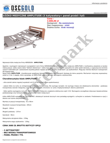 Informacje o produkcie Utworzono 02-03-2017 ŁÓŻKO MEDYCZNE AMPLITUDE (3 katywatory+ panel przód i tył) Cena : 3.680,00 zł er m ar k Dostępność : Na zamówienie Stan magazynowy : niski Średnia ocena : brak recenzji Najnowsze łożko medyczne firmy HERDEGEN - AMPLITUDE. Zgodnie z wymogami najnowszych europejskich norm firma HERDEGEN zaprojektowała łóżko medyczne AMPLITUDE z możliwością ustawienia w bardzo niskiej pozycji. Łóżko zwane także "łóżkiem Alzheimera". Łóżka tego typu są przeznaczone specjalnie do celów opieki domowej, a rygorystyczna kontrola użytych materiałów jak i zastosowanie wysokiej jakości napędu sprawia, że łóżka służą latami jej użytkownikom. Mogą być również idealnym rozwiązaniem dla wypożyczalni. Nasze łóżka AMPLITUDE charakteryzuje wyjątkowa łatwość demontażu aby usprawnić dostawę do domu pacjenta. Mechanizm nożycowy wyposażony został w 2 lub 3 napędy, które sprawiają, że AMPLITUDE spełnia wszelkie wymagania użytkowników. Charakterystyka łóżek AMPLITUDE: at - ultra szeroki zakres regulacji wysokości od 22 do 85cm(mechanizm opatentowany) - jedyne łóżko na rynku ze zintegrowaną podstawą transportową. Nie wymaga narzędzi, nie wymaga miejsca do składowania elementów - podstawa transportowa stanowi integralną część łóżka(rozwiązanie chronione na rynku międzynarodowym dwoma patentami) w - łóżko spełnia wymagania norm IEC 60601-2-52:2009 Medyczne urządzenia elektryczne-część 2-52: Wymagania szczegółowe dotyczące bezpieczeństwa podstawowego oraz funkcjonowania zasadniczego łóżek medycznych Łóżka AMPLITUDE wykonane są z frontów MDF, składanych barierek bocznych oraz posiadają wysięgnik z uchwytem w zestawie. Produkowane w opcji z dwoma lub trzema aktywatorami. Wymiary w pozycji transportowej - 42 x 90cm Wysokość w pozycji transportowej - 205cm Długość - 200cm Długość podstawy - 137cm Szerokość - 90cm Maksymalne obciążenie łóżka - 170kg Maksymalna waga użytkownika - 135kg CENA 3680 ZŁ BRUTTO DOTYCZY OPCJI - 3 AKTYWATORY - BEZ WÓZKA TRANSPORTOWEGO - PANEL PRZÓD I TYŁ Wygenerowano w programie www.oscGold.com w at er m ar k KOSZT DOSTAWY NA TERENIE POLSKI 150 ZŁ BRUTTO
