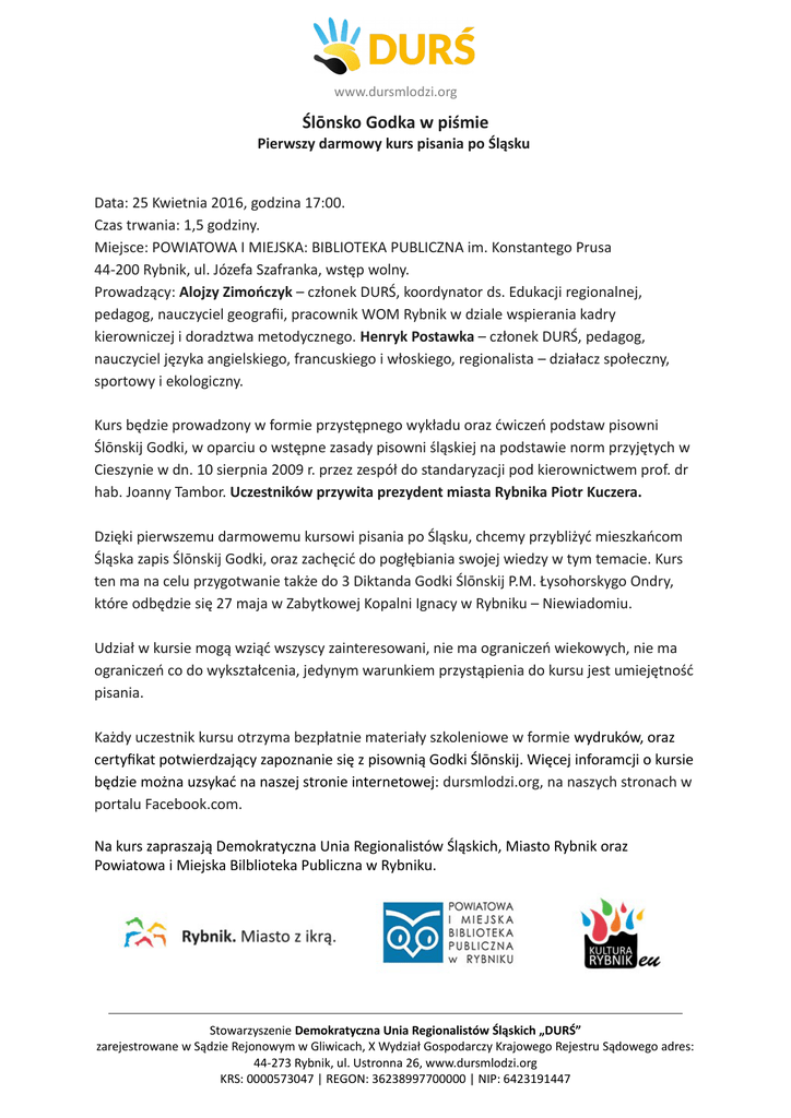 www.dursmlodzi.org Ślōnsko Godka w piśmie Pierwszy darmowy kurs pisania po Śląsku Data: 25 Kwietnia 2016, godzina 17:00. Czas trwania: 1,5 godziny. Miejsce: POWIATOWA I MIEJSKA: BIBLIOTEKA PUBLICZNA im. Konstantego Prusa 44-200 Rybnik, ul. Józefa Szafranka, wstęp wolny. Prowadzący: Alojzy Zimończyk – członek DURŚ, koordynator ds. Edukacji regionalnej, pedagog, nauczyciel geografii, pracownik WOM Rybnik w dziale wspierania kadry kierowniczej i doradztwa metodycznego. Henryk Postawka – członek DURŚ, pedagog, nauczyciel języka angielskiego, francuskiego i włoskiego, regionalista – działacz społeczny, sportowy i ekologiczny. Kurs będzie prowadzony w formie przystępnego wykładu oraz ćwiczeń podstaw pisowni Ślōnskij Godki, w oparciu o wstępne zasady pisowni śląskiej na podstawie norm przyjętych w Cieszynie w dn. 10 sierpnia 2009 r. przez zespół do standaryzacji pod kierownictwem prof. dr hab. Joanny Tambor. Uczestników przywita prezydent miasta Rybnika Piotr Kuczera. Dzięki pierwszemu darmowemu kursowi pisania po Śląsku, chcemy przybliżyć mieszkańcom Śląska zapis Ślōnskij Godki, oraz zachęcić do pogłębiania swojej wiedzy w tym temacie. Kurs ten ma na celu przygotwanie także do 3 Diktanda Godki Ślōnskij P.M. Łysohorskygo Ondry, które odbędzie się 27 maja w Zabytkowej Kopalni Ignacy w Rybniku – Niewiadomiu. Udział w kursie mogą wziąć wszyscy zainteresowani, nie ma ograniczeń wiekowych, nie ma ograniczeń co do wykształcenia, jedynym warunkiem przystąpienia do kursu jest umiejętność pisania. Każdy uczestnik kursu otrzyma bezpłatnie materiały szkoleniowe w formie wydruków, oraz certyfikat potwierdzający zapoznanie się z pisownią Godki Ślōnskij. Więcej inforamcji o kursie będzie można uzsykać na naszej stronie internetowej: dursmlodzi.org, na naszych stronach w portalu Facebook.com. Na kurs zapraszają Demokratyczna Unia Regionalistów Śląskich, Miasto Rybnik oraz Powiatowa i Miejska Bilblioteka Publiczna w Rybniku. Stowarzyszenie Demokratyczna Unia Regionalistów Śląskich „DURŚ” zarejestrowane w Sądzie Rejonowym w Gliwicach, X Wydział Gospodarczy Krajowego Rejestru Sądowego adres: 44-273 Rybnik, ul. Ustronna 26, www.dursmlodzi.org KRS: 0000573047 | REGON: 36238997700000 | NIP: 6423191447