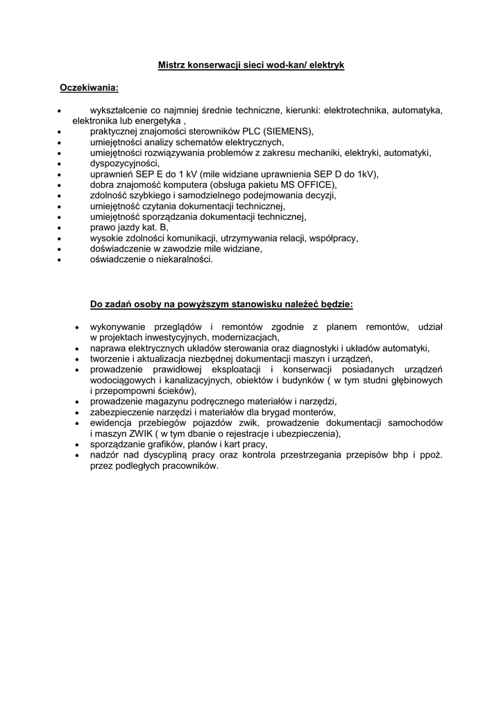 Mistrz konserwacji sieci wod-kan/ elektryk Oczekiwania: wykształcenie co najmniej średnie techniczne, kierunki: elektrotechnika, automatyka, elektronika lub energetyka , praktycznej znajomości sterowników PLC (SIEMENS), umiejętności analizy schematów elektrycznych, umiejętności rozwiązywania problemów z zakresu mechaniki, elektryki, automatyki, dyspozycyjności, uprawnień SEP E do 1 kV (mile widziane uprawnienia SEP D do 1kV), dobra znajomość komputera (obsługa pakietu MS OFFICE), zdolność szybkiego i samodzielnego podejmowania decyzji, umiejętność czytania dokumentacji technicznej, umiejętność sporządzania dokumentacji technicznej, prawo jazdy kat. B, wysokie zdolności komunikacji, utrzymywania relacji, współpracy, doświadczenie w zawodzie mile widziane, oświadczenie o niekaralności. Do zadań osoby na powyższym stanowisku należeć będzie: wykonywanie przeglądów i remontów zgodnie z planem remontów, udział w projektach inwestycyjnych, modernizacjach, naprawa elektrycznych układów sterowania oraz diagnostyki i układów automatyki, tworzenie i aktualizacja niezbędnej dokumentacji maszyn i urządzeń, prowadzenie prawidłowej eksploatacji i konserwacji posiadanych urządzeń wodociągowych i kanalizacyjnych, obiektów i budynków ( w tym studni głębinowych i przepompowni ścieków), prowadzenie magazynu podręcznego materiałów i narzędzi, zabezpieczenie narzędzi i materiałów dla brygad monterów, ewidencja przebiegów pojazdów zwik, prowadzenie dokumentacji samochodów i maszyn ZWIK ( w tym dbanie o rejestracje i ubezpieczenia), sporządzanie grafików, planów i kart pracy, nadzór nad dyscypliną pracy oraz kontrola przestrzegania przepisów bhp i ppoż. przez podległych pracowników.