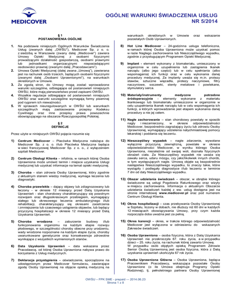 OGÓLNE WARUNKI ŚWIADCZENIA USŁUG NR 5/2014 §1 POSTANOWIENIA OGÓLNE 1. 2. 3. 4. 5. warunkach określonych w Umowie pozostałych Osób Uprawnionych. Na podstawie niniejszych Ogólnych Warunków Świadczenia Usług (zwanych dalej „OWŚU”), Medicover Sp. z o. o. z siedzibą w Warszawie (zwany dalej „Medicover”) zawiera Umowy Opieki Medycznej z osobami fizycznymi prowadzącymi działalność gospodarczą, osobami prawnymi lub jednostkami organizacyjnymi nieposiadającymi osobowości prawnej (zwanymi dalej „Pracodawcami”). Umowa Opieki Medycznej (dalej zwana „Umową”), zawierana jest na rachunek osób trzecich, będących osobami fizycznymi (zwanymi dalej „Osobami Uprawnionymi”), na warunkach określonych w Umowie. Za zgodą stron, do Umowy mogą zostać wprowadzone warunki szczególne, odbiegające od postanowień niniejszych OWŚU, które mają pierwszeństwo przed zapisami OWŚU. Wszelkie regulacje odbiegające od postanowień niniejszych OWŚU oraz warunki szczególne wymagają formy pisemnej pod rygorem ich nieważności. W sprawach nieuregulowanych w OWŚU lub warunkach szczególnych mają zastosowanie przepisy Kodeksu Cywilnego oraz inne przepisy prawa powszechnie obowiązującego na obszarze Rzeczypospolitej Polskiej. oraz wskazanie 8) Hot Line Medicover – 24-godzinna usługa telefoniczna, w ramach której Osoba Uprawniona może uzyskać pomoc w razie Nagłego zachorowania lub Nieszczęśliwego wypadku, zgodnie z przysługującym Programem Opieki Medycznej. 9) Implant - element wykonany z biomateriału, umieszczony w organizmie w celu uzupełnienia lub zastąpienia tkanek narządu (albo jego części) lub w celu spełniania (albo wspomagania) ich funkcji oraz w celu wykonania danej procedury medycznej. Za implanty uważa się m.in. protezy stawów, sztuczne więzadła, protezy naczyniowe, filtry naczyniowe, soczewki, stenty metalowe i powlekane, stymulatory serca. 10) Materiały/instrumenty medyczne potrzebne śródoperacyjnie - elementy wykonane z materiału tkankowego lub biomateriału umieszczone w organizmie w celu uzupełnienia tkanek narządu lub w celu wspomagania ich funkcji, a których wprowadzenie jest etapem wykonania danej procedury a nie jej celem. 11) Nagłe zachorowanie – stan chorobowy powstały w sposób §2 DEFINICJE Przez użyte w niniejszych OWŚU pojęcia rozumie się: 1) Centrum Medicover – Placówka Medyczna należąca do Medicover Sp. z o. o. i/lub Placówka Medyczna będąca w sieci franczyzowej Medicover Sp. z o. o., z wyłączeniem szpitali Medicover. 2) Centrum Obsługi Klienta – infolinia, w ramach której Osoba Uprawniona może umówić termin i miejsce uzyskania Usługi medycznej lub uzyskać informacje na temat opieki medycznej. 3) Choroba – stan zdrowia Osoby Uprawnionej, który zgodnie z aktualnym stanem wiedzy medycznej, wymaga leczenia lub diagnostyki. 4) 5) Choroba przewlekła – dający objawy lub zdiagnozowany lub leczony - w okresie 12 miesięcy przed Datą Uzyskania Uprawnień - stan chorobowy charakteryzujący się powolnym rozwojem oraz długookresowym przebiegiem, wymagający stałego lub okresowego leczenia ambulatoryjnego i/lub rehabilitacji, charakteryzujący się okresami zaostrzenia i zmniejszenia lub czasowego ustąpienia objawów, lub będący przyczyną hospitalizacji w okresie 12 miesięcy przed Datą Uzyskania Uprawnień. Choroba wrodzona – zaburzenie budowy i/lub funkcjonowania organizmu na każdym etapie rozwoju płodowego, w szczególności choroby obecne przy urodzeniu, wady wrodzone rozpoznane na każdym etapie życia, choroby uwarunkowane genetycznie oraz konsekwencje zdrowotne wynikające z wszystkich wymienionych stanów. 6) Data Uzyskania Uprawnień – data wskazana przez Pracodawcę, od której Osoba Uprawniona nabywa prawo do korzystania z Usług medycznych. 7) Deklaracja przystąpienia – oświadczenie, sporządzone na udostępnionym przez Medicover formularzu, zawierające zgodę Osoby Uprawnionej na objęcie opieką medyczną na nagły i niezamierzony, w okresie odpowiedzialności Medicover, bezpośrednio zagrażający życiu lub zdrowiu Osoby Uprawnionej, wymagający udzielenia natychmiastowej pomocy lekarskiej i poddania się leczeniu. 12) Nieszczęśliwy wypadek – nagłe zdarzenie, wywołane wyłącznie przyczyną zewnętrzną, powstałe w okresie odpowiedzialności Medicover, w wyniku którego Osoba Uprawniona, niezależnie od swojej woli, doznała fizycznych obrażeń ciała. Za Nieszczęśliwy wypadek nie uważa się zawału serca, udaru mózgu, czy jakichkolwiek innych chorób, w tym występujących nagle. Umową objęte są bezpośrednie następstwa Nieszczęśliwego wypadku, to znaczy takie, które wystąpiły i podlegały diagnostyce i/lub leczeniu w terminie 7 dni od daty Nieszczęśliwego wypadku. 13) Obszar udzielania świadczeń – obszar, w obrębie którego świadczone są usługi Pogotowia Ratunkowego oraz wizyty w miejscu zachorowania. Informacja o aktualnym Obszarze udzielania świadczeń każdej z ww. usług dostępna jest na stronie internetowej www.medicover.pl oraz pod numerem Centrum Obsługi Klienta. 14) Okres hospitalizacji – czas przebywania Osoby Uprawnionej w Szpitalu, liczony w dobach, nie dłuższy niż 60 dni w każdych 12 miesiącach obowiązywania Umowy, przy czym każda rozpoczęta doba uważna jest za pełną. 15) Okres karencji – okres, w trakcie którego odpowiedzialność Medicover jest wyłączona w odniesieniu do Zakresów świadczeń. wskazanych 16) Osoba Uprawniona – osoba fizyczna, która z Datą Uzyskania Uprawnień nie przekroczyła 67. roku życia, a w przypadku dzieci – 25. roku życia, na rachunek której zawarto Umowę. W przypadku osób objętych opieką Programem Zdrowie Senior Osobą Uprawnioną jest osoba fizyczna, która z Datą uzyskania uprawnień ukończyła 67 rok życia. 17) Osoba Uprawniona Główna – Osoba Uprawniona, będąca Pracownikiem Pracodawcy, wskazująca pozostałe Osoby Uprawnione (o ile Umowa ob