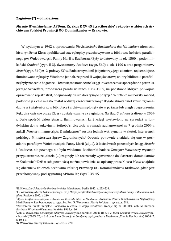 Zaginiony(?) – odnaleziony. Missale Wratislaviense, APDom. Kr, rkps R XV 45 i „raciborskie” rękopisy w zbiorach Archiwum Polskiej Prowincji OO. Dominikanów w Krakowie. W wydanym w 1942 r. opracowaniu Die Schlesische Buchmalerei des Mittelalters niemiecki historyk Ernst Kloss opublikował trzy rękopisy przechowywane w bibliotece kościoła parafialnego pw. Wniebowzięcia Panny Marii w Raciborzu.1 Były to datowany na ok. 1500 r. podominikański Graduał (sygn. E 3), dwutomowy Psałterz (sygn. 560) z ok. 1400 r. oraz pergaminowy Mszał (sygn. 540) z 2. połowy XV w. Badacz wymienił jedynie trzy, jego zdaniem, najcenniejsze, iluminowane rękopisy. Wiadomo jednak, że przed II wojną światową zbiory biblioteki parafialnej były znacznie bogatsze.2 Dziewiętnastowieczne księgi inwentarzowe sporządzone przez ks. Jerzego Schaeffera, proboszcza parafii w latach 1867-1909, na podstawie których po wojnie opracowano rejestr strat, obejmowały blisko dwa tysiące pozycji.3 W 1945 r. raciborski kościół, podobnie jak całe miasto, został w dużej części zniszczony.4 Bogate zbiory dzieł sztuki zgromadzone w świątyni oraz w bibliotece i archiwum spłonęły się w pożarze lub uległy rozproszeniu. Rękopisy opisane przez Klossa zostały uznane za zaginione. Na ślad Graduału trafiono w 2004 r. Dwie spośród dziewiętnastu iluminowanych kart księgi wystawiono na sprzedaż w londyńskim domu aukcyjnym Sotheby’s. Licytacja w ramach zaplanowanej na 7 grudnia 2004 r. aukcji „Western manuscripts & miniatures” została jednak wstrzymana w skutek interwencji polskiego Ministerstwa Spraw Zagranicznych. 5 Obecnie ponownie znajdują się one w posiadaniu parafii pw. Wniebowzięcia Panny Marii (zdj.1). O losie dwóch pozostałych ksiąg, Mszału i Psałterza, nic pewnego nie było wiadomo. Raciborski badacz Grzegorz Wawoczny wysunął przypuszczenie, że „dzieła (…) zaginęły lub też zostały wywiezione do klasztoru dominikanów w Krakowie”.6 Dziś z całą pewnością można powiedzie, że opisany przez Klossa Mszał znajduje się obecnie w zbiorach Archiwum Polskiej Prowincji OO. Dominikanów w Krakowie, gdzie jest przechowywany pod sygnaturą APDom. Kr, rkps R XV 45. 1 E. Kloss, Die Schlesische Buchmalerei des Mittelalters, Berlin 1942, s. 233-234. G. Wawoczny, Skarby kościoła farnego, [w:]: Dzieje parafii Wniebowzięcia Najświętszej Marii Panny w Raciborzu, red. Idem, Racibórz 2005, s. 280. 3 Wykaz książek brakujących w Archiwum Kościoła NMP w Raciborzu, Archiwum Parafii Wniebowzięcia Najświętszej Marii Panny w Raciborzu, mps b. sygn., b.r. Por. G. Wawoczny, Skarby kościoła…, op. cit., s. 281. 4 Zniszczenia tkanki miejskiej Raciborza w czasie II wojny światowej szacuje się na 60-80%. Zob. M. Kutzner, Racibórz, Wrocław-Warszawa-Kraków 1965, s. 36. 5 Zob. G. Wawoczny, Sensacyjne odkrycie, „Nowiny Raciborskie”, 2004: 48, s. 1-2; Idem, Graduał wrócił, „Nowiny Raciborskie”, 2005: 25, s. 1-2 oraz Idem, Sensacja w Londynie, czyli graduał z Raciborza, „Ziemia Raciborska”, 2004: 7, s. 10-11. 6 G. Wawoczny, Skarby kościoła…, op. cit., s. 278. 2 Missale nr 540 i Missale Wratislaviense, APDom. Kr, rkps R XV 45. Ernst Kloss opisał mszał nr 540 jako mierzący 400 x 305 mm pergaminowy rękopis pozbawiony oprawy. Badacz wyliczył zdobiące jego karty inicjały figuralne (Bildinitialen) oraz podał ich dokładne wymiary. Dekoracja malarska rękopisu nr 540 składała się z dziewięciu, sporych rozmiarów miniatur. Cykl otwierało przedstawienie klęczącego papieża w inicjale A(d te levavi)(zdj.2), Wizerunek Marii adorującej Dzieciątko zdobił formularz mszalny na święto Bożego Narodzenia(zdj.3), scena Wjazdu do Jerozolimy – tekst na Niedzielę Palmową(zdj.4). W inicjał R(esurrexi) wpisane było przedstawienie Chrystusa Zmartwychwstałego(zdj.5). Ponadto w rękopisie znajdowały się inicjały ze scenami Wniebowstąpienia(zdj.6) oraz Zesłania Ducha Świętego(zdj.7). Inicjał T(e igitur) zawierał przedstawienie Chrystusa Bolesnego w sarkofagu(zdj.8). Formularz na Święto Trójcy Przenajświętszej opatrzono ilustracją ukazującą Tron Łaski(zdj.9). Cykl miniatur zamykało przedstawienie kościoła w dniu święta konsekracji w inicjale T(erribilis)(zdj.10). Poziom artystyczny dekoracji malarskiej księgi ocenił Kloss jako przeciętny.7 Zwrócił on jednak uwagę na wykonane znacznie lepiej floratury, na podstawie których autorstwo miniatur przypisał jednemu z naśladowców Jana z Żytawy, 8 a sam mszał datował na 2. połowę XV w. Mimo lapidarności opisu niemieckiego badacza, dostarcza on wielu cennych informacji pozwalających na zidentyfikowanie księgi ze skarbca raciborskiej kolegiaty z rękopisem przechowywanym w krakowskim archiwum. Missale Wratislaviense, rkps R XV 45, jak zanotowano w Katalogu rękopisów średniowiecznych Archiwum OO. Dominikanów w Krakowie, pochodzi „z kolegiaty raciborskiej, od 1946 r. [znajduje się] w klasztorze OO. Dominikanów w Krakowie”.9 Mszał ten posiada takie same wymiary jak księga opublikowana przed wojną. Obecnie oprawiony jest we współczesną, kartonową oprawę, która wymaga jednak konserwacji (brak grzbietu). Księga składa się z 239 kart pergaminowych ułożonych w 25 składek (kwinteriony). Wyklejki oraz dodane z przodu i tyłu 7 „Die Malereien, die nur in der Randzier einige Qualität aufweisen, lassen sich etwa als Arbeiten eines Nachfolgers Johanns von Zittau ansprechen. Schlesisch. 2. Halfte 15 Jh.” Zob. E. Kloss, op. cit., s. 234. 8 Jan z Żytawy to malarz iluminator, według różnych opinii, pochodzący z górnołużyckiego miasta Zittau lub morawskich Svitav; czynny na Śląsku w 1. wierci XV w. Datowane rękopisy, które miał iluminowa , pochodzą z lat 1420-1421. Obecnie przypisuje się mu dekorację piętnastu ksiąg, m.in. Księgi miejskiej Głubczyc (Opole AP, Akta m. Głubczyc, sygn 208), rękopisu Vitae Patrum z klasztoru cystersów w Henrykowi