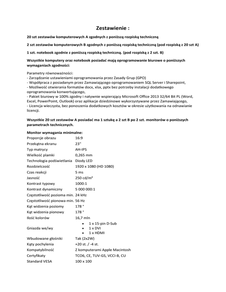 Zestawienie : 20 szt zestawów komputerowych A zgodnych z poniższą rozpiską techniczną 2 szt zestawów komputerowych B zgodnych z poniższą rozpiską techniczną (pod rozpiską z 20 szt A) 1 szt. notebook zgodnie z poniższą rozpiską techniczną. (pod rozpiską z 2 szt. B) Wszystkie komputery oraz notebook posiadać mają oprogramowanie biurowe o poniższych wymaganiach zgodności: Parametry równoważności: - Zarządzanie ustawieniami oprogramowania przez Zasady Grup (GPO) - Współpraca z posiadanym przez Zamawiającego oprogramowaniem SQL Server i Sharepoint, - Możliwość otwierania formatów docx, xlsx, pptx bez potrzeby instalacji dodatkowego oprogramowania konwertującego, - Pakiet biurowy w 100% zgodny i natywnie wspierający Microsoft Office 2013 32/64 Bit PL (Word, Excel, PowerPoint, Outlook) oraz aplikacje dziedzinowe wykorzystywane przez Zamawiającego, - Licencja wieczysta, bez ponoszenia dodatkowych kosztów w okresie użytkowania na odnawianie licencji. Wszystkie 20 szt zestawów A posiadać ma 1 sztukę a 2 szt B po 2 szt. monitorów o poniższych parametrach technicznych. Monitor wymagania minimalne: Proporcje obrazu 16:9 Przekątna ekranu 23" Typ matrycy AH-IPS Wielkość plamki 0,265 mm Technologia podświetlania Diody LED Rozdzielczość 1920 x 1080 (HD 1080) Czas reakcji 5 ms Jasność 250 cd/m² Kontrast typowy 1000:1 Kontrast dynamiczny 5 000 000:1 Częstotliwość pozioma min. 24 kHz Częstotliwość pionowa min. 56 Hz Kąt widzenia poziomy 178 ° Kąt widzenia pionowy 178 ° Ilość kolorów 16,7 mln 1 x 15-pin D-Sub Gniazda we/wy 1 x DVI 1 x HDMI Wbudowane głośniki Tak (2x2W) Kąty pochylenia +20 st. / -4 st. Kompatybilność Z komputerami Apple Macintosh Certyfikaty TCO6, CE, TUV-GS, VCCI-B, CU Standard VESA 100 x 100 1. Nazwa komponentu Typ 2. Obudowa Lp. Wymagane minimalne parametry techniczne komputerów (20 sztuk) A Komputer stacjonarny. W ofercie wymagane jest podanie modelu, symbolu oraz nazwy producenta. Typu MiniTower z obsługą kart PCI Express wyłącznie o pełnym profilu: - 1 x PCI Express 3.0 x16, - 1 x PCI Express 2.0 x16 (x4 elektrycznie), - 1 x PCI Express 2.0 x1, Wyposażona w min. 2 kieszenie: 2 szt. 5,25”, 2 szt. 3,5”, umożliwiająca montaż 3 dysków twardych Obudowa musi umożliwiać bez narzędziowe otwarcie, demontaż dysków twardych (3,5” oraz 2,5”), napędu optycznego oraz kart rozszerzeń. Wyklucza się użycie jakichkolwiek śrub. Obudowa musi być wyposażona w czujnik otwarcia obudowy oraz zamek nie wystający poza obrys obudowy oraz rączkę umożliwiająca łatwe przenoszenie. 3. 4. Chipset Płyta główna 5. Procesor Obudowa trwale oznaczona nazwą producenta, nazwą komputera, numerem MTM, PN, numerem seryjnym Dostosowany do zaoferowanego procesora Zaprojektowana i wyprodukowana przez producenta komputera, trwale oznaczona nazwą producenta komputera (na etapie produkcji), naniesiona informacja o adresie MAC wbudowanej karty sieciowej Procesor klasy x86, 4 rdzeniowy, zaprojektowany do pracy w komputerach przenośnych, taktowany zegarem co najmniej 3,1 GHz, pamięcią cache CPU co najmniej 6144 MB zapewniający wydajność całego oferowanego komputera w następujących scenariuszach: 1. Office Productivity min 1000 pkt w teście SysMark® 2014 2. Media Creation min 900 pkt w teście SysMark® 2014 3. Data/Financial Analysis min 900 pkt w teście SysMark® 2014 4. SM 2014 Overall Rating min 1100 pkt w teście SysMark® 2014 w oparciu o wyniki testów opublikowane na stronie konsorcjum BapCo - tzw. Full Disclosure Reports lub dostarczone wyniki testów wykonanych przez oferenta w formacie FDR (Full Disclosure Report ) i PDF. Test SysMark® 2014 powinien być wykonany w konfiguracji całego komputera identycznej z wymaganą oraz przy rozdzielczości ekranu 1024x768 pixeli/60 Hz, 32-bitowej głebi koloru i innymi ustawieniami zgodnymi z zaleceniami producenta testu. W przypadku użycia przez Wykonawcę testu BAPCo do oceny wydajności Zamawiający zastrzega sobie, iż w celu sprawdzenia poprawności przeprowadzonych testów Wykonawca musi dostarczyć Zamawiającemu oprogramowanie testujące wraz z licencją, zestaw komputerowy w konfiguracji identycznej z wymaganą oraz dokładne opisy użytych testów wraz z wynikami w formatach FDR (Full Disclosure Report ) i PDF w terminie nie dłuższym niż 3 dni od otrzymania zawiadomienia od Zamawiającego 8 GB GB UDIMM, PC3-12800 1600MHz DDR3, 4 sloty na pamięć, z czego 3 wolne, 7. Pamięć operacyjna Dysk twardy 8. Napęd optyczny Nagrywarka DVD +/-RW w kolorze zbliżonym do koloru obudowy, wyposażona w tackę z zaczepami umożliwiającymi pracę w poziomi i pionie 9. Karta graficzna Zintegrowana karta graficzna wykorzystująca pamięć RAM systemu dynamicznie przydzielaną na potrzeby grafiki w trybie UMA (Unified Memory Access) – z możliwością dynamicznego przydzielenia do 1,7 GB pamięci. Obsługująca funkcje: DirectX 12, OpenGL 4.4 6. 10. Audio 11. Karta sieciowa 12. Porty/złącza Min 1000 GB, zawierający partycję RECOVERY umożliwiającą odtworzenie systemu operacyjnego fabrycznie zainstalowanego na komputerze po awarii. Karta dźwiękowa zintegrowana z płytą główną, zgodna z High Definition. 10/100/1000 – złącze RJ45 Wbudowane porty: - 1 x VGA, - 2 x DP, - 8 x USB w tym: 2x USB3.0 z przodu obudowy i 6 z tyłu obudowy (z czego 2 x USB 3.0); - port sieciowy RJ-45, - porty słuchawek i mikrofonu na prze1qaadnim lub tylnym panelu obudowy - czytnik kart pamięci 29-in-1 Wymagana ilość i rozmieszczenie (na zewnątrz obudowy komputera) portów USB nie może być osiągnięta w wyniku stosowania konwerterów, przejściówek itp. 13. Klawiatura/mysz 14. Zasilacz 15. System operacyjny Klawiatura przewodowa w układzie US w kolorze zbliżonym do koloru obudowy, długość przewodu min 180cm Mysz przewodowa (scroll) w kolorze zbliżonym do koloru obudowy, długość przewodu min 180cm Maksymalna moc zasilacza nie większa niż 280W 85% potwierdzona ce