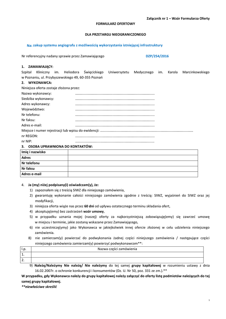 Załącznik nr 1 – Wzór Formularza Oferty FORMULARZ OFERTOWY DLA PRZETARGU NIEOGRANICZONEGO Na: zakup systemu angiografu z możliwością wykorzystania istniejącej infrastruktury Nr referencyjny nadany sprawie przez Zamawiającego DZP/254/2016 1. ZAMAWIAJĄCY: Szpital Kliniczny im. Heliodora Święcickiego Uniwersytetu Medycznego im. Karola Marcinkowskiego w Poznaniu, ul. Przybyszewskiego 49, 60-355 Poznań 2. WYKONAWCA: Niniejsza oferta zostaje złożona przez: Nazwa wykonawcy: ................................................................................... Siedziba wykonawcy: ................................................................................... Adres wykonawcy: ................................................................................... Województwo: ................................................................................... Nr telefonu: ................................................................................... Nr faksu: ................................................................................... Adres e-mail: ................................................................................... Miejsce i numer rejestracji lub wpisu do ewidencji: ................................................................................................. nr REGON: ................................................................................... nr NIP: …................................................................................ 3. OSOBA UPRAWNIONA DO KONTAKTÓW: Imię i nazwisko Adres Nr telefonu Nr faksu Adres e-mail 4. Ja (my) niżej podpisany(i) oświadczam(y), że: 1) zapoznałem się z treścią SIWZ dla niniejszego zamówienia, 2) gwarantuję wykonanie całości niniejszego zamówienia zgodnie z treścią: SIWZ, wyjaśnień do SIWZ oraz jej modyfikacji, 3) niniejsza oferta wiąże nas przez 60 dni od upływu ostatecznego terminu składania ofert, 4) akceptuję(emy) bez zastrzeżeń wzór umowy, 5) w przypadku uznania mojej (naszej) oferty za najkorzystniejszą zobowiązuję(emy) się zawrzeć umowę w miejscu i terminie, jakie zostaną wskazane przez Zamawiającego, 6) nie uczestniczę(ymy) jako Wykonawca w jakiejkolwiek innej ofercie złożonej w celu udzielenia niniejszego zamówienia. 8) nie zamierzam(y) powierzać do podwykonania żadnej części niniejszego zamówienia / następujące części niniejszego zamówienia zamierzam(y) powierzyć podwykonawcom**: l.p. Nazwa części zamówienia 1. 2. 9) Należę/Należymy Nie należę/ Nie należymy do tej samej grupy kapitałowej w rozumieniu ustawy z dnia 16.02.2007r. o ochronie konkurencji i konsumentów (Dz. U. Nr 50, poz. 331 ze zm.).** W przypadku, gdy Wykonawca należy do grupy kapitałowej należy załączyć do oferty listę podmiotów należących do tej samej grupy kapitałowej. **niewłaściwe skreślić 1 Przedmiot zamówienia: Netto:.............................................. (słownie):................................................................................................................................... plus …….........% podatku VAT w kwocie ..............................................……................................., czyli cena ofertowa wynosi: brutto: .........................., słownie:...................................…................... Przedmiot zamówienia Oferta: Producent, handlowa, nazwa ilość (a) 1 Dostawa systemu Angiografu 2 System gromadzenia i przechowywania danych w pracowni (PACS) 3 Wyposażenie dodatkowe 4 Szkolenia 5 Montaż i instalacja 6 Roboty budowlane Wartość netto ogółem Cena netto (b) jednostkowa Cena ogółem netto (a x b = c) Wartość podatku VAT ogółem Wartość podatku VAT ogółem (d) Stawka VAT podatku Cena Ogółem Brutto (c + d) Wartość brutto ogółem UWAGA: WRAZ Z FORMULAZEM OFERTOWYM NALEŻY ZŁOZYC WYPEŁNIONE TABELE TOMU III SIWZ 2 7.Podpis(y): l.p. Nazwa(y) Wykonawcy (ów) Nazwisko i imię osoby (osób) upoważnionej(ych) do podpisania niniejszej oferty w imieniu Wykonawcy(ów) Podpis(y) osoby(osób) upoważnionej(ych) do podpisania niniejszej oferty w imieniu Wykonawcy(ów) Pieczęć(cie) Wykonawcy (ów) Miejscowość i data 1. 2. 1 – niepotrzebne skreślić 3
