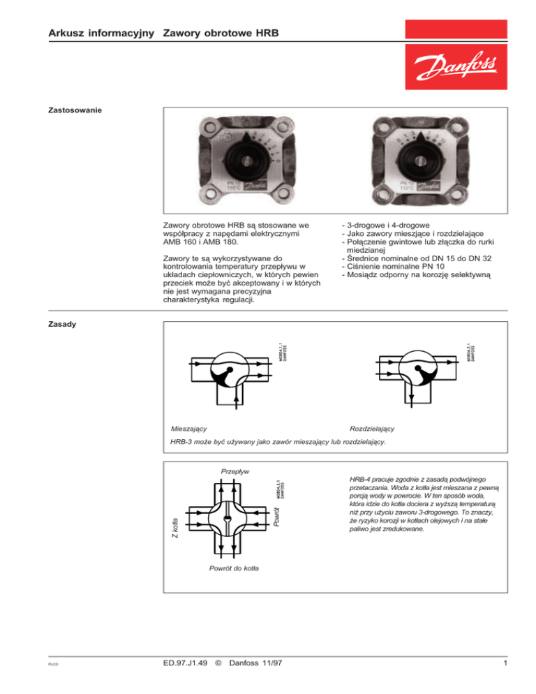 Arkusz informacyjny Zawory obrotowe HRB Zastosowanie Zawory obrotowe HRB s¹ stosowane we wspó³pracy z napêdami elektrycznymi AMB 160 i AMB 180. Zawory te s¹ wykorzystywane do kontrolowania temperatury przep³ywu w uk³adach ciep³owniczych, w których pewien przeciek mo¿e byæ akceptowany i w których nie jest wymagana precyzyjna charakterystyka regulacji. - 3-drogowe i 4-drogowe - Jako zawory mieszj¹ce i rozdzielaj¹ce - Po³¹czenie gwintowe lub z³¹czka do rurki miedzianej - rednice nominalne od DN 15 do DN 32 - Cinienie nominalne PN 10 - Mosi¹dz odporny na korozjê selektywn¹ Zasady Mieszaj¹cy Rozdzielaj¹cy HRB-3 mo¿e byæ u¿ywany jako zawór mieszaj¹cy lub rozdzielaj¹cy. Z kot³a Powrót Przep³yw HRB-4 pracuje zgodnie z zasad¹ podwójnego przetaczania. Woda z kot³a jest mieszana z pewn¹ porcj¹ wody w powrocie. W ten sposób woda, która idzie do kot³a dociera z wy¿sz¹ temperatur¹ ni¿ przy u¿yciu zaworu 3-drogowego. To znaczy, ¿e ryzyko korozji w kot³ach olejowych i na sta³e paliwo jest zredukowane. Powrót do kot³a PLCD ED.97.J1.49 © Danfoss 11/97 1 Arkusz informacyjny Zamówienia Zawory obrotowe HRB Zawór DN mm Kvs m3/h Przeciek w zaw. miesz.1) HRB-3 HRB-3 HRB-3 15 15 15 0,6 1,0 1,2 1,5% 1,5% 1,5% HRB-3 HRB-3 HRB-3 15 15 20 1,6 2,5 4,0 HRB-3 HRB-3 HRB-3 20 25 25 HRB-3 HRB-3 HRB-3 32 22 28 Przeciek w zaw. rozdzielaj¹cym1) Waga kg Nr katalog. 0,5 0,5 0,5 0,7 0,7 0,7 065B2177 065B2178 065B2179 1,5% 1,5% 1,5% 0,5 0,5 0,5 0,7 0,7 0,6 065B2180 065B2181 065B2183 6,3 8,0 12,0 0,4% 0,3% 0,3% 0,4 0,3 0,3 0,6 0,7 1,0 065B2184 065B2186 065B2187 18,0 6,3 8,0 0,3% 0,4% 0,3% 0,3 0,4 0,3 1,1 0,8 1,0 065B2189 065B2191 065B2192 1) % wartoci Kvs gdy zawór jest zamkniêty Zawór HRB-4 HRB-4 DN mm 15 20 Kvs m3/h 2,5 4,0 Przeciek w zaw. mieszaj¹cym1) 1,5% 1,5% Waga kg 0,9 0,8 Nr katalog. HRB-4 HRB-4 HRB-4 20 25 25 6,3 8,0 12,0 1,0% 1,0% 1,0% 0,8 0,9 1,1 065B2201 065B2203 065B2204 HRB-4 32 18,0 1,0% 1,2 065B2206 065B2198 065B2200 Gor¹ca woda 1) % wartoci Kvs gdy zawór jest zamkniêty Charakterystyka zaworu Charakterystyka przep³ywu 2 ED.97.J1.49 © Danfoss 11/97 Nastawa zaworu Spadek cinienia PLCD Arkusz informacyjny Monta¿ Zawory obrotowe HRB HRB-3 Dzia³anie odwrotne uzyskuje siê przez zmianê kierunku obrotu napêdu elektrycznego. Nale¿y równie¿ odwróciæ tabliczkê na zaworze. HRB-4 Dzia³anie odwrotne uzyskuje siê przez zmianê kierunku obrotu napêdu elektrycznego. Nale¿y równie¿ odwróciæ tabliczkê na zaworze. Dane Materia³y PLCD Maksymalna temperatura czynnika Maksymalne cinienie HRB-3/HRB-4 110 °C 10 bar Maksymalne cinienie ró¿nicowe Cinienie próbne Moment obrotowy 2 bary 16 bar Maks. 2 Nm Korpus zaworu Mosi¹dz Wa³ek i zawierad³o Uszczelka O-ring £o¿ysko Mosi¹dz EPDM PPO Tabliczka Cynk ED.97.J1.49 © Danfoss 11/97 3 Arkusz informacyjny Zawory obrotowe HRB Wymiary Typ a H L mm H1 mm HRB-3 HRB-3 HRB-3 DN 15 20 22 Rp 1/2 Rp 3/4 22 mm 35 35 32 72 72 102 33 33 33 HRB-3 HRB-3 HRB-3 25 - 8 25 - 12 28 Rp 1 Rp 1 28 mm 42 42 41 72 88 104 33 37 33 HRB-3 HRB-4 HRB-4 32 15 20 Rp 1 1/4 Rp 1/2 Rp 3/4 50 35 35 88 72 72 37 33 33 HRB-4 HRB-4 HRB-4 25 - 8 25 - 12 32 Rp 1 Rp 1 Rp 1 1/4 42 42 50 72 88 88 33 37 37 Dane techniczne zawarte w broszurze mog¹ ulec zmianie bez wczeniejszego uprzedzenia, jako efekt sta³ych ulepszeñ i modyfikacji naszych urz¹dzeñ. Danfoss Sp. z o.o. 4 ul. Obozowa 20 01-161 Warszawa tel.: (22) 632 00 75 e-mail: [email protected] fax: (22) 632 69 32 http://www.danfoss.com.pl ED.97.J1.49 © Danfoss 11/97 Nowa sidziba: ul. Chrzanowska 5 05-825 Grodzisk Mazowiecki tel: (22) 755 07 00, 724 33 66 fax: (22) 755 07 01, 724 33 88 PLCD