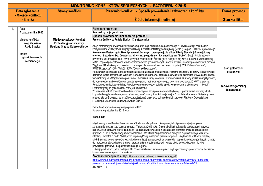 MONITORING KONFLIKTÓW SPOŁECZNYCH - PAŹDZIERNIK 2015 Data zgłoszenia - Miejsce konfliktu - Branża 1. Strony konfliktu Data: 7 października 2015 Miejsce konfliktu: woj. śląskie – Ruda Śląska Branża: górnictwo węgla kamiennego Przedmiot konfliktu - Sposób prowadzenia i zakończenia konfliktu Źródło informacji medialnej Forma protestu Stan konfliktu Przedmiot protestu: Restrukturyzacja górnictwa Międzyzwiązkowy Komitet Protestacyjno-Strajkowy Regionu Śląsko-Dąbrowskiego Sposób prowadzenia i zakończenia protestu: Protest górników w Rudzie Śląskiej 13 października Akcja protestacyjna związana ze złamaniem przez rząd porozumienia podpisanego 17 stycznia 2015 roku będzie kontynuowana - zdecydował Międzyzwiązkowy Komitet Protestacyjno-Strajkowy (MKPS) Regionu Śląsko-Dąbrowskiego. Kolejna manifestacja górników i pracowników innych branż przejdzie ulicami Rudy Śląskiej już w najbliższy wtorek, 13 października. Demonstranci wyruszą o godzinie 15. sprzed kopalni "Pokój". Swój 1,5-kilometrowy przemarsz zakończą na placu przed Urzędem Miasta Ruda Śląska, gdzie odbędzie się wiec. Do udziału w manifestacji MKPS zaprosił przedstawicieli władz samorządowych gmin górniczych, które w styczniu wsparły pracowników Kompanii Węglowej SA strajkujących przeciwko rządowym planom zamknięcia czterech kopalń (KWK "Bobrek-Centrum", KWK "Brzeszcze", KWK "Pokój" i KWK "Sośnica-Makoszowy"). Porozumienie kończące tamten strajk nie zostało przez rząd zrealizowane. Pełnomocnik rządu do spraw restrukturyzacji górnictwa węgla kamiennego Wojciech Kowalczyk poinformował organizacje związkowe działające w KW, że tak zwana "nowa" Kompania Węglowa nie powstanie. Stworzenie firmy, w oparciu o finansowanie ze strony spółek energetycznych, do końca września było głównym punktem programu restrukturyzacyjnego, który miał wyprowadzić KW "na prostą". Po dziewięciu miesiącach dalsze funkcjonowanie największej polskiej spółki węglowej, firmy skupiającej 11 kopalń i zatrudniającej 35 tysięcy osób, znów jest zagrożone. 28 września MKPS zdecydował o odwieszeniu czynnej akcji protestacyjno-strajkowej. 1 października we wszystkich kopalniach węgla kamiennego zaczął obowiązywać stan gotowości strajkowej, a 5 października niemal 10 tysięcy osób przyjechało do Brzeszcz, by wspólnie zaprotestować przeciwko polityce koalicji rządowej Platformy Obywatelskiej i Polskiego Stronnictwa Ludowego wobec Śląska. Pełna treść komunikatu wydanego przez MKPS: Katowice, 6 października 2015 roku Komunikat Międzyzwiązkowy Komitet Protestacyjno-Strajkowy zdecydował o kontynuacji akcji protestacyjnej związanej ze złamaniem przez rząd porozumienia z 17 stycznia 2015 roku. Celem akcji jest pokazanie społeczności naszego regionu, jak negatywne skutki dla Śląska i Zagłębia Dąbrowskiego niesie ze sobą złamanie przez obecną koalicję rządową PO-PSL styczniowej umowy społecznej. We wtorek 13 października odbędzie się manifestacja w Rudzie Śląskiej. Początek o godz. 15.00 przed kopalnią Pokój, następnie przemarsz przed Urząd Miasta w Rudzie Śląskiej. MKPS zwraca się do członków wszystkich organizacji związkowych ze wszystkich kopalń i zakładów górniczych, a także do reprezentantów związków z innych branż o udział w tej manifestacji. Nasza akcja dotyczy bowiem nie tylko przyszłości górnictwa, ale przyszłości całego regionu. O kolejnych krokach, jakie podejmie MKPS w związku ze złamaniem przez rząd styczniowego porozumienia, będziemy informować w następnych komunikatach. Źródło informacji medialnej: http://www.solidarnoscgornicza.org.pl/ http://www.solidarnoscgornicza.org.pl/index.php?option=com_content&view=article&id=1069:oszukaniprzez-rzd-zaprotestuj-w-rudzie-lskiej-aktualizacja&catid=1:narchiwum-wiadomoci&Itemid=21 /07.10.2015/ stan gotowości strajkowej zapowiedź górniczej demonstracji MONITORING KONFLIKTÓW SPOŁECZNYCH - PAŹDZIERNIK 2015 Data zgłoszenia - Miejsce konfliktu - Branża 2. Strony konfliktu Data: 7 października 2015 Miejsce konfliktu: woj. mazowieckie– Warszawa Branża: cała gospodarka Przedmiot konfliktu - Sposób prowadzenia i zakończenia konfliktu Źródło informacji medialnej Forma protestu Stan konfliktu Przedmiot protestu: Nietrwałe formy zatrudnienia Sekretariaty branżowe NSZZ "Solidarność" Metalowców, Górnictwa i Energetyki oraz Przemysłu Chemicznego Sposób prowadzenia i zakończenia protestu: Pikieta przed Ministerstwem Pracy i Polityki Społecznej w Warszawie w dniu obchodzonym jako Światowy Dzień Godnej Pracy (07.10.). W tym roku po raz kolejny światowa federacja przemysłowa industriALL Global Trade Union organizuje na całym świecie akcję protestacyjną pod hasłem “STOP umowom śmieciowym”. Trzy sekretariaty NSZZ "Solidarność": Metalowców, Górnictwa i Energetyki oraz Przemysłu Chemicznego, afiliowane przy federacji organizują w tym dniu pikietę przed Ministerstwem Pracy i Polityki Społecznej w Warszawie. pikieta - Poprzez protest chcemy skupić się na negatywnym wpływie społecznym nietrwałych form zatrudnienia, nie tylko na życie pracowników i ich rodzin, ale również całych społeczności - powiedział Bogdan Szozda, przewodniczący Sekretariatu Metalowców. - Poprzez wystąpienia i petycję, która skierujemy do ministra pracy chcemy wywrzeć presję na polski rząd, aby zostały podjęte odpowiednie regulacje likwidujące nietrwałe formy zatrudniania pracowników wyjaśnia. Pikieta odbędzie się dzisiaj tj. 7 października w godzinach od 12.00 do 14.00 przed Ministerstwem Pracy i Polityki Społecznej. Źródło informacji medialnej: http://www.solidarnosc.org.pl/ http://www.solidarnosc.org.pl/aktualnosci/wiadomosci/kraj/item/11789-pikieta-w-dniu-godnej-pracy /07.10.2015/ 3. Data: 5 października 2015 Miejsce konfliktu: woj. mazowieckie – Warszawa Branża: weterynaria Przedmiot protestu: Sytuacja materia
