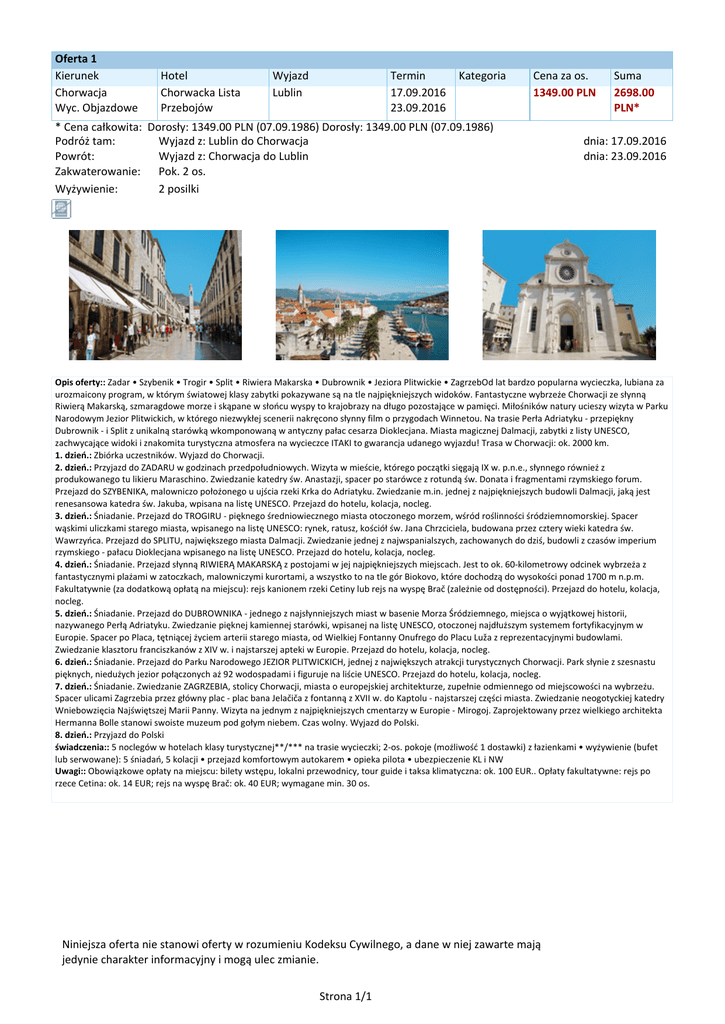 Oferta 1 Kierunek Chorwacja Wyc. Objazdowe Hotel Chorwacka Lista Przebojów Wyjazd Lublin Termin 17.09.2016 23.09.2016 Kategoria Cena za os. 1349.00 PLN * Cena całkowita: Dorosły: 1349.00 PLN (07.09.1986) Dorosły: 1349.00 PLN (07.09.1986) Podróż tam: Wyjazd z: Lublin do Chorwacja Powrót: Wyjazd z: Chorwacja do Lublin Zakwaterowanie: Pok. 2 os. Wyżywienie: 2 posilki Suma 2698.00 PLN* dnia: 17.09.2016 dnia: 23.09.2016 Opis oferty:: Zadar • Szybenik • Trogir • Split • Riwiera Makarska • Dubrownik • Jeziora Plitwickie • ZagrzebOd lat bardzo popularna wycieczka, lubiana za urozmaicony program, w którym światowej klasy zabytki pokazywane są na tle najpiękniejszych widoków. Fantastyczne wybrzeże Chorwacji ze słynną Riwierą Makarską, szmaragdowe morze i skąpane w słońcu wyspy to krajobrazy na długo pozostające w pamięci. Miłośników natury ucieszy wizyta w Parku Narodowym Jezior Plitwickich, w którego niezwykłej scenerii nakręcono słynny film o przygodach Winnetou. Na trasie Perła Adriatyku - przepiękny Dubrownik - i Split z unikalną starówką wkomponowaną w antyczny pałac cesarza Dioklecjana. Miasta magicznej Dalmacji, zabytki z listy UNESCO, zachwycające widoki i znakomita turystyczna atmosfera na wycieczce ITAKI to gwarancja udanego wyjazdu! Trasa w Chorwacji: ok. 2000 km. 1. dzień.: Zbiórka uczestników. Wyjazd do Chorwacji. 2. dzień.: Przyjazd do ZADARU w godzinach przedpołudniowych. Wizyta w mieście, którego początki sięgają IX w. p.n.e., słynnego również z produkowanego tu likieru Maraschino. Zwiedzanie katedry św. Anastazji, spacer po starówce z rotundą św. Donata i fragmentami rzymskiego forum. Przejazd do SZYBENIKA, malowniczo położonego u ujścia rzeki Krka do Adriatyku. Zwiedzanie m.in. jednej z najpiękniejszych budowli Dalmacji, jaką jest renesansowa katedra św. Jakuba, wpisana na listę UNESCO. Przejazd do hotelu, kolacja, nocleg. 3. dzień.: Śniadanie. Przejazd do TROGIRU - pięknego średniowiecznego miasta otoczonego morzem, wśród roślinności śródziemnomorskiej. Spacer wąskimi uliczkami starego miasta, wpisanego na listę UNESCO: rynek, ratusz, kościół św. Jana Chrzciciela, budowana przez cztery wieki katedra św. Wawrzyńca. Przejazd do SPLITU, największego miasta Dalmacji. Zwiedzanie jednej z najwspanialszych, zachowanych do dziś, budowli z czasów imperium rzymskiego - pałacu Dioklecjana wpisanego na listę UNESCO. Przejazd do hotelu, kolacja, nocleg. 4. dzień.: Śniadanie. Przejazd słynną RIWIERĄ MAKARSKĄ z postojami w jej najpiękniejszych miejscach. Jest to ok. 60-kilometrowy odcinek wybrzeża z fantastycznymi plażami w zatoczkach, malowniczymi kurortami, a wszystko to na tle gór Biokovo, które dochodzą do wysokości ponad 1700 m n.p.m. Fakultatywnie (za dodatkową opłatą na miejscu): rejs kanionem rzeki Cetiny lub rejs na wyspę Brač (zależnie od dostępności). Przejazd do hotelu, kolacja, nocleg. 5. dzień.: Śniadanie. Przejazd do DUBROWNIKA - jednego z najsłynniejszych miast w basenie Morza Śródziemnego, miejsca o wyjątkowej historii, nazywanego Perłą Adriatyku. Zwiedzanie pięknej kamiennej starówki, wpisanej na listę UNESCO, otoczonej najdłuższym systemem fortyfikacyjnym w Europie. Spacer po Placa, tętniącej życiem arterii starego miasta, od Wielkiej Fontanny Onufrego do Placu Luža z reprezentacyjnymi budowlami. Zwiedzanie klasztoru franciszkanów z XIV w. i najstarszej apteki w Europie. Przejazd do hotelu, kolacja, nocleg. 6. dzień.: Śniadanie. Przejazd do Parku Narodowego JEZIOR PLITWICKICH, jednej z największych atrakcji turystycznych Chorwacji. Park słynie z szesnastu pięknych, niedużych jezior połączonych aż 92 wodospadami i figuruje na liście UNESCO. Przejazd do hotelu, kolacja, nocleg. 7. dzień.: Śniadanie. Zwiedzanie ZAGRZEBIA, stolicy Chorwacji, miasta o europejskiej architekturze, zupełnie odmiennego od miejscowości na wybrzeżu. Spacer ulicami Zagrzebia przez główny plac - plac bana Jelačiča z fontanną z XVII w. do Kaptolu - najstarszej części miasta. Zwiedzanie neogotyckiej katedry Wniebowzięcia Najświętszej Marii Panny. Wizyta na jednym z najpiękniejszych cmentarzy w Europie - Mirogoj. Zaprojektowany przez wielkiego architekta Hermanna Bolle stanowi swoiste muzeum pod gołym niebem. Czas wolny. Wyjazd do Polski. 8. dzień.: Przyjazd do Polski świadczenia:: 5 noclegów w hotelach klasy turystycznej**/*** na trasie wycieczki; 2-os. pokoje (możliwość 1 dostawki) z łazienkami • wyżywienie (bufet lub serwowane): 5 śniadań, 5 kolacji • przejazd komfortowym autokarem • opieka pilota • ubezpieczenie KL i NW Uwagi:: Obowiązkowe opłaty na miejscu: bilety wstępu, lokalni przewodnicy, tour guide i taksa klimatyczna: ok. 100 EUR.. Opłaty fakultatywne: rejs po rzece Cetina: ok. 14 EUR; rejs na wyspę Brač: ok. 40 EUR; wymagane min. 30 os. Niniejsza oferta nie stanowi oferty w rozumieniu Kodeksu Cywilnego, a dane w niej zawarte mają jedynie charakter informacyjny i mogą ulec zmianie. Strona 1/1 Powered by TCPDF (www.tcpdf.org)