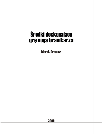 Środki doskonalące grę nogą bramkarza Marek Dragosz 2009 Liczba zawodników: 4 Sprzęt: 2 znaczniki, 1 piłka Przebieg ćwiczenia: Zawodnicy ustawieni jak na rysunku. Ćwiczenie rozpoczyna zawodnik A wykonując krótkie podanie po podłożu do partnera C (1). Ten z kolei odgrywa również po podłożu z powrotem do A (2), który długim podaniem przekazuje piłkę zawodnikowi B (3). Tam wykonuje on z partnerem taką samą kombinację podań jak poprzednia para (4 i 5) i powtarza cykl. Odmiany: Różne formy podań Podania na różną ilość kontaktów Po wykonaniu kombinacji podań bramkarze w parach zamieniają się miejscami Środki doskonalące grę nogą bramkarza Marek Dragosz Liczba zawodników: 4 Sprzęt: 8 znaczników, 1 piłka Przebieg ćwiczenia: Zawodnicy ustawieni jak na rysunku. Ćwiczenie rozpoczyna zawodnik z wnętrza jednego z utworzonych kwadratów wykonując długie podanie po do partnera w przeciwległym kwadracie. Ten podobnie wykonuje zwrotne podanie w kierunku drugiego kwadratu. Po wykonaniu podań bramkarze w kwadratach zamieniają się miejscami z partnerami stojącymi na zewnątrz. Odmiany: Różne formy podań Podania na różną ilość kontaktów Przyjęcie wewnątrz kwadratu, wyprowadzenie piłki na zewnątrz i podanie Środki doskonalące grę nogą bramkarza Marek Dragosz Liczba zawodników: 4 Sprzęt: 4 znaczniki, 1 piłka Przebieg ćwiczenia: Zawodnicy ustawieni jak na rysunku. Ćwiczenie rozpoczyna zawodnik C wykonując atak na zawodnika A posiadającego piłkę. Bramkarz wykonuje podanie do D (1) i obiegając atakującego go C wychodzi na wolne pole. D zagrywa z pierwszej piłki do D (2) a ten również pierwszym kontaktem zagrywa do B (3) i wykonuje atak w jego kierunku. B podaje do D (4), który zmienił swoją pozycję a ten odgrywa piłkę analogicznie do pierwszej kombinacji podań (5) po czym B zagrywa do C (6). Zawodnicy A, B i C pozostają w ruchu w pomiędzy swoimi znacznikami, zawodnik D zmienia pozycje pomiędzy swoimi. Odmiany: Różne formy podań Podania na różną ilość kontaktów Podania w ruchu do piłki Podania poprzedzone ruchem zwodnym Środki doskonalące grę nogą bramkarza Marek Dragosz Liczba zawodników: 4 Sprzęt: 4 znaczniki, 2 piłki Przebieg ćwiczenia: Zawodnicy ustawieni jak na rysunku. Ćwiczenie rozpoczyna dwóch zawodników równocześnie podając do partnerów po swojej prawej stronie (1). Ci wykonują podanie zwrotne (2), po którym następują podania prostopadłe (3). Po nich cykl się powtarza. Odmiany: Różne formy podań Podania na różną ilość kontaktów Podania w ruchu do piłki Podania poprzedzone ruchem zwodnym Środki doskonalące grę nogą bramkarza Marek Dragosz Liczba zawodników: 4 lub 3 i trener Sprzęt: 4 znaczniki, 2 piłki Przebieg ćwiczenia: Zawodnicy ustawieni jak na rysunku. Ćwiczenie rozpoczyna T podając do ćwiczącego A (1). Jego zadaniem jest odegranie piłki do zawodnika nie posiadającego piłki z zastrzeżeniem, że nie może to być podanie zwrotne. W sytuacji pokazanej na rysunku A musi zatem podać do B (2). Drugą piłkę do A podaje C (3). Bramkarz A musi więc kolejne podanie wykonać do T (4) Odmiany: Różne formy podań Podania na różną ilość kontaktów Środki doskonalące grę nogą bramkarza Marek Dragosz Liczba zawodników: 4 Sprzęt: 4 znaczniki, 2 piłki Przebieg ćwiczenia: W polu o wymiarach 20 x 40 m bramkarze ustawieni jak na rysunku. Ćwiczenie rozpoczynają równocześnie C i D wykonując podania odpowiednio do A i B (1), którzy przyjmują piłkę (2) i po wykonaniu podań zwrotnych (3) zamieniają się miejscami (4). Odmiany: Różne formy podań Podania na różną ilość kontaktów Podania w ruchu do piłki Środki doskonalące grę nogą bramkarza Marek Dragosz Liczba zawodników: 2 Sprzęt: 2 bramki, 1 piłka Przebieg ćwiczenia: W polu o wymiarach 20 x 15 m bramkarze ustawieni jak na rysunku. Ćwiczenie rozpoczyna A wykonując podanie do B (1), który przyjmuje piłkę (2) i wykonuje podanie zwrotne (3). Odmiany: Różne formy podań Podania na różną ilość kontaktów Podania w ruchu do piłki Środki doskonalące grę nogą bramkarza Marek Dragosz Liczba zawodników: 4 lub 3 i trener Sprzęt: 4 znaczniki, 1 piłka Przebieg ćwiczenia: W polu o wymiarach 20 x 40 m bramkarze ustawieni jak na rysunku. Ćwiczenie rozpoczyna T wykonując podanie do jednego z ćwiczących bramkarzy, w dowolnie wybrana przestrzeń pomiędzy znacznikami. Zadaniem ćwiczącego jest reakcja na sposób podania i miejsce, w które zostanie ono wykonane. Bramkarz po przyjęciu wykonuje podanie zwrotne do T. Odmiany: Różne formy podań Środki doskonalące grę nogą bramkarza Marek Dragosz Liczba zawodników: 3 Sprzęt: 2 bramki, 1 piłka Przebieg ćwiczenia: W polu o wymiarach 20 x 30 m bramkarze ustawieni jak na rysunku. Ćwiczenie rozpoczyna A wykonując podanie do B (1). Ten wykonuje podanie zwrotne do A (2), który po opanowaniu piłki (3) podaje do C (4). Odmiany: Różne formy podań Podania na różną ilość kontaktów Podania w ruchu do piłki B po podaniu (2) wykonuje atak na A Środki doskonalące grę nogą bramkarza Marek Dragosz Liczba zawodników: 3 Sprzęt: 2 bramki, 1 piłka Przebieg ćwiczenia: W polu o wymiarach 30 x 30 m bramkarze ustawieni jak na rysunku. Ćwiczenie rozpoczyna A wykonując podanie do B (1). Ten po opanowaniu piłki (2) zagrywa do C (3). Odmiany: Różne formy podań Podania na różną ilość kontaktów Podania w ruchu do piłki B po podaniu (1) wykonuje atak na A Środki doskonalące grę nogą bramkarza Marek Dragosz Liczba zawodników: 4 lub 3 i trener Sprzęt: 2 bramki, 1 piłka Przebieg ćwiczenia: W polu o wymiarach 40 x 40 m bramkarze ustawieni jak na rysunku. Ćwiczenie rozpoczyna T wykonując podanie do A (1). Ten po opanowaniu piłki (2) zagrywa do B (3), który znajduje się w ruchu po uprzednio wykonanym kilkumetrowym starcie (3). B z pierwszej piłki zagrywa do C (4), który po opanowaniu piłki przekazuje j