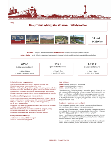 VVO Kolej Transsyberyjska Moskwa – Władywostok 14 dni 9.259 km Moskwa – rosyjska stolica i metropolia · Władywostok – największy rosyjski port na Pacyfiku Jezioro Bajkał – perła Syberii, najgłębsze i najstarsze jezioro na świecie, podróż pociągiem wzdłuż brzegu Bajkału 625 € 995 € 1.930 € (pakiet ekonomiczny) (pakiet standardowy) (pakiet komfortowy) -> bilety 3 klasy -> bilety 2 klasy -> bilety 1 klasy -> hostele i kwatery prywatne -> hostele i 3* hotele -> dobre 3* i 4* hotele Usługi wliczone w ceny pakietów: Klasy biletowe: ☑ Transsyberyjski Pakiet Podróżnika (informacje praktyczne) ☑ pakiet map i planów miast przydatnych w trasie ☑ bilety z Moskwy do Władywostoku zgodnie z trasą i wybranym pakietem ☑ 6 noclegów w pok. 2-osobowych zgodnie z trasą i wybranym pakietem ☑ śniadania w kwaterach prywatnych i hotelach (hostele bez śniadań) ☑ wiza rosyjska, w tym pośrednictwo wizowe, opłata konsularna i voucher 3 klasa = wagon sypialny bez przedziałów 2 klasa = przedział sypialny 4-osobowy 1 klasa = przedział sypialny 2-osobowy Dodatkowo do każdego pakietu można zamówić: ☑ bilet lotniczy do Moskwy i powrotny z Władywostoku (od 460 € w obie strony w zależności od miejsca wylotu, daty zamówienia i daty podróży) ☑ dojazd do Moskwy + powrót z Władywostoku drogą lądową (od ok. 350 € w obie strony) ☑ transfery z/na dworzec kolejowy i lotnisko, w tym transfer do Listwianki = 130 km w obie strony (195 €) ☑ zwiedzanie z lokalnymi przewodnikami (405 €) - program poniżej ☑ ubezpieczenie od kosztów leczenia za granicą (24 €) ☑ ubezpieczenie od kosztów rezygnacji (2,4% ceny imprezy) Koszty dodatkowe od osoby: ✗ wyżywienie podczas podróży pociągiem ✗ inne nie wymienione wyżej posiłki Pakiet komfortowy: Pociągi posiadające w składzie wagony 1 klasy nie kursują codziennie. Dlatego jeżeli w wybranym przez Państwa terminie na danym odcinku trasy nie będzie kursował pociąg z dostępnymi wagonami 1 klasy i zmiana terminu podróży nie będzie możliwa, wówczas za dopłatą może zostać wykupiony cały przedział 2 klasy do wyłącznej dyspozycji dwójki osób. Zwiedzanie z lokalnymi przewodnikami: Cena zwiedzania obejmuje bilety wstępu, transport, obsługę lokalnego przewodnika w wybranym języku i następujące atrakcje: Moskwa: Kreml, Plac Czerwony i okolice, ulica Arbat i najciekawsze stacje metra; Irkuck: główne zabytki miasta; Listwianka: skansen Talcy i Muzeum Bajkalskie; Władywostok: główne zabytki miasta, w tym port. Uwaga – lokalni przewodnicy są dostępni w językach: angielskim, niemieckim, rosyjskim i francuskim. Przewodnicy towarzyszą Państwu wyłącznie podczas zwiedzania (nie w pociągach). Uwaga – jeżeli nie zamówią Państwo zwiedzania i transferów w podanych cenach, wówczas należy je sobie zorganizować we własnym zakresie. © 2005-2011 EYAND TRAVEL Czeka Państwa około 2-tygodniowa podróż, w tym przejazd liniowymi pociągami Kolei Transsyberyjskiej. Oznacza to 9.259 km ciekawej trasy prowadzącej przez Syberię, wysokogórskie krajobrazy Uralu, liczne syberyjskie metropolie i wioski. Przez około 100 km trasa prowadzi wzdłuż brzegu Bajkału – wybraliśmy takie połączenie kolejowe, które umożliwia podziwianie tego przepięknego odcinka w ciągu dnia. Od Irkucka zaczyna się jeden z najciekawszych i najbardziej zmiennych krajobrazowo odcinków trasy Kolei Transsyberyjskiej o długości około 4.000 km. Trasa prowadzi początkowo przez piękną i ciekawą rosyjską Republikę Buriacji, a następnie przez niemalże niezaludnione tereny Dalekiego Wschodu. To tutaj zaczynają się największe serpentyny, dzięki którym możliwe jest fotografowanie pociągu na tle pięknych krajobrazów. Pociąg przejeżdża przez liczący ponad 2,5 km most na rzece Amur – najdłuższy na trasie Kolei Transsyberyjskiej. W pociągu będzie okazja do zawarcia nowych ciekawych znajomości, zapoznania się z inną kulturą i zrobienia pięknych zdjęć. Na peronach stacji pośrednich będą Państwo mieli okazję spróbowania świeżych regionalnych przysmaków. Podczas podróży przewidziany jest postój w Irkucku oraz pobyt na łonie natury – nad Jeziorem Bajkał w miejscowości Listwianka, gdzie będzie możliwość skosztowania bajkalskiego specjału – wędzonej ryby omul i skorzystania z tradycyjnej sauny rosyjskiej – banji. Przebieg trasy Moskwa 9 dzień: Wczesnym rankiem odjazd pociągiem do Władywostoku. Przez około 2 godziny pociąg jedzie wzdłuż Jeziora Bajkał! 1 dzień: Przyjazd do Moskwy, nocleg. Transsib: 10 dzień: Podróż pociągiem. 2 dzień: Zwiedzanie Kremla, Placu Czerwonego i okolic oraz słynnej historycznej ulicy Arbat znanej z piosenek Bułata Okudżawy, przy której zamieszkiwał także Aleksander Puszkin. Wycieczka do najciekawszych stacji metra, podczas której zobaczą Państwo wybrane najciekawsze stacje i przekonają się dlaczego określane są one mianem podziemnych pałaców. Władywostok 3 dzień: Czas wolny. O godz. 13:35 (opcja komfortowa: późnym wieczorem) odjazd pociągiem do Irkucka. Transsib: 4-6 dzień: Podróż pociągiem. 12 dzień: Około południa przyjazd do Władywostoku (w wypadku opcji komfortowej przyjazd o godz. 06:30 rano), transfer z dworca, nocleg. 13 dzień: Zwiedzanie Władywostoku, w tym największego rosyjskiego portu morskiego na Pacyfiku wraz z położoną pośród wzgórz zatoką Złoty Róg. Nocleg we Władywostoku. 14 dzień: Powrót. Terminy, uwagi Irkuck, Listwianka, Jezioro Bajkał 7 dzień: Przyjazd rano do Irkucka. Zwiedzanie Irkucka i przejazd do Listwianki położonej nad Jeziorem Bajkał (65 km). Jeżeli nie zamówią Państwo dodatkowo transferów, wówczas do Listwianki można dojechać i wrócić we własnym zakresie autobusem (bilet kosztuje około 2-3 € w jedną stronę). Jeżeli zamówią Państwo zwiedzanie z przewodnikiem, wówczas po drodze do Listwianki zwiedzą Państwo prze