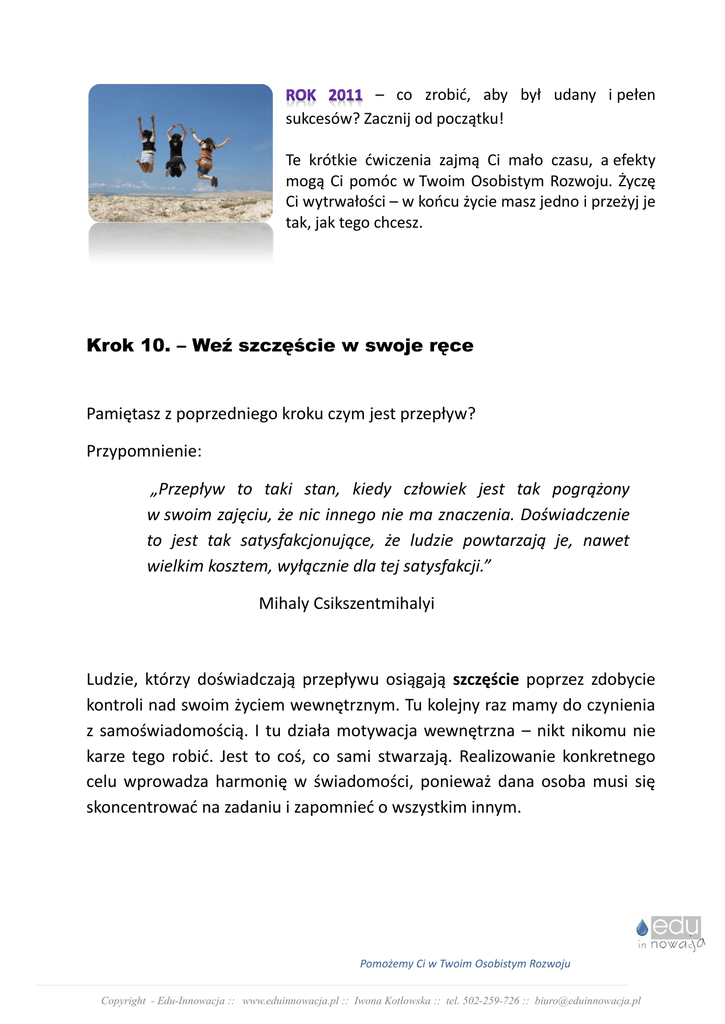 – co zrobić, aby był udany i pełen sukcesów? Zacznij od początku! Te krótkie ćwiczenia zajmą Ci mało czasu, a efekty mogą Ci pomóc w Twoim Osobistym Rozwoju. Życzę Ci wytrwałości – w końcu życie masz jedno i przeżyj je tak, jak tego chcesz. Krok 10. – Weź szczęście w swoje ręce Pamiętasz z poprzedniego kroku czym jest przepływ? Przypomnienie: „Przepływ to taki stan, kiedy człowiek jest tak pogrążony w swoim zajęciu, że nic innego nie ma znaczenia. Doświadczenie to jest tak satysfakcjonujące, że ludzie powtarzają je, nawet wielkim kosztem, wyłącznie dla tej satysfakcji.” Mihaly Csikszentmihalyi Ludzie, którzy doświadczają przepływu osiągają szczęście poprzez zdobycie kontroli nad swoim życiem wewnętrznym. Tu kolejny raz mamy do czynienia z samoświadomością. I tu działa motywacja wewnętrzna – nikt nikomu nie karze tego robić. Jest to coś, co sami stwarzają. Realizowanie konkretnego celu wprowadza harmonię w świadomości, ponieważ dana osoba musi się skoncentrować na zadaniu i zapomnieć o wszystkim innym. Pomożemy Ci w Twoim Osobistym Rozwoju Copyright - Edu-Innowacja :: www.eduinnowacja.pl :: Iwona Kotłowska :: tel. 502-259-726 :: [email protected] Osoba, która uzyskała kontrolę nad energią psychiczną i przekierowała ją w świadomie wybrane cele, z pewnością stanie się bardziej złożoną jednostką. Rozwijając swoje umiejętności, podejmując wyzwania, może stać się prawdziwie niezwykłą indywidualnością. I odnajduje swoje szczęście. A propos szczęścia: „Odkryłem” mianowicie, że szczęście nie jest czymś, co się wydarza. Nie jest wynikiem uśmiechu losu ani dziełem przypadku. Nie można go kupić za pieniądze ani uzyskać dzięki władzy. Nie zależy od wydarzeń zewnętrznych, ale raczej od naszych interpretacji. Szczęście jest stanem, do którego należy się przygotować, a gdy się go osiągnie, trzeba go starannie kultywować. Każdy z nas musi bronić własnego szczęścia. Ludzie, kontrolowania którzy posiądą wewnętrznych umiejętność doświadczeń, będą w stanie sami decydować o jakości swojego życia – a to jest stanem najbliższym szczęściu, jaki możemy osiągnąć.” Mihaly Csikszentmihalyi Pomożemy Ci w Twoim Osobistym Rozwoju Copyright - Edu-Innowacja :: www.eduinnowacja.pl :: Iwona Kotłowska :: tel. 502-259-726 :: [email protected] Zapraszam do refleksyjnego ćwiczenia, które szybko oceni na ile masz szczęście w swoich rękach: Skala satysfakcji z życia Zastanów się, do jakiego stopnia zgadasz się z poniższymi stwierdzeniami. Skorzystaj z punktacji: 7- zdecydowanie się zgadzam, 6-zgadzam się, 5-raczej się zgadzam, 4 -trudno powiedzieć, 3-raczej się nie zgadzam,2- nie zgadzam się, 1- zdecydowanie się nie zgadzam Moje życie jest zbliżone do ideału Warunki mojego życia są wspaniałe Jestem zadowolony z życia Jak dotąd osiągnąłem w życiu to, czego pragnąłem Gdybym mógł żyć jeszcze raz, prawie niczego bym nie zmienił. Podlicz punkty. 30-35 – jesteś skrajnie zadowolony ze swojego życia 25-29 – bardzo zadowolony 20-24 – dość zadowolony 15-19 – raczej niezadowolony 10-14 – niezadowolony 5-9 – bardzo niezadowolony1 Zapraszamy na naszą stronę na Facebooku 1 Źródło: „Style i Charaktery”, nr 3/2007, Barbara Kożusznik Pomożemy Ci w Twoim Osobistym Rozwoju Copyright - Edu-Innowacja :: www.eduinnowacja.pl :: Iwona Kotłowska :: tel. 502-259-726 :: [email protected]
