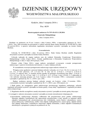 DZIENNIK URZĘDOWY WOJEWÓDZTWA MAŁOPOLSKIEGO Kraków, dnia 3 sierpnia 2016 r. Elektronicznie podpisany przez: Monika Majsak-Białczyk; MUW Poz. 4639 Data: 2016-08-03 14:51:37 Rozstrzygnięcie nadzorcze Nr WN-II.4131.1.28.2016 Wojewody Małopolskiego z dnia 2 sierpnia 2016 r. Działając na podstawie art. 91 ust. 1 ustawy z dnia 8 marca 1990 r. o samorządzie gminnym (tj. Dz.U. z 2016 r., poz. 446) stwierdza się nieważność w całości uchwały Rady Gminy Bochnia Nr XVIII/188/16 z dnia 22 czerwca 2016 r. w sprawie uchwalenia regulaminu utrzymania czystości i porządku na terenie Gminy Bochnia. Uzasadnienie Uchwałą Nr XVIII/188/16 z dnia 22 czerwca 2016 r. Rada Gminy Bochnia ustaliła Regulamin utrzymania czystości i porządku na terenie Gminy Bochnia. Uchwała wpłynęła do organu nadzoru oraz do redakcji Dziennika Urzędowego Województwa Małopolskiego w dniu 4 lipca 2016 r. Została opublikowana w Dzienniku Urzędowym Województwa Małopolskiego w dniu 11 lipca 2016 pod poz. 4164. Pismem z dnia 5 lipca 2016 r. organ nadzoru zawiadomił o wszczęciu z urzędu postępowania nadzorczego w sprawie stwierdzenia nieważności, w części, badanej uchwały. W uzasadnieniu wszczęcia postępowania nadzorczego organ nadzoru wskazał, że: Wstępna ocena zgodności z prawem badanej uchwały wykazała, że § 3 ust. 3 lit. b) i c) oraz ust. 6 i 8, § 5, § 6, § 7 tiret pierwsze, § 9, § 11 ust. 1 lit. f) oraz ust. 13, § 14 ust. 1, § 16 ust. 9, § 18 ust. 4, § 19 ust. 3 w zakresie słów „w terminie dwóch tygodni od momentu stwierdzenia tego faktu”, § 20 ust. 2, § 21, § 23 ust. 3 lit. b), § 25 ust. 1 pkt 1 i 2, § 26 ust. 2, § 27, § 29 ust. 1 oraz § 30 ust. 2 i 3 załącznika nr 1 do uchwały naruszają przepisy art. 4 ust. 2 ustawy z dnia 13 września 1996 r. o utrzymaniu czystości i porządku w gminach (tj. Dz. U. z 2016 r. poz. 250). Będący podstawą prawną badanej uchwały przepis art. 4 ustawy z dnia 13 września 1996 r. o utrzymaniu czystości i porządku w gminach (tj. Dz. U. z 2016 r. poz. 250) stanowi, że: 1. Rada gminy, po zasięgnięciu opinii państwowego powiatowego inspektora sanitarnego, uchwala regulamin utrzymania czystości i porządku na terenie gminy, zwany dalej "regulaminem"; regulamin jest aktem prawa miejscowego. 2. Regulamin określa szczegółowe zasady utrzymania czystości i porządku na terenie gminy dotyczące: 1) wymagań w zakresie utrzymania czystości i porządku na terenie nieruchomości obejmujących: a) prowadzenie selektywnego zbierania i odbierania lub przyjmowania przez punkty selektywnego zbierania odpadów komunalnych lub zapewnienie przyjmowania w inny sposób co najmniej takich odpadów komunalnych jak: przeterminowane leki i chemikalia, zużyte baterie i akumulatory, zużyty sprzęt elektryczny i elektroniczny, meble i inne odpady wielkogabarytowe, zużyte opony, odpady zielone oraz odpady budowlane i rozbiórkowe stanowiące odpady komunalne, a także odpadów komunalnych określonych w przepisach wydanych na podstawie art. 4a, Dziennik Urzędowy Województwa Małopolskiego –2– Poz. 4639 b) uprzątanie błota, śniegu, lodu i innych zanieczyszczeń z części nieruchomości służących do użytku publicznego, c) mycie i naprawy pojazdów samochodowych poza myjniami i warsztatami naprawczymi; 2) rodzaju i minimalnej pojemności pojemników przeznaczonych do zbierania odpadów komunalnych na terenie nieruchomości oraz na drogach publicznych, warunków rozmieszczania tych pojemników i ich utrzymania w odpowiednim stanie sanitarnym, porządkowym i technicznym, przy uwzględnieniu: a) średniej ilości odpadów komunalnych wytwarzanych w gospodarstwach domowych bądź w innych źródłach, b) liczby osób korzystających z tych pojemników; 3) częstotliwości i sposobu pozbywania się odpadów komunalnych i nieczystości ciekłych z terenu nieruchomości oraz z terenów przeznaczonych do użytku publicznego; 4) (uchylony) 5) innych wymagań wynikających z wojewódzkiego planu gospodarki odpadami; 6) obowiązków osób utrzymujących zwierzęta domowe, mających na celu ochronę przed zagrożeniem lub uciążliwością dla ludzi oraz przed zanieczyszczeniem terenów przeznaczonych do wspólnego użytku; 7) wymagań utrzymywania zwierząt gospodarskich na terenach wyłączonych z produkcji rolniczej, w tym także zakazu ich utrzymywania na określonych obszarach lub w poszczególnych nieruchomościach; 8) wyznaczania obszarów podlegających obowiązkowej deratyzacji i terminów jej przeprowadzania. 2a. Regulamin może wprowadzić obowiązek selektywnego zbierania i odbierania odpadów komunalnych innych niż wymienione w ust. 2 pkt 1 lit. a. 3. Rada gminy jest obowiązana dostosować regulamin do wojewódzkiego planu gospodarki odpadami w terminie 6 miesięcy od dnia uchwalenia tego planu. Przepis ten stanowi delegację ustawową dla wydania aktu prawa niższej rangi, ściśle określając zakres spraw, które mogą być przedmiotem unormowania uchwały rady gminy. Z jednej strony nie daje on zatem radzie gminy prawa ani do stanowienia aktów prawa miejscowego regulujących zagadnienia inne niż wymienione w tym przepisie, ani podejmowania regulacji w inny sposób niż wskazany przez ustawodawcę, gdyż oznaczałoby to wykroczenie poza zakres delegacji ustawowej. Konieczność uszczegółowienia ogólnych zapisów ustawowych nie może prowadzić do objęcia regulacją podustawową kwestii, do których upoważnienia wynikającego z przepisów ustawy organ gminy nie posiada (por. wyrok NSA z dnia 8 listopada 2012 r., sygn. akt II OSK 2012/12, wyroki WSA w Łodzi sygn. akt II SA/Łd 746/15 i 549/15 orzeczenia dostępne w internetowej Centralnej Bazie Orzeczeń Sądów Administracyjnych pod adresem: http://orzeczenia.nsa.gov.pl). Z drugiej strony regulacja art. 4 ust. 2 ustawy ma przy tym charakter wyczerpujący, tj. uchwalając na jej podstawie regulamin czystości i porządku, rada gminy powinna zawrzeć w nim postanowi