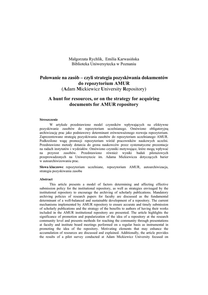 Małgorzata Rychlik, Emilia Karwasińska Biblioteka Uniwersytecka w Poznaniu Polowanie na zasób – czyli strategia pozyskiwania dokumentów do repozytorium AMUR (Adam Mickiewicz University Repository) A hunt for resources, or on the strategy for acquiring documents for AMUR repository Streszczenie W artykule przedstawiono model czynników wpływających na efektywne pozyskiwanie zasobów do repozytorium uczelnianego. Omówiono obligatoryjną archiwizację prac jako podstawowy determinant zrównoważonego rozwoju repozytorium. Zaprezentowano strategię pozyskiwania zasobów do repozytorium uczelnianego AMUR. Podkreślono wagę promocji repozytorium wśród pracowników naukowych uczelni. Przedstawiono metody dotarcia do grona naukowców przez systematyczne prezentacje na radach instytutów i wydziałów. Omówiono czynniki motywujące, które mogą wpływać na przyrost zasobów. Przedstawiono również wyniki badań pilotażowych przeprowadzonych na Uniwersytecie im. Adama Mickiewicza dotyczących barier w autoarchiwizowaniu prac. Słowa kluczowe: repozytorium uczelniane, repozytorium AMUR, autoarchiwizacja, strategia pozyskiwania zasobu Abstract This article presents a model of factors determining and affecting effective submission policy for the institutional repository, as well as strategies envisaged by the institutional repository to encourage the archiving of scholarly publications. Mandatory archiving policies of research papers for faculty are discussed as the fundamental determinant of a well-balanced and sustainable development of a repository. The current mechanisms implemented by AMUR repository to ensure accurate and timely submission of scholarly publications and the strategy of the benefits to authors of having their works included in the AMUR institutional repository are presented. The article highlights the significance of promotion and popularization of the idea of a repository at the research community level and presents methods for reaching the community through presentations at faculty and institute board meetings performed on a regular basis as instrumental in promoting the idea of the repository. Motivating elements that may enhance the accumulation of resources are discussed and explained. Additionally, the article provides the results of a pilot survey conducted at Adam Mickiewicz University focused on 184 Otwarte zasoby wiedzy – nowe zadania uczelni i bibliotek w rozwoju komunikacji naukowej psychological and structural barriers in knowledge-sharing behavior and self-archiving practices. Keywords: institutional repository, AMUR repository, self-archiving practices, resource development strategy Wstęp Obecnie na świecie są 1943 repozytoria różnego typu1. Ich prężny rozwój jest ściśle skorelowany z przyrostem zasobów. Kluczem do sukcesu i tym samym zrównoważonego rozwoju repozytorium jest najczęściej obligatoryjna autoarchiwizacja prac. Jest jednak część repozytoriów dziedzinowych (ArXiv, RePec, E-LIS), które egzystują znakomicie bez żadnych narzuconych rozporządzeń dotyczących napływu prac. Należy je jednak traktować bardziej w kategorii ewenementu niż reguły. Właśnie pozyskiwanie zasobu jest obecnie największym wyzwaniem, przed którym stoją repozytoria. Autorzy z krajów, w których repozytoria zaczęły powstawać wcześniej niż w Polsce, donoszą o problemach z napływem prac do archiwów cyfrowych. Trudności nie ominęły repozytoriów tworzonych na znakomitych uczelniach (Cornell University w USA)2. W pracy Gerarda van Westrienena oraz Clifforda A. Lyncha autorzy przedstawili sytuację stosunkowo niewielkiego przyrostu dokumentów w repozytoriach ze szczególnym uwzględnieniem Europy3. Oczywiste jest, że sama implementacja systemu nie wystarczy. Potrzebne jest ogromne zaangażowanie bibliotekarzy w budowę strategii pozyskiwania zasobów, we współpracę z otoczeniem bibliotek, z naukowcami, władzami uczelni. Być może przyniesie ono rezultaty w postaci dynamicznie rozwijającego się repozytorium. Strategia pozyskiwania zasobów do repozytorium Wprowadzenie obligatoryjności jest najbardziej efektywną metodą służącą systematycznemu zapełnianiu się repozytorium. Badania pokazują, że jeżeli autoarchiwizacja jest wymogiem, to aż 80% naukowców archiwizuje swoje prace4. 1 2 3 4 Zob. OpenDOAR [on-line]. [Dostęp 20.04.2011], http://opendoar.org/onechart.php?cID=&ctID= &rtID=&clID=&lID=&potID=&rSoftWareName=&search=&groupby=c.cContinent&orderby=Tal ly%20DESC&charttype=pie&width=600&height=300&caption=Proportion of Repositories by Continent – Worldwide. P.M. Davis, M.J. Connoly, Institutional Repositories. Evaluating the Reasons for Non-use of Cornell University's Installation of DSpace. D-Lib Magazine [on-line]. 2007, Vol. 13, nr 3/4, [Dostęp 20.04.2011], http://dlib.org/dlib/march07/davis/03davis.html. G. van Westrienen, C.A. Lynch, Academic Institutional Repositories Deployment Status in 13 Nations as of Mid 2005. D-Lib Magazin [on-line]. 2005, Vol. 11, nr 9. [Dostęp 27.04.2011], http://www.dlib.org/dlib/september05/westrienen/09westrienen.html. A. Swan, S. Brown, Authors and open access publishing. Learned Publishing [on-line]. 2004, Vol. 17. [Dostęp 29.04.2011], http://cogprints.org/4123/. Sesja B. Otwarte zasoby wiedzy – znaczenie, organizacja, zarządzanie 185 Jeżeli wprowadzenie całkowitej obowiązkowej archiwizacji z różnych powodów nie jest możliwe (prawo autorskie, brak zgody władz uczelni), to ważnym aspektem jest przygotowanie i wdrożenie strategii pozyskiwania zasobów. Repozytorium pozostawione samo sobie, bez przemyślanych działań na rzecz jego rozwoju, pozostanie puste i na pewno nie stanie się wizytówką uczelni. Dlatego warto przyjrzeć się także pozostałym kwestiom, takim jak: jasno określona polityka funkcjonowania repozytorium, szeroka promocja i informacja, rozpoznanie motywacji zachęcających do deponowania prac i eliminowanie barier zniechęcających. Wszys
