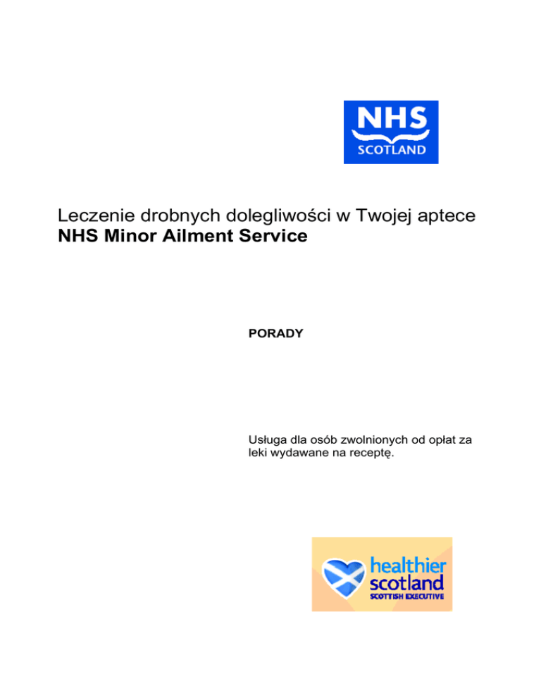 Leczenie drobnych dolegliwości w Twojej aptece NHS Minor Ailment Service PORADY Usługa dla osób zwolnionych od opłat za leki wydawane na receptę. Wszyscy konsumenci są dla nas ważni Broszura opracowana przez szkockie Ministerstwo Zdrowia, przy współudziale Health Rights Information Scotland, projektu realizowanego przez Scottish Consumer Council. Leczenie drobnych dolegliwości w Twojej aptece - NHS Minor Ailment Service Usługa dla osób zwolnionych od opłat za leki wydawane za receptę. Do kogo skierowana jest ta broszura? Niniejsza broszura adresowana jest do osób uprawnionych do bezpłatnych recept. Na czym polega ta usługa? • Każdy może udać się do apteki po poradę lub po zakup leku na drobne dolegliwości. • Usługa NHS Minor Ailment Service, oferowana w ramach państwowej służby zdrowia, przeznaczona jest wyłącznie dla osób dorosłych i niepełnoletnich zwolnionych od opłat za leki wydawane na receptę. • Oznacza to, że osoby cierpiące na drobne dolegliwości mogą otrzymać leki nieodpłatnie, jeżeli tak zdecyduje farmaceuta. • Dzięki temu osoby z drobnymi dolegliwościami nie muszą umawiać się na wizytę u lekarza tylko po to, aby otrzymać receptę. Kto może korzystać z tej usługi? Z usługi NHS Minor Ailment Service mogą korzystać: • osoby zarejestrowane u lekarza pierwszego kontaktu (GP) w Szkocji • osoby zwolnione od opłat za leki wydawane na receptę • osoby nie mieszkające w domu opieki. 1 Na jakiej zasadzie działa ta usługa? • Usługa NHS Minor Ailment Service dostępna jest we wszystkich aptekach w Szkocji. • Aby móc korzystać z tej usługi, należy zarejestrować się w wybranej aptece. • Nie trzeba umawiać się na wizytę. Do apteki można udać się o dowolnej porze. • Konsultacja odbywa się z farmaceutą. • Farmaceuta udziela porad i wydaje nieodpłatnie lek lub produkt medyczny, jeżeli uzna to za wskazane w danym przypadku. Do lekarza należy się zgłosić, jeżeli: • farmaceuta zaleci wizytę u lekarza • jeżeli potrzebne jest lekarstwo, na które receptę może wypisać wyłącznie lekarz pierwszego kontaktu. 2 W jaki sposób można się zarejestrować w aptece? • Osoby pragnące korzystać z usługi NHS Minor Ailment Service mogą się zarejestrować w dowolnej aptece, o dowolnej porze. • Przy rejestracji farmaceucie należy podać swoje dane osobowe – imię i nazwisko, datę urodzenia i kod pocztowy. Farmaceuta sprawdzi także, czy danej osobie przysługują bezpłatne recepty. • Farmaceuta wypełnia formularz, który należy podpisać, aby się zarejestrować. • W formularzu należy zaznaczyć powód zwolnienia od opłat za recepty. Farmaceuta może zażądać okazania dowodu, na przykład świadectwa zwolnienia od opłat przysługującego kobietom w ciąży i kobietom, które urodziły dziecko w ciągu ostatnich 12 miesięcy (ang. maternity exemption certificate) lub świadectwa zwolnienia przysługującego osobom cierpiącym na określone schorzenia (ang. medical exemption certificate). Dokumenty te należy przynieść ze sobą do apteki. • Farmaceuta wypełnia osobny formularz dla każdego członka rodziny, w tym dla dzieci. • Jednocześnie można się zarejestrować tylko w jednej aptece. • Aby móc korzystać z usługi NHS Minor Ailment Service w innej aptece, trzeba się tam na nowo zarejestrować. • W przypadku zarejestrowania się w nowej aptece, poprzednia rejestracja staje się nieważna. 3 Z jakimi dolegliwościami można się zgłaszać do apteki? • W ramach usługi NHS Minor Ailment Service można otrzymać porady i nieodpłatne leki (jeżeli farmaceuta uzna to za wskazane) na drobne dolegliwości, takie jak: trądzik grzybica stóp bóle kręgosłupa opryszczka zaparcia kaszel biegunka ból ucha egzema i uczulenia hemoroidy (żylaki odbytu) katar sienny ból głowy wszy niestrawność afty zatkanie nosa bóle bóle menstruacyjne grzybica pochwy ból gardła owsiki brodawki i kurzajki • Farmaceuta, podobnie jak i lekarz, może wydawać nieodpłatnie tylko niektóre leki i produkty medyczne. Nie wszystkie leki, które lekarz pacjenta normalnie przepisuje, mogą być dostępne nieodpłatnie. • Jeśli farmaceuta uzna, że zgłaszająca się osoba powinna udać się do lekarza, może skierować ją do przychodni lub zalecić umówienie się na wizytę. 4 Czy zamiast korzystania z tej usługi mogę udać się do lekarza? • Tak. Osoby, które wolą zgłosić się do lekarza pierwszego kontaktu, nie muszą korzystać z tej usługi i mogą umówić się na wizytę w przychodni. Czy mogę korzystać z innych aptek? • Tak. Leki dostępne na receptę lub bez recepty można kupować w dowolnej aptece. • Z usługi NHS Minor Ailment Service można natomiast korzystać wyłącznie w aptece, w której jest się zarejestrowanym. Jak składać reklamacje w przypadku niezadowolenia z usług? • Osoby niezadowolone ze standardu usług powinny porozmawiać o tym z farmaceutą. • Jeżeli w ten sposób nie uda się problemu rozwiązać, można złożyć skargę. Tryb składania skarg wyjaśniony jest w ulotce pt. Making a complaint about the NHS. Ulotkę można otrzymać w większości ośrodków służby zdrowia NHS lub pobrać ze strony www.hris.org.uk. Gdzie można uzyskać więcej informacji? Więcej informacji udzielają: • apteki • lekarze pierwszego kontaktu lub inni pracownicy służby zdrowia • infolinia NHS pod numerem 0800 22 44 88 (połączenia są bezpłatne) • biuro porad obywatelskich (adres najbliższego biura znaleźć można na stronie www.cas.org.uk lub w książce telefonicznej). 5 Aby otrzymać niniejszą publikację w innej wersji językowej, na kasecie lub w wersji z powiększonym drukiem, prosimy o kontakt: Tel. 0131 244 2631 Powyższe informacje dostępne są na stronie internetowej Scottish Executive pod adresem www.scotland.gov.uk oraz na stronie NHS 24 pod adresem www.nhs24.com. Wersja 1 Opublikowano w styczniu 2007