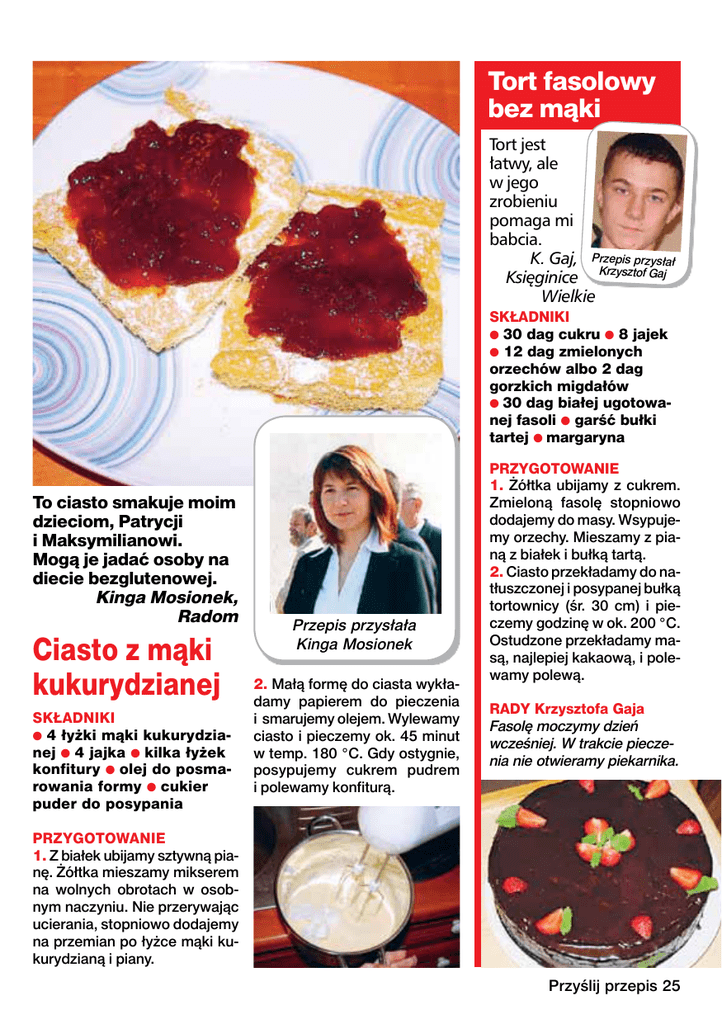 Tort fasolowy bez mąki Tort jest łatwy, ale w jego zrobieniu pomaga mi babcia. K. Gaj, Przepis przysłał Księginice Krzysztof Gaj Wielkie SKŁADNIKI ● 30 dag cukru ● 8 jajek ● 12 dag zmielonych orzechów albo 2 dag gorzkich migdałów ● 30 dag białej ugotowanej fasoli ● garść bułki tartej ● margaryna To ciasto smakuje moim dzieciom, Patrycji i Maksymilianowi. Mogą je jadać osoby na diecie bezglutenowej. Kinga Mosionek, Radom Ciasto z mąki kukurydzianej SKŁADNIKI ● 4 łyżki mąki kukurydzianej ● 4 jajka ● kilka łyżek konfitury ● olej do posmarowania formy ● cukier puder do posypania Przepis przysłała Kinga Mosionek 2. Małą formę do ciasta wykładamy papierem do pieczenia i smarujemy olejem. Wylewamy ciasto i pieczemy ok. 45 minut w temp. 180 °C. Gdy ostygnie, posypujemy cukrem pudrem i polewamy konfiturą. PRZYGOTOWANIE 1. Żółtka ubijamy z cukrem. Zmieloną fasolę stopniowo dodajemy do masy. Wsypujemy orzechy. Mieszamy z pianą z białek i bułką tartą. 2. Ciasto przekładamy do natłuszczonej i posypanej bułką tortownicy (śr. 30 cm) i pieczemy godzinę w ok. 200 °C. Ostudzone przekładamy masą, najlepiej kakaową, i polewamy polewą. RADY Krzysztofa Gaja Fasolę moczymy dzień wcześniej. W trakcie pieczenia nie otwieramy piekarnika. PRZYGOTOWANIE 1. Z białek ubijamy sztywną pianę. Żółtka mieszamy mikserem na wolnych obrotach w osobnym naczyniu. Nie przerywając ucierania, stopniowo dodajemy na przemian po łyżce mąki kukurydzianą i piany. Przyślij przepis 25