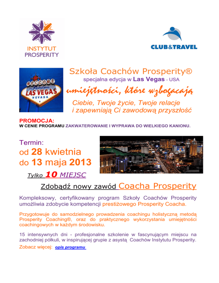 Szkoła Coachów Prosperity® specjalna edycja w Las Vegas - USA umiejętności, które wzbogacają Ciebie, Twoje życie, Twoje relacje i zapewniają Ci zawodową przyszłość PROMOCJA: W CENIE PROGRAMU ZAKWATEROWANIE I WYPRAWA DO WIELKIEGO KANIONU. Termin: od 28 kwietnia do 13 maja 2013 Tylko 10 MIEJSC Zdobądź nowy zawód Coacha Prosperity Kompleksowy, certyfikowany program Szkoły Coachów Prosperity umożliwia zdobycie kompetencji prestiżowego Prosperity Coacha. Przygotowuje do samodzielnego prowadzenia coachingu holistyczną metodą Prosperity Coaching®, oraz do praktycznego wykorzystania umiejętności coachingowych w każdym środowisku. 15 intensywnych dni - profesjonalne szkolenie w fascynującym miejscu na zachodniej półkuli, w inspirującej grupie z asystą Coachów Instytutu Prosperity. Zobacz więcej: opis programu 1 Szkoła Coachów Prosperity® edycja w Las Vegas - USA Program realizowany jest autorską Metodą Prosperity Coaching®. Uwzględnia najlepsze modele i narzędzia coachingowe, zawiera specjalne moduły rozwojowe i obejmuje 14 dni szkolenia oraz po powrocie jednodniowy warsztat i indywidualne sesje coachingowe z Master Prosperity Coachem. • • • • • Zapewnia gruntowną znajomość teorii coachingu i narzędzi coachingowych. Rozwija osobowość, inteligencję emocjonalną, kompetencje interpersonalne. Kształtuje postawę i spójny, profesjonalny wizerunek Coacha - Człowieka Prosperity. Inspiruje do ciągłego rozwoju i dokonywania dobrych zmian. Buduje świadomość i postawę Człowieka Prosperity. Przygotowuje do samodzielnego prowadzenia coachingu holistyczną metodą Prosperity Coaching®, oraz do praktycznego wykorzystania umiejętności coachingowych w każdym środowisku. Absolwenci po przejściu procesu certyfikacyjnego, zaliczeniu pisemnego, ustnego i praktycznego egzaminu zdobywają certyfikat International Prosperity Coach® i będą należeć do ekskluzywnego grona Prosperity Coachów. Program wzbogacony o doświadczenie Sabbatical Coachingu połączony z wyprawą do Wielkiego Kanionu rzeki Kolorado ( w cenie) może stać się największym przełomem w Twoim życiu. Cena : 5100 USD+VAT 23% Termin wpłat : zaliczka przy zapisie, wpłata pozostałej kwoty do 28 luty 2013. O uczestnictwie decyduje kolejność zgłoszeń i wpłat. Cena obejmuje: • profesjonalne szkolenie w j. polskim ( 2 Coachów Instytutu Prosperity) • sesje z trenerami podczas kursu, • sesje grupowe, • superwizje, • pomoce dydaktyczne, (materiały szkoleniowe), • 14 noclegów w luksusowym hotelu w pokojach dwuosobowych, istnieje możliwość dopłaty do pokoju jednoosobowego 1100 USD/ pobyt • transfery z/na lotnisko w Las Vegas, przejazd do Wielkiego Kanionu rzeki Kolorado • ubezpieczenie podróżne KL, NW, bagażu • oraz sesję coachingową przed wyjazdem. Cena nie obejmuje: przelotów na trasie Polska – USA (ok. 3.450,00 - 3.950 PLN), wyżywienia, wizy (ok. 600 PLN), usług spa, aktywności fakultatywnych, Każdy uczestnik występuje indywidualne o wizę turystyczną do właściwej placówki konsularnej USA. Procedura zapisów: • wypełnienie i wysłanie Formularza zgłoszeniowego, • przesłanie CV ze zdjęciem oraz listu motywacyjnego, • rozmowa kwalifikacyjna, • decyzja o zakwalifikowaniu, • przesłanie potwierdzenia uczestnictwa i wpłata zaliczki, • wpisanie na listę uczestników, • dokonanie płatności pozostałej kwoty, • przedwyjazdowa sesja – ( sesja indywidualna) • przekazanie informacji programowo-organizacyjnych i listy lektur, Tylko 10 MIEJSC. O uczestnictwie decyduje kolejność zgłoszeń i wpłat. Obsługę turystyczną ( rezerwacja biletów, pośrednictwo wizowe, ubezpieczenia, itp.) zapewnia nasz Partner, profesjonalny Tour Operator Club & Travel Sp. z o.o., ul. Krzywickiego 34, 02-078 Warszawa. Kontakt: Barbara Dziedzic, tel.: +48 603 857 571; e-mail: [email protected] Zgłoszenia: www.instytutprosperity.pl ; e-mail: [email protected] ; Wypełnij formularz zgłoszeniowy ZAPRASZAMY Kontakt tel.: +48 721 245 778 / pn.-pt. 10.00 - 16.00 / 2