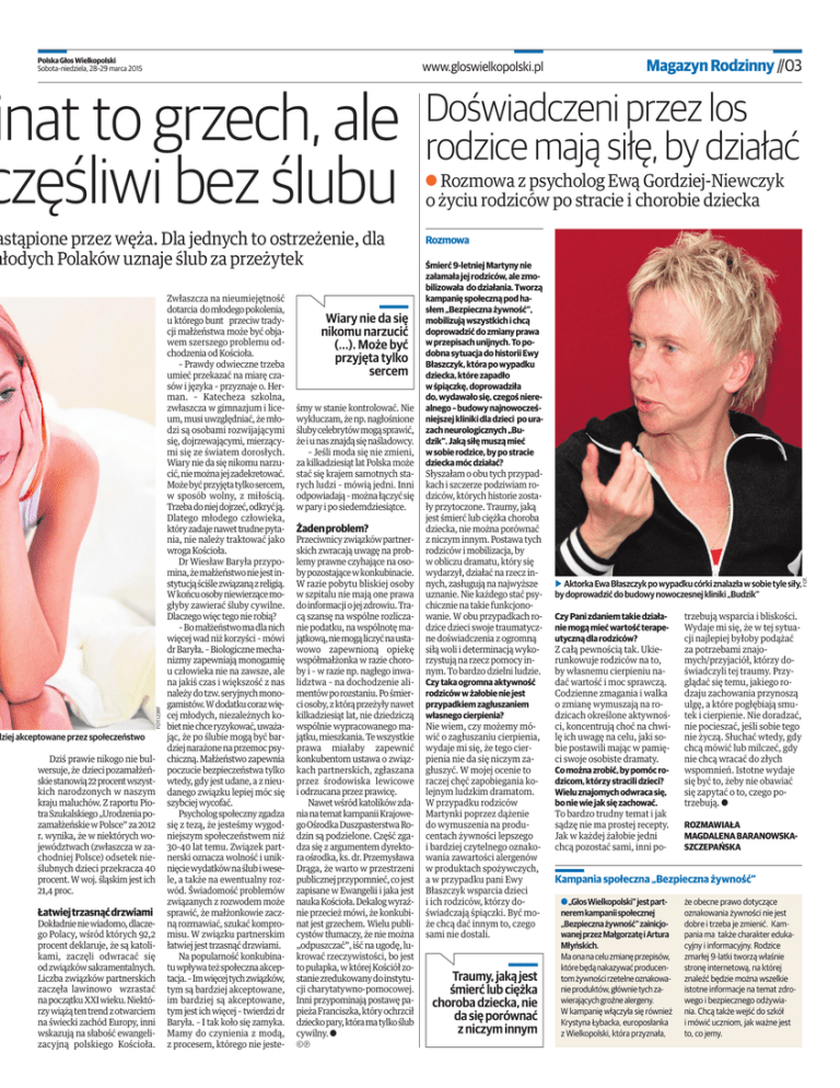 www.gloswielkopolski.pl Magazyn Rodzinny //03 astąpione przez węża. Dla jednych to ostrzeżenie, dla młodych Polaków uznaje ślub za przeżytek Rozmowa FOT.123RF inat to grzech, ale częśliwi bez ślubu Doświadczeni przez los rodzice mają siłę, by działać dziej akceptowane przez społeczeństwo Dziś prawie nikogo nie bulwersuje, że dzieci pozamałżeńskiestanowią22procentwszystkich narodzonych w naszym kraju maluchów. Z raportu Piotra Szukalskiego „Urodzenia pozamałżeńskie w Polsce” za 2012 r. wynika, że w niektórych województwach (zwłaszcza w zachodniej Polsce) odsetek nieślubnych dzieci przekracza 40 procent. W woj. śląskim jest ich 21,4 proc. Łatwiejtrzasnąćdrzwiami Dokładnieniewiadomo,dlaczego Polacy, wśród których 92,2 procent deklaruje, że są katolikami, zaczęli odwracać się od związków sakramentalnych. Liczba związków partnerskich zaczęła lawinowo wzrastać na początku XXI wieku. Niektórzy wiążą ten trend z otwarciem na świecki zachód Europy, inni wskazują na słabość ewangelizacyjną polskiego Kościoła. Zwłaszcza na nieumiejętność dotarcia do młodego pokolenia, u którego bunt przeciw tradycji małżeństwa może być objawem szerszego problemu odchodzenia od Kościoła. – Prawdy odwieczne trzeba umieć przekazać na miarę czasów i języka – przyznaje o. Herman. – Katecheza szkolna, zwłaszcza w gimnazjum i liceum, musi uwzględniać, że młodzi są osobami rozwijającymi się, dojrzewającymi, mierzącymi się ze światem dorosłych. Wiary nie da się nikomu narzucić, nie można jej zadekretować. Może być przyjęta tylko sercem, w sposób wolny, z miłością. Trzebadoniejdojrzeć,odkryćją. Dlatego młodego człowieka, który zadaje nawet trudne pytania, nie należy traktować jako wroga Kościoła. Dr Wiesław Baryła przypomina, że małżeństwo nie jest instytucjąściślezwiązanązreligią. Wkońcuosobyniewierzącemogłyby zawierać śluby cywilne. Dlaczego więc tego nie robią? – Bo małżeństwo ma dla nich więcej wad niż korzyści – mówi dr Baryła. – Biologiczne mechanizmy zapewniają monogamię u człowieka nie na zawsze, ale na jakiś czas i większość z nas należy do tzw. seryjnych monogamistów.Wdodatkucorazwięcej młodych, niezależnych kobiet nie chce ryzykować, uważając, że po ślubie mogą być bardziej narażone na przemoc psychiczną. Małżeństwo zapewnia poczucie bezpieczeństwa tylko wtedy, gdy jest udane, a z nieudanego związku lepiej móc się szybciej wycofać. Psycholog społeczny zgadza się z tezą, że jesteśmy wygodniejszym społeczeństwem niż 30-40 lat temu. Związek partnerski oznacza wolność i uniknięcie wydatków na ślub i wesele, a także na ewentualny rozwód. Świadomość problemów związanych z rozwodem może sprawić, że małżonkowie zaczną rozmawiać, szukać kompromisu. W związku partnerskim łatwiej jest trzasnąć drzwiami. Na popularność konkubinatu wpływa też społeczna akceptacja.–Imwięcejtychzwiązków, tym są bardziej akceptowane, im bardziej są akceptowane, tym jest ich więcej – twierdzi dr Baryła. – I tak koło się zamyka. Mamy do czynienia z modą, z procesem, którego nie jeste- Wiary nie da się nikomu narzucić (...). Może być przyjęta tylko sercem śmy w stanie kontrolować. Nie wykluczam, że np. nagłośnione śluby celebrytów mogą sprawić, że iu nas znajdą się naśladowcy. – Jeśli moda się nie zmieni, za kilkadziesiąt lat Polska może stać się krajem samotnych starych ludzi – mówią jedni. Inni odpowiadają – można łączyć się w pary i po siedemdziesiątce. Żadenproblem? Przeciwnicy związków partnerskich zwracają uwagę na problemy prawne czyhające na osoby pozostające w konkubinacie. W razie pobytu bliskiej osoby w szpitalu nie mają one prawa do informacji o jej zdrowiu. Tracą szansę na wspólne rozliczanie podatku, na wspólnotę majątkową,niemogąliczyćnaustawowo zapewnioną opiekę współmałżonka w razie choroby i – w razie np. nagłego inwalidztwa – na dochodzenie alimentów po rozstaniu. Po śmierci osoby, z którą przeżyły nawet kilkadziesiąt lat, nie dziedziczą wspólnie wypracowanego majątku, mieszkania. Te wszystkie prawa miałaby zapewnić konkubentom ustawa o związkach partnerskich, zgłaszana przez środowiska lewicowe i odrzucana przez prawicę. Nawet wśród katolików zdania na temat kampanii Krajowego Ośrodka Duszpasterstwa Rodzin są podzielone. Część zgadza się z argumentem dyrektora ośrodka, ks. dr. Przemysława Drąga, że warto w przestrzeni publicznej przypomnieć, co jest zapisane w Ewangelii i jaka jest nauka Kościoła. Dekalog wyraźnie przecież mówi, że konkubinat jest grzechem. Wielu publicystów tłumaczy, że nie można „odpuszczać”, iść na ugodę, lukrować rzeczywistości, bo jest to pułapka, w której Kościół zostanie zredukowany do instytucji charytatywno-pomocowej. Inni przypominają postawę papieża Franciszka, który ochrzcił dzieckopary,któramatylkoślub cywilny. a ą A Rozmowa z psycholog Ewą Gordziej-Niewczyk o życiu rodziców po stracie i chorobie dziecka Śmierć 9-letniej Martyny nie załamała jej rodziców, ale zmobilizowała do działania. Tworzą kampanię społeczną pod hasłem „Bezpieczna żywność”, mobilizują wszystkich i chcą doprowadzić do zmiany prawa w przepisach unijnych. To podobna sytuacja do historii Ewy Błaszczyk, która po wypadku dziecka, które zapadło w śpiączkę, doprowadziła do, wydawało się, czegoś nierealnego – budowy najnowocześniejszej kliniki dla dzieci po urazach neurologicznych „Budzik”. Jaką siłę muszą mieć w sobie rodzice, by po stracie dziecka móc działać? Słyszałam o obu tych przypadkach i szczerze podziwiam rodziców, których historie zostały przytoczone. Traumy, jaką jest śmierć lub ciężka choroba dziecka, nie można porównać z niczym innym. Postawa tych rodziców i mobilizacja, by w obliczu dramat