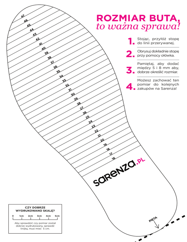 ROZMIAR BUTA, to ważna sprawa! 47 46 45 44 43 1. 2. 42 41 40 39 38 37 3. 36 35 34 33 4. 32 31 30 Stojąc, przyłóż stopę do linii przerywanej. Obrysuj dokładnie stopę przy pomocy ołówka. Pamiętaj, aby dodać między 5 i 8 mm aby, dobrze określić rozmiar. Możesz zachować ten pomiar do kolejnych zakupów na Sarenza! 29 28 27 26 25 24 23 22 21 20 19 18 17 16 CZY DOBRZE WYDRUKOWANO SKALĘ? 0 1cm 2cm 3cm 4cm 5cm Aby sprawdzić czy pomiar został dobrze wydrukowany, sprawdź linijką, musi mieć 5 cm. TA PIĘ
