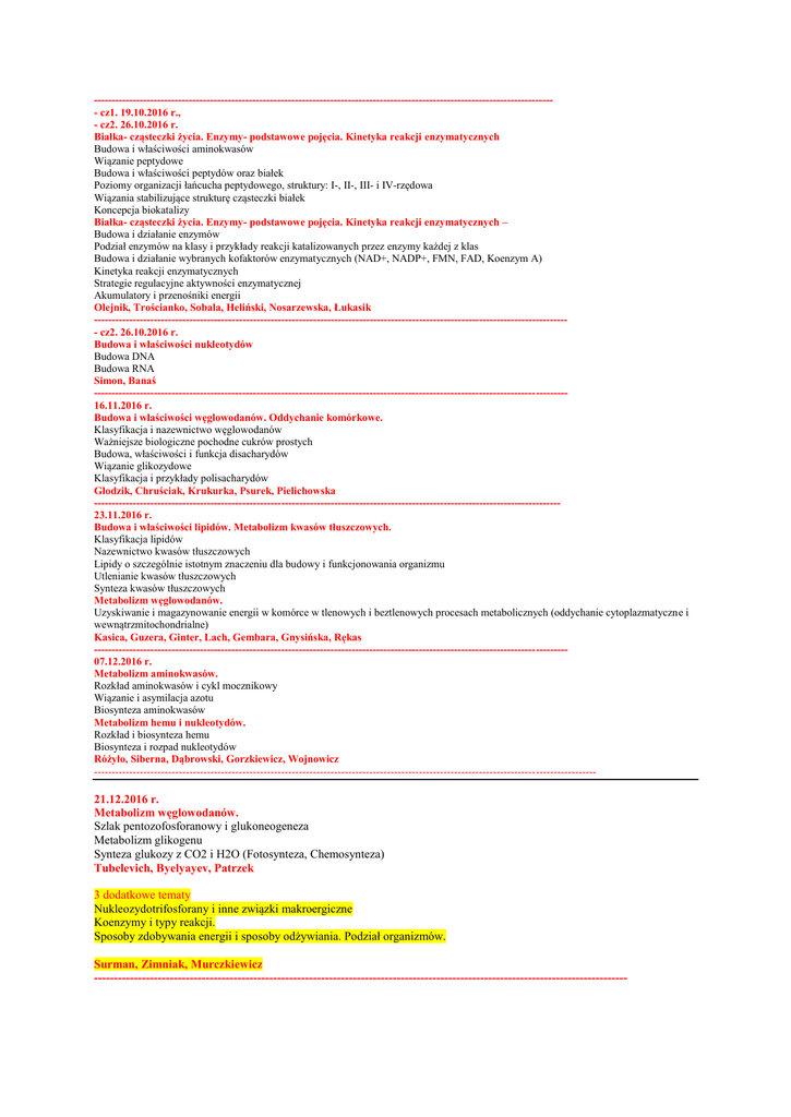 ---------------------------------------------------------------------------------------------------------------------------------- cz1. 19.10.2016 r., - cz2. 26.10.2016 r. Białka- cząsteczki życia. Enzymy- podstawowe pojęcia. Kinetyka reakcji enzymatycznych Budowa i właściwości aminokwasów Wiązanie peptydowe Budowa i właściwości peptydów oraz białek Poziomy organizacji łańcucha peptydowego, struktury: I-, II-, III- i IV-rzędowa Wiązania stabilizujące strukturę cząsteczki białek Koncepcja biokatalizy Białka- cząsteczki życia. Enzymy- podstawowe pojęcia. Kinetyka reakcji enzymatycznych – Budowa i działanie enzymów Podział enzymów na klasy i przykłady reakcji katalizowanych przez enzymy każdej z klas Budowa i działanie wybranych kofaktorów enzymatycznych (NAD+, NADP+, FMN, FAD, Koenzym A) Kinetyka reakcji enzymatycznych Strategie regulacyjne aktywności enzymatycznej Akumulatory i przenośniki energii Olejnik, Trościanko, Sobala, Heliński, Nosarzewska, Łukasik -------------------------------------------------------------------------------------------------------------------------------------- cz2. 26.10.2016 r. Budowa i właściwości nukleotydów Budowa DNA Budowa RNA Simon, Banaś -------------------------------------------------------------------------------------------------------------------------------------16.11.2016 r. Budowa i właściwości węglowodanów. Oddychanie komórkowe. Klasyfikacja i nazewnictwo węglowodanów Ważniejsze biologiczne pochodne cukrów prostych Budowa, właściwości i funkcja disacharydów Wiązanie glikozydowe Klasyfikacja i przykłady polisacharydów Głodzik, Chruściak, Krukurka, Psurek, Pielichowska -----------------------------------------------------------------------------------------------------------------------------------23.11.2016 r. Budowa i właściwości lipidów. Metabolizm kwasów tłuszczowych. Klasyfikacja lipidów Nazewnictwo kwasów tłuszczowych Lipidy o szczególnie istotnym znaczeniu dla budowy i funkcjonowania organizmu Utlenianie kwasów tłuszczowych Synteza kwasów tłuszczowych Metabolizm węglowodanów. Uzyskiwanie i magazynowanie energii w komórce w tlenowych i beztlenowych procesach metabolicznych (oddychanie cytoplazmatyczne i wewnątrzmitochondrialne) Kasica, Guzera, Ginter, Lach, Gembara, Gnysińska, Rękas -------------------------------------------------------------------------------------------------------------------------------------07.12.2016 r. Metabolizm aminokwasów. Rozkład aminokwasów i cykl mocznikowy Wiązanie i asymilacja azotu Biosynteza aminokwasów Metabolizm hemu i nukleotydów. Rozkład i biosynteza hemu Biosynteza i rozpad nukleotydów Różyło, Siberna, Dąbrowski, Gorzkiewicz, Wojnowicz ---------------------------------------------------------------------------------------------------------------------------------------------- 21.12.2016 r. Metabolizm węglowodanów. Szlak pentozofosforanowy i glukoneogeneza Metabolizm glikogenu Synteza glukozy z CO2 i H2O (Fotosynteza, Chemosynteza) Tubelevich, Byelyayev, Patrzek 3 dodatkowe tematy Nukleozydotrifosforany i inne związki makroergiczne Koenzymy i typy reakcji. Sposoby zdobywania energii i sposoby odżywiania. Podział organizmów. Surman, Zimniak, Murczkiewicz --------------------------------------------------------------------------------------------------------------------------------------