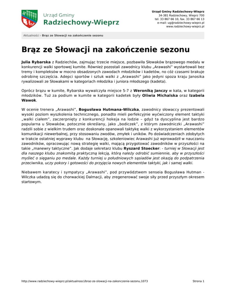 Urząd Gminy Radziechowy-Wieprz 34-381 Radziechowy, Wieprz 700 tel. 33 867 66 10, fax. 33 867 66 13 e-mail: [email protected] www.radziechowy-wieprz.pl Aktualności › Brąz ze Słowacji na zakończenie sezonu Brąz ze Słowacji na zakończenie sezonu Julia Rybarska z Radziechów, zajmując trzecie miejsce, pozbawiła Słowaków brązowego medalu w konkurencji walki sportowej kumite. Również pozostali zawodnicy klubu „Arawashi” wystartowali bez tremy i kompleksów w mocno obsadzonych zawodach młodzików i kadetów, no cóż czasami brakuje odrobinę szczęścia. Adepci sportów i sztuk walki z „Arawashi” jako jedyni spoza kraju Janosika rywalizowali ze Słowakami w kategoriach młodzika i juniora młodszego (kadeta). Oprócz brązu w kumite, Rybarska wywalczyła miejsce 5-7 z Weroniką Janczy w kata, w kategorii młodzików. Tuż za podium w kumite w kategorii kadetek były Oliwia Michalska oraz Izabela Wawok. W ocenie trenera „Arawashi”, Bogusława Hutmana-Wilczka, zawodnicy słowaccy prezentowali wysoki poziom wyszkolenia technicznego, ponadto mieli perfekcyjnie wyćwiczony element taktyki „walki ciałem”, zaczerpnięty z konkurencji hokeja na lodzie – gdyż ta dyscyplina jest bardzo popularna u Słowaków, potocznie określany, jako „bodiczek”, z którym zawodniczki „Arawashi” radzili sobie z wielkim trudem oraz doskonale opanowali taktykę walki z wykorzystaniem elementów komunikacji niewerbalnej, przy stosowaniu zwodów, zmyłek i uników. Po doświadczeniach zdobytych w trakcie ostatniej wyprawy klubu na Słowację, szkoleniowiec Arawashi już wprowadził w nauczaniu zawodników, opracowując nową strategię walki, mającą przygotować zawodników w przyszłości na takie „manewry taktyczne”. Jak dodaje sekretarz klubu Ryszard Stoecker: - turniej w Słowacji jest dla naszego klubu znakomitą praktyczną lekcją, którą należy odrobić sumiennie, aby w przyszłości myśleć o sięganiu po medale. Każdy turniej u południowych sąsiadów jest okazją do podpatrzenia przeciwnika, uczy pokory i gotowości do przyjęcia nowych elementów taktyki, jak i samej walki. Niebawem karatecy i sympatycy „Arawashi”, pod przywództwem senseia Bogusława Hutman Wilczka udadzą się do chorwackiej Dalmacji, aby zregenerować swoje siły przed przyszłym okresem startowym. http://www.radziechowy-wieprz.pl/aktualnosci/braz-ze-slowacji-na-zakonczenie-sezonu,1073 Strona 1