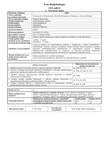 Foto-Radiobiologia SYLABUS A. Informacje ogólne Elementy sylabusu Opis Nazwa jednostki prowadzącej kierunek Nazwa kierunku studiów Poziom kształcenia Profil studiów Forma studiów Kod przedmiotu Język przedmiotu Uniwersytet w Białymstoku, Wydział Biologiczno-Chemiczny, Instytut Biologii Rodzaj przedmiotu Rok studiów /semestr Wymagania wstępne Liczba godzin zajęć dydaktycznych z podziałem na formy prowadzenia zajęć przedmiot do wyboru rok I / II semestr (letni) Chemia ogólna i analityczna, Chemia organiczna, Podstawy fizyki, Biochemia, Ochrona Środowiska studia drugiego stopnia ogólnoakademicki stacjonarne 0200-OS-1PDW49 polski wykład – 15 godz. laboratoria – 15 godz. Założenia i cele przedmiotu Celem przedmiotu jest wprowadzenie studenta w zagadnienia z zakresu fotobiofizyki i radiobiologii. Podczas realizacji przedmioty student poznaje fizyko-chemiczne podstawy procesów fotobiologicznych zachodzących w organizmach żywych i efektów oddziaływania radioaktywności na organizmy na rożnych poziomach organizacji. Zapoznaje się z podstawą metod stosowanych w pomiarach radioaktywności. Metody dydaktyczne oraz ogólna forma zaliczenia przedmiotu Metody dydaktyczne: wykład, konsultacje, Formy zaliczenia przedmiotu: zaliczenie na ocenę laboratoriów, egzamin Efekty kształceniai 1. Student posiada rozszerzoną wiedzę w zakresie zagrożeń środowiska 2. Student wykazuje rozszerzoną znajomość matematyki i statystyki umożliwiającą opisywanie zjawisk przyrodniczych i analizę danych 3. Student wskazuje zaawansowane techniki badawcze stosowane w analizie zanieczyszczeń środowiska. 4. Student posiada aktualne informacje z zakresu ochrony środowiska w specjalistycznej literaturze naukowej polsko- i obcojęzycznej 5. Student wykazuje dbałość o bezpieczeństwo pracy w laboratorium, posiada świadomość poszanowania pracy własnej i innych. Punkty ECTS Bilans nakładu pracy studentaii Wskaźniki ilościowe Data opracowania: Odniesienie do kierunkowych efektów kształcenia K_W03, K_U01 K_W04, K_U08, K_U10 K_ W06, K_W12, K_U03 K_K02, K_K08, 2 Ogólny nakład pracy studenta: 50 godz. w tym: udział w wykładach: 15 godz.; udział w zajęciach laboratoryjnych: 15 godz.; przygotowanie się do zajęć, zaliczeń, egzaminów: 16,3godz.; udział w konsultacjach, zaliczeniach, egzaminie: 3,8 godz. Nakład pracy studenta związany z zajęciami iii: Liczba godzin Punkty ECTS 33,8 1,4 wymagającymi bezpośredniego udziału nauczyciela 35 1,4 o charakterze praktycznym 17. 05. 2014 Koordynator przedmiotu: Prof. dr hab. Maria Zamarajewa SYLABUS B. Informacje szczegółowe Elementy składowe sylabusu Nazwa przedmiotu Kod przedmiotu Nazwa kierunku Nazwa jednostki prowadzącej kierunek Język przedmiotu Rok studiów/ semestr Liczba godzin zajęć dydaktycznych oraz forma prowadzenia zajęć Prowadzący Treści merytoryczne przedmiotu: Efekty kształcenia wraz ze sposobem ich weryfikacji Opis Foto-Radiobiologia 0200-OS-1PDW49 Ochrona Środowiska Wydział Biologiczno-Chemiczny UwB, Instytut Biologii polski rok I / II semestr (letni) 15 godz., wykład Prof. dr hab. Maria Zamarajewa 1. Charakterystyka promieniowania elektromagnetycznego. Zakresy widma elektromagnetycznego Typy i etapy procesów fotobiologicznych. Foto- fizyczna stadia. Mechanizmy migracji energii: promieniste, bez- promieniste. Luminescencja: fluorescencja, fosforescencja . Schemat Jabłońskiego. Prawa Stokesa, Kasha. 2. Podstawowe prawa fotochemiczne. Prawo Grotthusa–Drapera, Starka-Einsteina. Zmiany fizyko-chemicznych właściwości cząsteczek w stanie wzbudzonym. Reakcje fotochemiczne. 3. Typy odpowiedzi biologicznych obiektów na światło. Regulacyjna rola światła. Fotoreceptoryreakcje fotochemiczne. Fotosynteza roślin zielonych. Fotoindukowane przeniesienie elektronu. Termodynamika procesów fotosyntezy, reakcje fotochemiczne. Synteza ATP. Struktura i mechanizm działania ATP-syntazy. Bakterie halofilne. Struktura i funkcje bakteriorodopsyny. Bakteriorodopsyna jako specyficzną pompa protonowa. Fotofizyczne podstawy widzenie. 4. Działanie promieniowania ultrafioletowego (UV). Wpływ promieniowania ultrafioletowego na lipidy, białka oraz kwasy nukleinowe. Mechanizm inicjacji apoptozy UV. 5. Oddziaływanie promieniowania jonizującego z materią. Radioaktywne izotopy naturalne i sztuczne. Rodzaje rozpadów promieniotwórczych. Prawo rozpadu promieniotwórczego. Aktywność promieniotwórcza i jej jednostki. Biologiczne działanie promieniowania jonizującego. Pozytywne skutki działania promieniowania. Uszkodzenia radiacyjne na różnych poziomach organizacji (komórki, tkanki, organy, cały organizm). Promienioczułość tkanek. PrawoBergonieTribondeau. Narządy krytyczne. Wczesne i późne efekty napromieniania. Efekty stochastyczne i deterministyczne. Radioliza wody. Bezpośrednie i pośrednie efekty promieniowania jonizującego. Utlenienie lipidów, białek, uszkodzenia kwasów nukleinowych. Efekt tlenowy. Cykl komórkowy i śmierć mitotyczna. Śmierć apoptyczna i nekrotyczna. 6. Detekcja promieniowania jonizującego: metody jonizacyjne, scyntylacyjne i autoradiografii. 7. Dozymetria. Jednostki dozymetryczne. Dawki i moc dawki. Ochrona przed promieniowaniem. 1. Student wykazuje dbałość o bezpieczeństwo pracy w laboratorium, posiada świadomość poszanowania pracy własnej i innych. 2. Student posiada aktualne informacje z zakresu ochrony środowiska w specjalistycznej literaturze naukowej polsko- i obcojęzycznej. 3. Student wskazuje zaawansowane techniki badawcze stosowane w analizie zanieczyszczeń środowiska. 4. Student wykazuje rozszerzoną znajomość matematyki i statystyki umożliwiającą opisywanie zjawisk przyrodniczych i analizę danych. 5. Student posiada rozszerzoną wiedzę w zakresie zagrożeń środowiska. Forma i warunki zaliczenia przedmiotu Wykaz literatury podstawowej i uzupełniającej Sposoby weryfikacji: 1. Egzamin pisemny podsumowujący przedmiot (test zamknięty