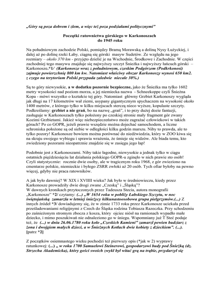 „Góry są poza dobrem i złem, a więc też poza podziałami politycznymi” Początki ratownictwa górskiego w Karkonoszach do 1945 roku Na południowym zachodzie Polski, pomiędzy Bramą Morawską a doliną Nysy Łużyckiej, i dalej aż po dolinę rzeki Łaby, ciągną się górski masyw Sudetów. Ze względu na jego rozmiary – około 370 km - przyjęto dzielić je na Wschodnie, Środkowe i Zachodnie. W części zachodniej tego masywu znajduje się najwyższy szczyt Śnieżka i najwyższy łańcuch górski – Karkonosze.*1/ (Karkonosze wraz z południowym, czeskim Podgórzem (Podkrkonosi) zajmuje powierzchnię 800 km kw. Natomiast właściwy obszar Karkonoszy wynosi 650 km2. z czego na terytorium Polski przypada zaledwie niecałe 30%.) Są to góry niewysokie, a w dodatku pozornie bezpieczne, jako że Śnieżka ma tylko 1602 metry wysokości nad poziom morza, a jej niemiecka nazwa - Schneekoppe czyli Śnieżna Kopa - mówi wszystko o kształcie tej góry. Natomiast główny Grzbiet Karkonoszy wygląda jak długi na 17 kilometrów wał ziemi, usypany gigantycznym spychaczem na wysokość około 1400 metrów, z którego tylko w kilku miejscach sterczą nieco wyższe, kopulaste szczyty. Podkreślamy: grzbiet a nie grań, bo na nazwę „grań”, i to przy dużej dozie fantazji, zasługuje w Karkonoszach tylko położony po czeskiej stronie mały fragment gór zwany Kozimi Grzbietami. Jakież więc niebezpieczeństwo może zagrażać człowiekowi w takich górach? Po co GOPR, jeżeli prawie wszędzie można dojechać samochodem, a liczne schroniska położone są od siebie w odległości kilku godzin marszu. Niby to prawda, ale to tylko pozory! Karkonosze bowiem można porównać do niedźwiedzia, który w ZOO kiwa się na skraju swojego wybiegu i sprawia wrażenia, że śmieje się widzów. Ale biada temu, kto zwiedziony pozorami nieopatrznie znajdzie się w zasięgu jego łap! Podobnie jest z Karkonoszami. Niby takie łagodne, niewysokie a jednak tylko w ciągu ostatnich pięćdziesięciu lat działania polskiego GOPR-u zginęło w nich prawie sto osób! Czyli statystycznie: rocznie dwie osoby, ale w tragicznym roku 1968, z gór zwieziono na cmentarze polskie, niemieckie i byłego ZSRR zwłoki aż 20 osób. Tych ofiar byłoby na pewno więcej, gdyby nie praca ratowników. A jak było dawniej? W XIX i XVIIII wieku? Jak było w średniowieczu, kiedy przez Karkonosze prowadziły dwie drogi zwane „Czeską” i „Śląską”? W dawnych kronikach przytoczonych przez Tadeusza Stecia, autora monografii „Karkonosze” *2/ czytamy: (...) „W 1654 roku w pobliży Łabskiego Szczytu, w noc świętojańską zamarzła w letniej śnieżycy kilkunastoosobowa grupa pielgrzymów.(...) Z innych źródeł *3/ dowiadujemy się, że w zimie 1733 roku przez Karkonosze uciekała przed prześladowaniami religijnymi z Czech do Śląska rodzina Tobiasza Razeczka. Przy schodzeniu po zaśnieżonym stromym zbocza z kosza, który ojciec niósł na ramionach wypadło małe dziecko, i mimo poszukiwań nie odnaleziono go w śniegu. Wspomniany już T Steć podaje też, że (...) w dniu 26.06.1780 roku koło „Czeskich Kamieni” zamarzł pewien budziarz z żona i dwojgiem małych dzieci, a w Śnieżnych Kotłach dwie kobiety z dzieckiem”. (...). [patrz *2] Z początków osiemnastego wieku pochodzi też pierwszy opis (*jak w 2) wyprawy ratunkowej: (...) „ w roku 1700 Samuelowi Steinerowi, gospodarzowi budy pod Śnieżką (dz. Strzecha Akademicka), który gości swoich zwykł był witać grą na trąbie, przydarzył się ubiegłej zimy wypadek, gdy bowiem chciał ratować człowieka zasypanego śniegiem (lawiną) – sam został zasypany i zginął. Znaleziono go dopiero wiosną, na Zielone Świątki” (...) O wyprawie poszukiwawczej z dziewiętnastego wieku przypomina polsko- niemiecka tablica znajdująca się w przedsionku Kaplicy św. Wawrzyńca na Śnieżce. Upamiętnia ona polskiego podróżnika Józefa Odrowąża – Pieniążka, który w lecie 1828 roku zaginął w bagnach na Grzbiecie Karkonoszy, w czasie wędrówki do Luczni Boudy. Z kronik wiadomo, że jego zwłok szukano bezskutecznie przez wiele dni. Można więc przypuszczać, że wyprawy ratunkowe organizowano i w innych przypadkach, ale dopiero rozwój turystyki na przełomie dziewiętnastego i dwudziestego wieku spowodował, że w Karkonoszach, podobnie jak w Alpach przystąpiono do organizowania ratownictwa górskiego *5/. Pierwsza taka organizacja powstała w dniu 18 października 1908 roku w dzisiejszym Karpaczu, który wtedy nazywał się Krummhübel. Założył ją doktor nauk medycznych Ernst Brucauff pod nazwą Freiwillige Sanitätskolonne Krummhübel des DRK, czyli Ochotnicza Kolumna Sanitarna DRK, czyli Niemieckiego Czerwonego Krzyża. Jej zadaniem było nieść pierwszą pomoc medyczną ofiarom wypadków i nagłych zachorowań, oraz przewozić rannych i chorych do szpitali. Do Kolumny należeli ludzie z różnych sfer; od tragarza Adolfa Lindau po właściciela kilku sklepów Max W. Fromberg’a.. W tym miejscu warto dodać, że w roku 1958 w RFN uroczyście obchodzono pięćdziesięciolecie istnienia tej dobrowolnej organizacji, a żyjący członkowie Kolumny otrzymali odznaczenia Niemieckiego Czerwonego Krzyża i innych organizacji. Członkiem Kolumny był też przejeżdżający każdego roku do Karpacza i oprowadzany przez Andrzeja Brzezińskiego Hans Dietrich Bittkau. Z rocznych sprawozdań Niemieckiego Czerwonego Krzyża, które opracowali wieloletni prezes Grupy Sudeckiej GOPR Leszek Rożański i kierownik schroniska „Samotnia” Waldemar Siemaszko wiemy, że Kolumny Sanitarne działały we wszystkich miastach i gminach na terenie dzisiejszej kotliny Jeleniogórskiej. Składały się one z sekcji sanitarnej, narciarskiej, wysokogórskiej, transportowej i grabarskiej. Sekcją Wysokogórską w Karpaczu kierował Max W. Frömberg. W roku 1909 Frömberg skonstruował nosze mocowane do nart, które ze względu na wywrotność