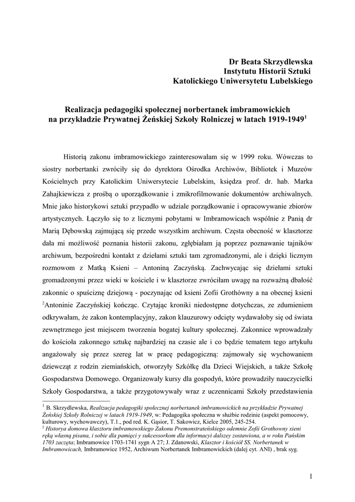 Dr Beata Skrzydlewska Instytutu Historii Sztuki Katolickiego Uniwersytetu Lubelskiego Realizacja pedagogiki społecznej norbertanek imbramowickich na przykładzie Prywatnej Żeńskiej Szkoły Rolniczej w latach 1919-19491 Historią zakonu imbramowickiego zainteresowałam się w 1999 roku. Wówczas to siostry norbertanki zwróciły się do dyrektora Ośrodka Archiwów, Bibliotek i Muzeów Kościelnych przy Katolickim Uniwersytecie Lubelskim, księdza prof. dr. hab. Marka Zahajkiewicza z prośbą o uporządkowanie i zmikrofilmowanie dokumentów archiwalnych. Mnie jako historykowi sztuki przypadło w udziale porządkowanie i opracowywanie zbiorów artystycznych. Łączyło się to z licznymi pobytami w Imbramowicach wspólnie z Panią dr Marią Dębowską zajmującą się przede wszystkim archiwum. Częsta obecność w klasztorze dała mi możliwość poznania historii zakonu, zgłębiałam ją poprzez poznawanie tajników archiwum, bezpośredni kontakt z dziełami sztuki tam zgromadzonymi, ale i dzięki licznym rozmowom z Matką Ksieni – Antoniną Zaczyńską. Zachwycając się dziełami sztuki gromadzonymi przez wieki w kościele i w klasztorze zwróciłam uwagę na rozważną dbałość zakonnic o spuściznę dziejową - poczynając od ksieni Zofii Grothówny a na obecnej ksieni 2 Antoninie Zaczyńskiej kończąc. Czytając kroniki niedostępne dotychczas, ze zdumieniem odkrywałam, że zakon kontemplacyjny, zakon klauzurowy odcięty wydawałoby się od świata zewnętrznego jest miejscem tworzenia bogatej kultury społecznej. Zakonnice wprowadzały do kościoła zakonnego sztukę najbardziej na czasie ale i co będzie tematem tego artykułu angażowały się przez szereg lat w pracę pedagogiczną: zajmowały się wychowaniem dziewcząt z rodzin ziemiańskich, otworzyły Szkółkę dla Dzieci Wiejskich, a także Szkołę Gospodarstwa Domowego. Organizowały kursy dla gospodyń, które prowadziły nauczycielki Szkoły Gospodarstwa, a także przygotowywały wraz z uczennicami Szkoły przedstawienia 1 B. Skrzydlewska, Realizacja pedagogiki społecznej norbertanek imbramowickich na przykładzie Prywatnej Żeńskiej Szkoły Rolniczej w latach 1919-1949, w: Pedagogika społeczna w służbie rodzinie (aspekt pomocowy, kulturowy, wychowawczy), T.1., pod red. K. Gąsior, T. Sakowicz, Kielce 2005, 245-254. 2 Historya domowa klasztoru imbramowskiego Zakonu Premonstrateńskiego odemnie Zofii Grothowny xieni ręką własną pisana, i sobie dla pamięci y sukcessorkom dla informacyi dalszey zostawiona, a w roku Pańskim 1703 zaczęta; Imbramowice 1703-1741 sygn A 27; J. Zdanowski, Klasztor i kościół SS. Norbertanek w Imbramowicach, Imbramowice 1952, Archiwum Norbertanek Imbramowickich (dalej cyt. ANI) , brak syg. 1 okolicznościowe dla miejscowej ludności. Norbertanki - mniszki klasztoru objętego klauzurą papieską - stały się uczestniczkami życia społecznego, pozaklasztornego. Zakon zamknięty, kontemplacyjny, stał się źródłem kultury promieniującej na okoliczne tereny3. a) Początki działalności pedagogicznej O tym, że Panny Norbertanki zajmowały się prowadzeniem Instytutu dla dziewcząt z rodzin ziemiańskich, jeszcze na długo przed zaborami, dowiadujemy się już z pierwszej kroniki klasztornej4. Jednakże w 1864 roku Instytut zamknięto w związku z represjami spowodowanymi powstaniem styczniowym5. Przez wiele lat zakonnice nie mogły prowadzić żadnej szkoły, ani nawet nowicjatu. Sposobność rozpoczęcia na nowo działalności pedagogicznej zaistniała w 1905 roku. Zakonnice dopiero wówczas, po wielu latach przerwy otworzyły nowicjat. W Kronice pod datą 13 listopada 1905 roku zanotowano: „przybyła do nas kandydatka p. Klara Szymborska l. 24, czyli faktycznie po 41 latach otworzył się nowicjat w Imbramowicach, którego kierownictwo p. Tekla Siedlecka objęła”6. Kilka lat później, Maria Nidecka ksieni klasztoru w latach 1897-1917, zakłada tak zwaną Przychodnią Szkołę dla Dzieci Wiejskich, która działała nieprzerwanie do 1923 roku, do czasu otwarcia Szkoły Powszechnej w Imbramowicach 7. Maria Nidecka zamierzała także otworzyć pensjonat dla Starszych Panienek lub Szkołę Gospodarczą dla dziewcząt. Gromadziła w tym celu niezbędne dokumenty, a pomagali jej w tych działaniach za zgodą biskupa rzecz jasna, ksiądz kanonik Bogumił Czerkiewicz i ksiądz kanonik Antoni Bożek, którzy starali się uzyskać potrzebne fundusze na utworzenie szkoły, m.in. poprzez odzyskanie części gruntu z dawnych dóbr klasztornych. Niestety, ksieni Maria Nidecka zmarła dość niespodziewanie dnia 16 maja 1917 roku, a jej następczyni Anzelma Wiśnicka (1917-1924), kontynuowała jej pomysł i ostatecznie 3 B. Skrzydlewska, Kroniki imbramowickie jako źródło wiedzy o wielopłaszczyznowej działalności zakonu Norbertanek w Imbramowicach, w: Materiały z pokonferencyjne z ogólnopolskiej konferencji naukowej Książka ponad podziałami, Lublin 2004, ss. 10 [w druku]. 4 Historya domowa klasztoru imbramowskiego Zakonu Premonstrateńskiego odemnie Zofii Grothowny …dz.cyt. 5 Sprawozdania z działalności szkoły z lat 1919-1921, w: Żeńska Szkoła Rolnicza SS. Norbertanek w Imbramowicach, Imbramowice rkps, B 22, s. 2 i 37. . Kronika retrospektywana za lata 1823-1917 spisana w 1924 r. przez s. Marię Łukaszewska, Imbramowice rkps, ANI, syg. A. 30, s. 171. 6 7 Sprawozdania z działalności szkoły z lat 1919-1921, w: Żeńska Szkoła Rolnicza SS. Norbertanek w Imbramowicach…, Imbramowicach. 37. 2 doprowadziła do otwarcia Szkoły Gospodarstwa dla Dziewcząt 8. Stało się to możliwe, gdy przyznano klasztorowi prawo kupna ponad 36 ha parceli, a także po uzyskaniu w Ministerstwie Rolnictwa koncesji na prowadzenie placówki. Sprawa otwarcia szkoły wydawała się dość pilna, bowiem w związku z odzyskaniem niepodległości norbertanki pragnęły przyczynić się do formowania nowego pokolenia wiejskiego. Chcąc uzyskać jak najwięcej informacji na temat prowa