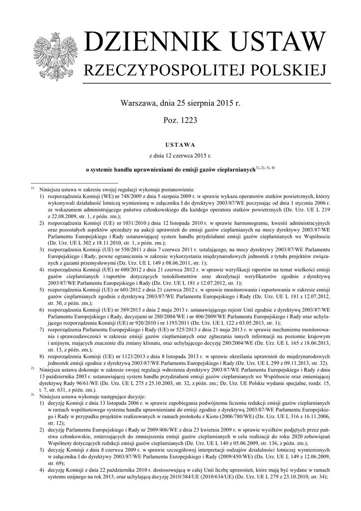 DZIENNIK USTAW RZECZYPOSPOLITEJ POLSKIEJ Warszawa, dnia 25 sierpnia 2015 r. Poz. 1223 US T AW A z dnia 12 czerwca 2015 r. o systemie handlu uprawnieniami do emisji gazów cieplarnianych1), 2), 3), 4) 1) 2) 3) Niniejsza ustawa w zakresie swojej regulacji wykonuje postanowienia: 1) rozporządzenia Komisji (WE) nr 748/2009 z dnia 5 sierpnia 2009 r. w sprawie wykazu operatorów statków powietrznych, którzy wykonywali działalność lotniczą wymienioną w załączniku I do dyrektywy 2003/87/WE poczynając od dnia 1 stycznia 2006 r. ze wskazaniem administrującego państwa członkowskiego dla każdego operatora statków powietrznych (Dz. Urz. UE L 219 z 22.08.2009, str. 1, z późn. zm.); 2) rozporządzenia Komisji (UE) nr 1031/2010 z dnia 12 listopada 2010 r. w sprawie harmonogramu, kwestii administracyjnych oraz pozostałych aspektów sprzedaży na aukcji uprawnień do emisji gazów cieplarnianych na mocy dyrektywy 2003/87/WE Parlamentu Europejskiego i Rady ustanawiającej system handlu przydziałami emisji gazów cieplarnianych we Wspólnocie (Dz. Urz. UE L 302 z 18.11.2010, str. 1, z późn. zm.); 3) rozporządzenia Komisji (UE) nr 550/2011 z dnia 7 czerwca 2011 r. ustalającego, na mocy dyrektywy 2003/87/WE Parlamentu Europejskiego i Rady, pewne ograniczenia w zakresie wykorzystania międzynarodowych jednostek z tytułu projektów związanych z gazami przemysłowymi (Dz. Urz. UE L 149 z 08.06.2011, str. 1); 4) rozporządzenia Komisji (UE) nr 600/2012 z dnia 21 czerwca 2012 r. w sprawie weryfikacji raportów na temat wielkości emisji gazów cieplarnianych i raportów dotyczących tonokilometrów oraz akredytacji weryfikatorów zgodnie z dyrektywą 2003/87/WE Parlamentu Europejskiego i Rady (Dz. Urz. UE L 181 z 12.07.2012, str. 1); 5) rozporządzenia Komisji (UE) nr 601/2012 z dnia 21 czerwca 2012 r. w sprawie monitorowania i raportowania w zakresie emisji gazów cieplarnianych zgodnie z dyrektywą 2003/87/WE Parlamentu Europejskiego i Rady (Dz. Urz. UE L 181 z 12.07.2012, str. 30, z późn. zm.); 6) rozporządzenia Komisji (UE) nr 389/2013 z dnia 2 maja 2013 r. ustanawiającego rejestr Unii zgodnie z dyrektywą 2003/87/WE Parlamentu Europejskiego i Rady, decyzjami nr 280/2004/WE i nr 406/2009/WE Parlamentu Europejskiego i Rady oraz uchylającego rozporządzenia Komisji (UE) nr 920/2010 i nr 1193/2011 (Dz. Urz. UE L 122 z 03.05.2013, str. 1); 7) rozporządzenia Parlamentu Europejskiego i Rady (UE) nr 525/2013 z dnia 21 maja 2013 r. w sprawie mechanizmu monitorowania i sprawozdawczości w zakresie emisji gazów cieplarnianych oraz zgłaszania innych informacji na poziomie krajowym i unijnym, mających znaczenie dla zmiany klimatu, oraz uchylającego decyzję 280/2004/WE (Dz. Urz. UE L 165 z 18.06.2013, str. 13, z późn. zm.); 8) rozporządzenia Komisji (UE) nr 1123/2013 z dnia 8 listopada 2013 r. w sprawie określania uprawnień do międzynarodowych jednostek emisji zgodnie z dyrektywą 2003/87/WE Parlamentu Europejskiego i Rady (Dz. Urz. UE L 299 z 09.11.2013, str. 32). Niniejsza ustawa dokonuje w zakresie swojej regulacji wdrożenia dyrektywy 2003/87/WE Parlamentu Europejskiego i Rady z dnia 13 października 2003 r. ustanawiającej system handlu przydziałami emisji gazów cieplarnianych we Wspólnocie oraz zmieniającej dyrektywę Rady 96/61/WE (Dz. Urz. UE L 275 z 25.10.2003, str. 32, z późn. zm.; Dz. Urz. UE Polskie wydanie specjalne, rozdz. 15, t. 7, str. 631, z późn. zm.). Niniejsza ustawa wykonuje następujące decyzje: 1) decyzję Komisji z dnia 13 listopada 2006 r. w sprawie zapobiegania podwójnemu liczeniu redukcji emisji gazów cieplarnianych w ramach wspólnotowego systemu handlu uprawnieniami do emisji zgodnie z dyrektywą 2003/87/WE Parlamentu Europejskiego i Rady w przypadku projektów realizowanych w ramach protokołu z Kioto (2006/780/WE) (Dz. Urz. UE L 316 z 16.11.2006, str. 12); 2) decyzję Parlamentu Europejskiego i Rady nr 2009/406/WE z dnia 23 kwietnia 2009 r. w sprawie wysiłków podjętych przez państwa członkowskie, zmierzających do zmniejszenia emisji gazów cieplarnianych w celu realizacji do roku 2020 zobowiązań Wspólnoty dotyczących redukcji emisji gazów cieplarnianych (Dz. Urz. UE L 140 z 05.06.2009, str. 136, z późn. zm.); 3) decyzję Komisji z dnia 8 czerwca 2009 r. w sprawie szczegółowej interpretacji rodzajów działalności lotniczej wymienionych w załączniku I do dyrektywy 2003/87/WE Parlamentu Europejskiego i Rady (2009/450/WE) (Dz. Urz. UE L 149 z 12.06.2009, str. 69); 4) decyzję Komisji z dnia 22 października 2010 r. dostosowującą w całej Unii liczbę uprawnień, które mają być wydane w ramach systemu unijnego na rok 2013, oraz uchylającą decyzję 2010/384/UE (2010/634/UE) (Dz. Urz. UE L 279 z 23.10.2010, str. 34); Dziennik Ustaw –2– Poz. 1223 Rozdział 1 Przepisy ogólne Art. 1. 1. Ustawa określa zasady funkcjonowania systemu handlu uprawnieniami do emisji gazów cieplarnianych. 2. System handlu uprawnieniami do emisji gazów cieplarnianych, zwany dalej „systemem”, obejmuje emisję gazów cieplarnianych z: 1) instalacji; 2) operacji lotniczej. 3. Emisja gazów cieplarnianych z instalacji dotyczy: 1) dwutlenku węgla (CO2); 2) podtlenku azotu (N2O); 3) perfluorowęglowodorów (PFCs). 4. Emisja gazów cieplarnianych z operacji lotniczej dotyczy dwutlenku węgla (CO2). 5. Rodzaje działań prowadzonych w instalacjach wraz z wartościami progowymi odniesionymi do zdolności produkcyjnych tych instalacji i gazy cieplarniane przyporządkowane danemu działaniu, stanowiące kryteria uczestnictwa instalacji w systemie, określa załącznik nr 1 do ustawy. Art. 2. Przepisów ustawy nie stosuje się do emisji gazów cieplarnianych z: 1) instalacji lub jej części stosowanej do badania, rozwoju lub testowania nowych produktów i procesów technologicznych oraz instalacji wykorzystującej wyłącznie biomasę; 2) instalacji spalania odpadów niebezpiecznych lub odpadów komunalnych; 4) 5) decyzję Komisji K (2011) 1983 