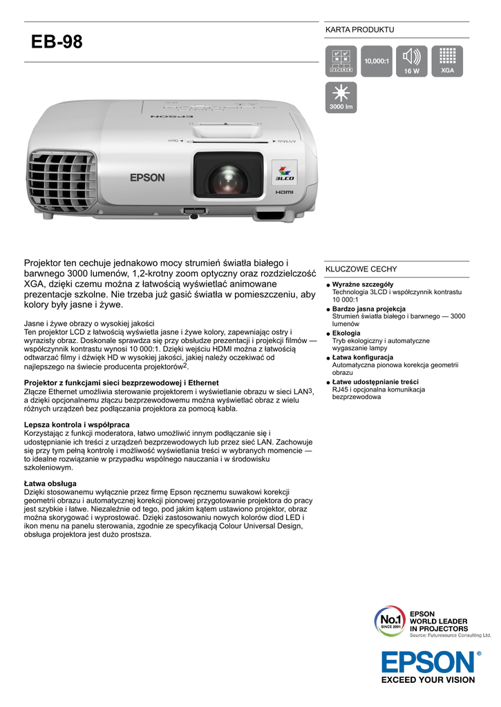 KARTA PRODUKTU EB-98 Projektor ten cechuje jednakowo mocy strumień światła białego i barwnego 3000 lumenów, 1,2-krotny zoom optyczny oraz rozdzielczość XGA, dzięki czemu można z łatwością wyświetlać animowane prezentacje szkolne. Nie trzeba już gasić światła w pomieszczeniu, aby kolory były jasne i żywe. Jasne i żywe obrazy o wysokiej jakości Ten projektor LCD z łatwością wyświetla jasne i żywe kolory, zapewniając ostry i wyrazisty obraz. Doskonale sprawdza się przy obsłudze prezentacji i projekcji filmów — współczynnik kontrastu wynosi 10 000:1. Dzięki wejściu HDMI można z łatwością odtwarzać filmy i dźwięk HD w wysokiej jakości, jakiej należy oczekiwać od najlepszego na świecie producenta projektorów2. Projektor z funkcjami sieci bezprzewodowej i Ethernet Złącze Ethernet umożliwia sterowanie projektorem i wyświetlanie obrazu w sieci LAN3, a dzięki opcjonalnemu złączu bezprzewodowemu można wyświetlać obraz z wielu różnych urządzeń bez podłączania projektora za pomocą kabla. Lepsza kontrola i współpraca Korzystając z funkcji moderatora, łatwo umożliwić innym podłączanie się i udostępnianie ich treści z urządzeń bezprzewodowych lub przez sieć LAN. Zachowuje się przy tym pełną kontrolę i możliwość wyświetlania treści w wybranych momencie ― to idealne rozwiązanie w przypadku wspólnego nauczania i w środowisku szkoleniowym. Łatwa obsługa Dzięki stosowanemu wyłącznie przez firmę Epson ręcznemu suwakowi korekcji geometrii obrazu i automatycznej korekcji pionowej przygotowanie projektora do pracy jest szybkie i łatwe. Niezależnie od tego, pod jakim kątem ustawiono projektor, obraz można skorygować i wyprostować. Dzięki zastosowaniu nowych kolorów diod LED i ikon menu na panelu sterowania, zgodnie ze specyfikacją Colour Universal Design, obsługa projektora jest dużo prostsza. KLUCZOWE CECHY Wyraźne szczegóły Technologia 3LCD i współczynnik kontrastu 10 000:1 Bardzo jasna projekcja Strumień światła białego i barwnego — 3000 lumenów Ekologia Tryb ekologiczny i automatyczne wygaszanie lampy Łatwa konfiguracja Automatyczna pionowa korekcja geometrii obrazu Łatwe udostępnianie treści RJ45 i opcjonalna komunikacja bezprzewodowa EB-98 ZAWARTOŚĆ ZESTAWU SPECYFIKACJE PRODUKTU TECHNIKA System projekcyjny Technologia 3LCD Panel LCD 0,55 cal z MLA (D8) OBRAZ Rozdzielczość XGA, 1024 x 768, 4:3 Natężenie światła białego 3.000 lumen - 2.100 lumen (tryb ekonomiczny) Stosunek kontrastu 10.000 : 1 Natężenie światła barwnego 3.000 lumen-2.100 lumen (tryb ekonomiczny) Lampa 200 W, 5.000 h Żywotność, 6.000 h Żywotność (w trybie oszczędnym) Korekcja obrazu Auto pionowo: ± 30 °, Ręczna obsługa (lub "Instrukcja obsługi") poziomo ± 30 ° Torba transportowa Kabel komputerowy Urządzenie podstawowe Kabel zasilający Pilot z bateriami Zestaw instrukcji obsługi Dokumenty gwarancyjne OPCJONALNE AKCESORIA UKŁAD OPTYCZNY Zoom Manual, Factor: 1,2 Odległość wyświetlania, tryb 1,8 m - 2,17 m (60 cal ekran) szerokokątny/tele Stosunek projekcji 1,48 - 1,77:1 Rozmiar projekcji 30 cale - 300 cale Wartość przesłony obiektywu 1,58 - 1,72 projekcyjnego Odległość ogniskowa 16,9 mm - 20,28 mm Fokus Ręcznie Przesunięcie 8:1 ZŁĄCZA Funkcja USB wyświetlacza 3 w 1: obraz / mysz / dźwięk Przyłącza Złącze USB 2.0 typu A, Złącze USB 2.0 typu B, RS-232C, Interfejs Ethernet (100 Base-TX / 10 Base-T), Bezprzewodowa sieć LAN IEEE 802.11b/g/n (opcja), Wejście VGA (2x), Wyjście VGA, Wejście HDMI, Wejście sygnału kompozytowego, Wejście sygnału komponentowego (2x), Wejście S-Video, Wejście RGB (2x), Stereofoniczne wyjście audio mini-jack, Stereofoniczne wejście audio mini-jack (2x), Wejście audio typu cinch Adapter - ELPAP07 Wireless LAN b/g/n V12H418P13 Air Filter - ELPAF32 - EB-SXW11/12/14 V13H134A32 Ceiling Mount ELPMB23 (EB-G5000 series) V12H003B23 Pipe 450mm Silver ELPFP13 (EB-G5000 series) V12H003P13 Pipe 700mm Silver ELPFP14 (EB-G5000 series) V12H003P14 Lamp - ELPLP78 - EB-SXW03/SXW18/X24 V13H010L78 Quick Wireless Connect USB key - ELPAP09 V12H005M09 80" 16:10 Pull-up Screen (ELPSC24) V12H002S24 Silk Screen ELPSC26 V12H002S26 INNE Gwarancja 24 miesiące/miesięcy Klient zanosi do serwisu, Lampa: 12 miesiące/miesięcy lub 1.000 h INFORMACJA LOGISTYCZNA SKU V11H577040 Kod kreskowy 8715946533483 Wymiary opakowania pojedynczego 363 x 397 x 160 mm Waga pudełka 4,25 kg Kraj pochodzenia Multiple country of origin Rozmiar palety 78 szt. (6 x 13) Epson Europe B.V. Sp. z o.o. Oddział w Polsce ul. Bokserska 66 02-690 Warszawa Tel.: +48 22 375 7500 Faks: +48 22 375 7501 Infolinia: 801 64 64 53 (Opłata za połączenie wg taryfy operatora.) www.epson.pl Znaki towarowe oraz zastrzeżone znaki towarowe są własnością firmy Seiko Epson Corporation lub odpowiednich firm. Informacje o produkcie mogą ulec zmianie bez uprzedzenia. 1. Niektóre lub wszystkie produkty Wi-Fi mogą być niedostępne w określonych krajach. 2Badania przeprowadzone przez firmę Futuresource Consulting Limited dla okresu od 2001 r. do 2012 r. 3Wymagany opcjonalny moduł bezprzewodowy LAN
