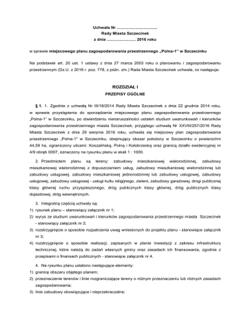 Uchwała Nr ................................... Rady Miasta Szczecinek z dnia ......................... 2016 roku w sprawie miejscowego planu zagospodarowania przestrzennego „Polna-1” w Szczecinku Na podstawie art. 20 ust. 1 ustawy z dnia 27 marca 2003 roku o planowaniu i zagospodarowaniu przestrzennym (Dz.U. z 2016 r. poz. 778, z późn. zm.) Rada Miasta Szczecinek uchwala, co następuje: ROZDZIAŁ I PRZEPISY OGÓLNE § 1. 1. Zgodnie z uchwałą Nr III/18/2014 Rady Miasta Szczecinek z dnia 22 grudnia 2014 roku, w sprawie przystąpienia do sporządzenia miejscowego planu zagospodarowania przestrzennego „Polna-1” w Szczecinku, po stwierdzeniu nienaruszalności ustaleń studium uwarunkowań i kierunków zagospodarowania przestrzennego miasta Szczecinek, przyjętego uchwałą Nr XXVIII/257/2016 Rady Miasta Szczecinek z dnia 29 sierpnia 2016 roku, uchwala się miejscowy plan zagospodarowania przestrzennego „Polna-1" w Szczecinku, obejmujący obszar położony w Szczecinku o powierzchni 44,59 ha, ograniczony ulicami: Koszalińską, Polną i Kołobrzeską oraz granicą działki ewidencyjnej nr 4/9 obręb 0007, oznaczony na rysunku planu w skali 1 : 1000. 2. Przedmiotem planu są tereny: zabudowy mieszkaniowej wielorodzinnej, zabudowy mieszkaniowej wielorodzinnej z dopuszczeniem usług, zabudowy mieszkaniowej wielorodzinnej lub zabudowy usługowej, zabudowy mieszkaniowej jednorodzinnej lub zabudowy usługowej, zabudowy usługowej, zabudowy usługowej - usługi kultu religijnego, zieleni, zabudowy garażowej, drogi publicznej klasy głównej ruchu przyspieszonego, dróg publicznych klasy głównej, dróg publicznych klasy dojazdowej, dróg wewnętrznych. 3. Integralną częścią uchwały są: 1) rysunek planu – stanowiący załącznik nr 1; 2) wyrys ze studium uwarunkowań i kierunków zagospodarowania przestrzennego miasta Szczecinek - stanowiący załącznik nr 2; 3) rozstrzygnięcie o sposobie rozpatrzenia uwag wniesionych do projektu planu - stanowiące załącznik nr 3; 4) rozstrzygnięcie o sposobie realizacji, zapisanych w planie inwestycji z zakresu infrastruktury technicznej, które należą do zadań własnych gminy oraz zasadach ich finansowania, zgodnie z przepisami o finansach publicznych - stanowiące załącznik nr 4. 4. Na rysunku planu ustalono następujące elementy: 1) granicę obszaru objętego planem; 2) przeznaczenie terenów i linie rozgraniczające tereny o różnym przeznaczeniu lub różnych zasadach zagospodarowania; 3) linie zabudowy obowiązujące i nieprzekraczalne; 4) budynki objęte ochroną konserwatorską na mocy planu; 5) granicę strefy ochrony archeologiczno-konserwatorskiej WIII. 5. Ustala się podział obszaru, o którym mowa w § 1 ust. 1 na następujące tereny: 1) zabudowy mieszkaniowej wielorodzinnej, oznaczone symbolami: 6.MW, 8.MW, 18.MW, 25.MW, 26.MW, 31.MW, 32.MW, 40.MW, 41.MW; 2) zabudowy mieszkaniowej wielorodzinnej z dopuszczeniem usług, oznaczone symbolami: 16.MW,U, 20.MW,U, 21.MW,U, 34.MW,U, 36.MW,U, 37.MW,U, 42.MW,U; 3) zabudowy mieszkaniowej wielorodzinnej lub zabudowy usługowej, oznaczony symbolem 29.MW/U; 4) zabudowy mieszkaniowej jednorodzinnej lub zabudowy usługowej, oznaczony symbolem 39.MN/U; 5) zabudowy usługowej, oznaczone symbolami: 4.U, 9.U, 10.U, 12.U, 17.U, 19.U, 22.U, 24.U, 35.U, 43.U; 6) zabudowy usługowej - usługi kultu religijnego, oznaczony symbolem 14.UK; 7) zieleni, oznaczone symbolami: 2.Z, 5.Z, 7.Z, 11.Z, 13.Z, 15.Z, 27.Z, 33.Z; 8) zabudowy garażowej, oznaczone symbolami: 1.KG, 3.KG, 23.KG, 28.KG, 30.KG, 38.KG; 9) drogi publicznej klasy głównej ruchu przyspieszonego, oznaczony symbolem 44.KD-GP; 10) dróg publicznych klasy głównej, oznaczone symbolami: 45.KD-G, 46.KD-G; 11) dróg publicznych klasy dojazdowej, oznaczone symbolami: 47.KD-D, 48.KD-D; 12) dróg wewnętrznych, oznaczone symbolami: 49.KD-W, 50.KD-W, 51.KD-W. 6. Oznaczenia cyfrowe występujące w symbolach terenów, o których mowa w ust. 5 mają charakter porządkowy. § 2. 1. Ilekroć w niniejszej uchwale jest mowa o: 1) linii zabudowy obowiązującej - należy przez to rozumieć linię, wyznaczającą ściśle określoną odległość budynków od linii rozgraniczających, chyba, że określono inaczej, przy czym: a) dopuszcza się lokalizację części budynków w większej odległości od linii rozgraniczającej, jednakże na długości nie większej niż 30% długości danej elewacji, b) mogą być usytuowane przed linią zabudowy takie elementy architektoniczne jak: balkon, wykusz, schody wejściowe, gzyms, okap dachu, rynna, ocieplenie oraz inne elementy o wysięgu nie większym niż 1,5 m; 2) linii zabudowy nieprzekraczalnej - należy przez to rozumieć linię, wyznaczającą najmniejszą dopuszczalną odległość budynków, wiat i altan od linii rozgraniczających, przy czym mogą być usytuowane przed linią zabudowy takie elementy architektoniczne jak: schody wejściowe, gzyms, okap dachu, rynna, ocieplenie oraz inne elementy o wysięgu nie większym niż 1,5 m; 3) działce niesamodzielnej - należy przez to rozumieć działkę gruntu przeznaczoną do wspólnego zagospodarowania z dwoma lub większą liczbą działek budowlanych, wykorzystywaną między innymi na potrzeby lokalizacji: zieleni, stanowisk postojowych, a także miejsc gromadzenia odpadów stałych, dojść, dojazdów, schodów, ramp, zjazdów itp., prowadzących do budynków na działkach budowlanych; 4) budynku mieszkalno-usługowym należy przez to rozumieć budynek posiadający: 2 a) jeden lokal mieszkalny i co najmniej jeden lokal usługowy o powierzchni nie mniejszej niż 30% powierzchni całkowitej budynku, lokalizowany na terenie zabudowy mieszkaniowej jednorodzinnej lub zabudowy usługowej (MN/U), b) co najmniej dwa lokale mieszkalne i jeden lokal usługowy, lokalizowany na terenach innych niż wymieniony w lit. a. 2. Pojęcia i określenia użyte w uchwale, a niezdefiniowane, należy rozumieć zgodnie z przepisami obowiązującymi w dniu uchwalenia plan