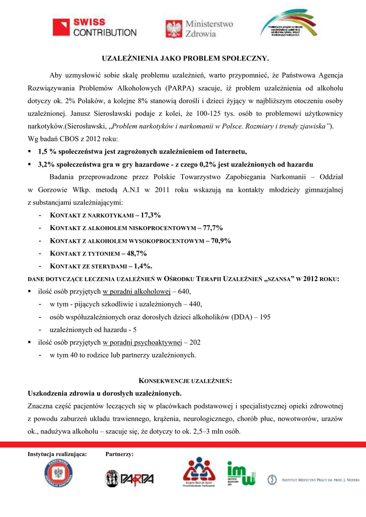 UZALEŻNIENIA JAKO PROBLEM SPOŁECZNY. Aby uzmysłowić sobie skalę problemu uzależnień, warto przypomnieć, że Państwowa Agencja Rozwiązywania Problemów Alkoholowych (PARPA) szacuje, iż problem uzależnienia od alkoholu dotyczy ok. 2% Polaków, a kolejne 8% stanowią dorośli i dzieci żyjący w najbliższym otoczeniu osoby uzależnionej. Janusz Sierosławski podaje z kolei, że 100-125 tys. osób to problemowi użytkownicy narkotyków.(Sierosławski, „Problem narkotyków i narkomanii w Polsce. Rozmiary i trendy zjawiska”). Wg badań CBOS z 2012 roku: 1,5 % społeczeństwa jest zagrożonych uzależnieniem od Internetu, 3,2% społeczeństwa gra w gry hazardowe - z czego 0,2% jest uzależnionych od hazardu Badania przeprowadzone przez Polskie Towarzystwo Zapobiegania Narkomanii – Oddział w Gorzowie Wlkp. metodą A.N.I w 2011 roku wskazują na kontakty młodzieży gimnazjalnej z substancjami uzależniającymi: - KONTAKT Z NARKOTYKAMI – 17,3% - KONTAKT Z ALKOHOLEM NISKOPROCENTOWYM – 77,7% - KONTAKT Z ALKOHOLEM WYSOKOPROCENTOWYM – 70,9% - KONTAKT Z TYTONIEM – 48,7% - KONTAKT ZE STERYDAMI – 1,4%. DANE DOTYCZĄCE LECZENIA UZALEŻNIEŃ W OŚRODKU TERAPII UZALEŻNIEŃ „SZANSA” W 2012 ROKU: ilość osób przyjętych w poradni alkoholowej – 640, - w tym - pijących szkodliwie i uzależnionych – 440, - osób współuzależnionych oraz dorosłych dzieci alkoholików (DDA) – 195 - uzależnionych od hazardu - 5 ilość osób przyjętych w poradni psychoaktywnej – 202 - w tym 40 to rodzice lub partnerzy uzależnionych. KONSEKWENCJE UZALEŻNIEŃ: Uszkodzenia zdrowia u dorosłych uzależnionych. Znaczna część pacjentów leczących się w placówkach podstawowej i specjalistycznej opieki zdrowotnej z powodu zaburzeń układu trawiennego, krążenia, neurologicznego, chorób płuc, nowotworów, urazów ok., nadużywa alkoholu – szacuje się, że dotyczy to ok. 2,5–3 mln osób. Instytucja realizująca: Partnerzy: Uszkodzenia rozwoju psychofizycznego młodzieży. Zdaniem ekspertów poważne szkody związane z piciem alkoholu lub zażywaniem przez dzieci i młodzież występują u około 10 – 15% populacji w wieku między 15 a 18 rokiem życia, ale rozmiary realnych zagrożeń są znacznie wyższe. W ciągu ostatnich lat zwiększyła się ilość pijącej i upijającej się młodzieży, w szczególności dziewcząt, oraz zmniejszyła ilość abstynentów. Pojawił się problem uzależnień behawioralnych: 24% gorzowskiej młodzieży uważa Internet jako sposób na ucieczkę od problemów i szanse na poprawienie nastroju. Szkody występujące u członków rodzin z problemem uzależnienia. Występują one u około 3–4 mln osób (dorosłych i dzieci) i obejmują przede wszystkim schorzenia psychosomatyczne i zaburzenia emocjonalne spowodowane chronicznym stresem i przemocą oraz demoralizację, ubóstwo i obniżenie szans osiągnięcia kariery zawodowej. Alkoholowa dezorganizacja środowiska pracy i bezrobotnych. Szkody związane z piciem alkoholu w miejscu pracy obejmują przede wszystkim absencję, wypadki i obniżanie wydajności pracy. Wprawdzie spożycie alkoholu w miejscu pracy w latach zmniejszyło się w sposób istotny, jednak w dalszym ciągu stanowi to problem. Naruszenia prawa i porządku przez osoby pod wpływem substancji uzależniających: liczba zatrzymanych kierowców za prowadzenie pojazdów pod wpływem alkoholu w Gorzowie Wlkp. /2009 r./ - 516, liczba osób zatrzymanych do wytrzeźwienia w gorzowskiej Izbie Wytrzeźwień /2009 r./ - 3.117, przemoc w rodzinach z problemem uzależnień - w 2011 roku około 80% sprawców przemocy to osoby będące pod wpływem alkoholu lub narkotyków. Instytucja realizująca: Partnerzy:
