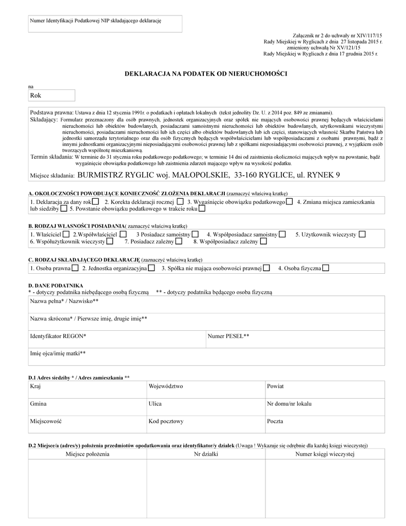 Numer Identyfikacji Podatkowej NIP składającego deklarację Załącznik nr 2 do uchwały nr XIV/117/15 Rady Miejskiej w Ryglicach z dnia 27 listopada 2015 r. zmieniony uchwałą Nr XV/121/15 Rady Miejskiej w Ryglicach z dnia 17 grudnia 2015 r. DEKLARACJA NA PODATEK OD NIERUCHOMOŚCI na Rok Podstawa prawna: Ustawa z dnia 12 stycznia 1991r. o podatkach i opłatach lokalnych (tekst jednolity Dz. U. z 2014 poz. 849 ze zmianami). Składający: Formularz przeznaczony dla osób prawnych, jednostek organizacyjnych oraz spółek nie mających osobowości prawnej będących właścicielami nieruchomości lub obiektów budowlanych, posiadaczami samoistnymi nieruchomości lub obiektów budowlanych, użytkownikami wieczystymi nieruchomości, posiadaczami nieruchomości lub ich części albo obiektów budowlanych lub ich części, stanowiących własność Skarbu Państwa lub jednostki samorządu terytorialnego oraz dla osób fizycznych będących współwłaścicielami lub współposiadaczami z osobami prawnymi, bądź z innymi jednostkami organizacyjnymi nieposiadającymi osobowości prawnej lub z spółkami nieposiadającymi osobowości prawnej, z wyjątkiem osób tworzących wspólnotę mieszkaniową. Termin składania: W terminie do 31 stycznia roku podatkowego podatkowego; w terminie 14 dni od zaistnienia okoliczności mających wpływ na powstanie, bądź wygaśnięcie obowiązku podatkowego lub zaistnienia zdarzeń mającego wpływ na wysokość podatku. Miejsce składania: BURMISTRZ RYGLIC woj. MAŁOPOLSKIE, 33-160 RYGLICE, ul. RYNEK 9 A. OKOLOCZNOŚCI POWODUJĄCE KONIECZNOŚĆ ZŁOŻENIA DEKLARACJI (zaznaczyć właściwą kratkę) 1. Deklaracja za dany rok 2. Korekta deklaracji rocznej 3. Wygaśnięcie obowiązku podatkowego lub siedziby 5. Powstanie obowiązku podatkowego w trakcie roku 4. Zmiana miejsca zamieszkania B. RODZAJ WŁASNOŚCI POSIADANIA( zaznaczyć właściwą kratkę) 1. Właściciel 2.Współwłaściciel . 3 Posiadacz samoistny 4. Współposiadacz samoistny 6. Współużytkownik wieczysty 7. Posiadacz zależny 8. Współposiadacz zależny 5. Użytkownik wieczysty C. RODZAJ SKŁADAJĄCEGO DEKLARACJĘ (zaznaczyć właściwą kratkę) 1. Osoba prawna 2. Jednostka organizacyjna 3. Spółka nie mająca osobowości prawnej 4. Osoba fizyczna D. DANE PODATNIKA * - dotyczy podatnika niebędącego osobą fizyczną Nazwa pełna* / Nazwisko** ** - dotyczy podatnika będącego osoba fizyczną Nazwa skrócona* / Pierwsze imię, drugie imię** Identyfikator REGON* Numer PESEL** Imię ojca/imię matki** D.1 Adres siedziby * / Adres zamieszkania ** Kraj Województwo Powiat Gmina Ulica Nr domu/nr lokalu Miejscowość Kod pocztowy Poczta D.2 Miejsce/a (adres/y) położenia przedmiotów opodatkowania oraz identyfikator/y działek (Uwaga ! Wykazuje się odrębnie dla każdej księgi wieczystej) Miejsce położenia Nr działki Numer księgi wieczystej E. DANE DOTYCZĄCE PRZEDMIOTÓW OPODATKOWANIA (z wyjątkiem zwolnionych) Lp. I Wyszczególnienie Powierzchnia gruntów (Wykazujemy z dokładnością do 1m2) 1) związanych z prowadzeniem działalności gospodarczej, bez względu na sposób zakwalifikowania w ewidencji gruntów i budynków 2) pod wodami powierzchniowymi stojącymi lub wodami powierzchniowymi płynącymi jezior i zbiorników sztucznych 3) pozostałych, w tym zajętych na prowadzenie odpłatnej statutowej działalności pożytku publicznego przez organizacje pożytku publicznego II Podstawa opodatkowania …................................................m2 …................................................ha …................................................m2 4) niezabudowanych objętych obszarem rewitalizacji, o których mowa w ustawie z dnia 9 października 2015r. o rewitalizacji (Dz. U. poz. 1777), i położonych na terenach, dla których miejscowy plan zagospodarowania przestrzennego przewiduje przeznaczenie pod zabudowę mieszkaniową, usługową albo zabudowę ….................................................m2 o przeznaczeniu mieszkalnym obejmującym wyłącznie te rodzaje zabudowy, jeżeli od dnia wejście w życie tego planu w odniesieniu do tych gruntów upłynął okres 4 lat, a w tym czasie nie zakończono budowy zgodnie z przepisami prawa budowlanego. Powierzchnia użytkowa budynków lub ich części (1) - kondygnacji o wysokości powyżej 2,20 m - kondygnacji o wysokości od 1,40.2,20 m (zaliczyć należy 50% powierzchni) .........................m2 …......................m2 ….....................m2 …......................m2 .........................m2 …......................m2 ….....................m2 …......................m2 ….....................m2 …......................m2 1) mieszkalnych 2) związanych z prowadzeniem działalności gospodarczej oraz od budynków mieszkalnych lub ich części zajętych na prowadzenie działalności gospodarczej 3) zajętych na prowadzenie działalności gospodarczej w zakresie obrotu kwalifikowanym materiałem siewnym 4) związanych z udzielaniem świadczeń zdrowotnych, w rozumieniu przepisów o działalności leczniczej, zajętych przez podmioty udzielające tych świadczeń III 5) pozostałych ogółem, w tym zajęte na prowadzenie odpłatnej statutowej działalności pożytku publicznego przez organizacje pożytku publicznego Budowle lub ich części związane z prowadzeniem działalności gospodarczej (wartość, o której mowa w przepisach o podatkach dochodowych) ...….............................…………..zł Stawka podatku wynikająca z uchwały Rady Miejskiej w Ryglicach w zł, gr Kwota podatku w zł, gr F. ŁĄCZNA KWOTA PODATKU KWOTA PODATKU Suma kwot z kol. E (należy zaokrąglić do pełnych złotych) …............................................................................. zł G. INFORMACJE O PRZEDMIOTACH ZWOLNIONYCH (podać powierzchnię, bądź wartość budowli przedmiotów zwolnionych oraz przepis prawa, z jakiego występuje zwolnienie) 1.Grunty sklasyfikowane jako nieużytki (N)