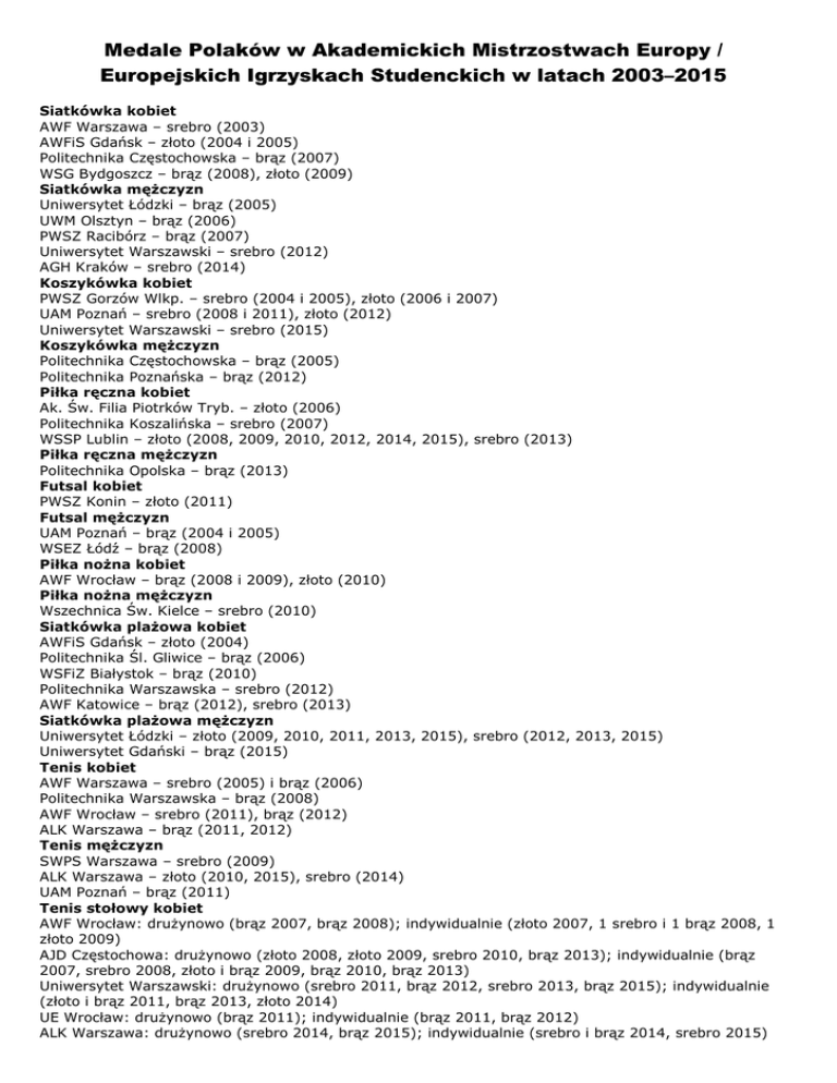 Medale Polaków w Akademickich Mistrzostwach Europy / Europejskich Igrzyskach Studenckich w latach 2003–2015 Siatkówka kobiet AWF Warszawa – srebro (2003) AWFiS Gdańsk – złoto (2004 i 2005) Politechnika Częstochowska – brąz (2007) WSG Bydgoszcz – brąz (2008), złoto (2009) Siatkówka mężczyzn Uniwersytet Łódzki – brąz (2005) UWM Olsztyn – brąz (2006) PWSZ Racibórz – brąz (2007) Uniwersytet Warszawski – srebro (2012) AGH Kraków – srebro (2014) Koszykówka kobiet PWSZ Gorzów Wlkp. – srebro (2004 i 2005), złoto (2006 i 2007) UAM Poznań – srebro (2008 i 2011), złoto (2012) Uniwersytet Warszawski – srebro (2015) Koszykówka mężczyzn Politechnika Częstochowska – brąz (2005) Politechnika Poznańska – brąz (2012) Piłka ręczna kobiet Ak. Św. Filia Piotrków Tryb. – złoto (2006) Politechnika Koszalińska – srebro (2007) WSSP Lublin – złoto (2008, 2009, 2010, 2012, 2014, 2015), srebro (2013) Piłka ręczna mężczyzn Politechnika Opolska – brąz (2013) Futsal kobiet PWSZ Konin – złoto (2011) Futsal mężczyzn UAM Poznań – brąz (2004 i 2005) WSEZ Łódź – brąz (2008) Piłka nożna kobiet AWF Wrocław – brąz (2008 i 2009), złoto (2010) Piłka nożna mężczyzn Wszechnica Św. Kielce – srebro (2010) Siatkówka plażowa kobiet AWFiS Gdańsk – złoto (2004) Politechnika Śl. Gliwice – brąz (2006) WSFiZ Białystok – brąz (2010) Politechnika Warszawska – srebro (2012) AWF Katowice – brąz (2012), srebro (2013) Siatkówka plażowa mężczyzn Uniwersytet Łódzki – złoto (2009, 2010, 2011, 2013, 2015), srebro (2012, 2013, 2015) Uniwersytet Gdański – brąz (2015) Tenis kobiet AWF Warszawa – srebro (2005) i brąz (2006) Politechnika Warszawska – brąz (2008) AWF Wrocław – srebro (2011), brąz (2012) ALK Warszawa – brąz (2011, 2012) Tenis mężczyzn SWPS Warszawa – srebro (2009) ALK Warszawa – złoto (2010, 2015), srebro (2014) UAM Poznań – brąz (2011) Tenis stołowy kobiet AWF Wrocław: drużynowo (brąz 2007, brąz 2008); indywidualnie (złoto 2007, 1 srebro i 1 brąz 2008, 1 złoto 2009) AJD Częstochowa: drużynowo (złoto 2008, złoto 2009, srebro 2010, brąz 2013); indywidualnie (brąz 2007, srebro 2008, złoto i brąz 2009, brąz 2010, brąz 2013) Uniwersytet Warszawski: drużynowo (srebro 2011, brąz 2012, srebro 2013, brąz 2015); indywidualnie (złoto i brąz 2011, brąz 2013, złoto 2014) UE Wrocław: drużynowo (brąz 2011); indywidualnie (brąz 2011, brąz 2012) ALK Warszawa: drużynowo (srebro 2014, brąz 2015); indywidualnie (srebro i brąz 2014, srebro 2015) Tenis stołowy mężczyzn AJD Częstochowa: indywidualnie (brąz 2007) Uniwersytet Zielonogórski: drużynowo (brąz 2008) Politechnika Rzeszowska: drużynowo (srebro 2009, brąz 2010, brąz 2011, złoto 2012, złoto 2013, brąz 2014, złoto 2015); indywidualnie (srebro i brąz 2009, brąz 2010, 2 x brąz 2011, srebro i 2 x brąz 2012, złoto i 2 x brąz 2013, złoto i 2 x brąz 2014, srebro 2015) OSW Olsztyn: drużynowo (złoto 2011, brąz 2012); indywidualnie (złoto, srebro i brąz 2011, brąz 2012) ALK Warszawa: drużynowo (srebro 2014); indywidualnie (srebro i brąz 2014) Politechnika Gdańska: indywidualnie (srebro 2015) Tenis stołowy K + M (mixty) AWF Wrocław / UE Wrocław – srebro 2008 AJD Częstochowa / Uniwersytet Zielonogórski – brąz 2008 AJD Częstochowa / Politechnika Rzeszowska – złoto i brąz 2009 Politechnika Rzeszowska / Uniwersytet Kazań – złoto 2010 UE Wrocław / Politechnika Rzeszowska – złoto 2011 Badminton AZS Polska: drużynowo (brąz 2004, złoto 2005, srebro 2006); indywidualnie (2 x srebro i 4 x brąz 2004, 2 x złoto, 1 srebro, 1 brąz 2005, 1 złoto i 1 brąz 2006) AHE Łódź: drużynowo (złoto 2008, złoto 2009, złoto 2010); indywidualnie (3 złote, 2 srebrne, 2 brązowe 2008, 3 złote, 2 srebrne 2009, 2 złote, 1 srebrny, 2 brązowe 2010) AWF Wrocław: indywidualnie (2 x złoto 2008, 1 srebro 2009) WSFiZ Białystok: indywidualnie (1 brąz 2010) UWM Olsztyn: indywidualnie (1 srebro 2012) Uniwersytet Opolski: drużynowo (brąz 2015); indywidualnie (1 srebro, 4 brązy 2014, 3 x złoto 2015) Uniwersytet Warszawski: indywidualnie (2 x brąz 2015) Wioślarstwo WSG Bydgoszcz – (2006: 1 srebrny i 1 brązowy, 2008: 3 złote i 4 srebrne, 2009: 10 złotych i 2 srebrne, 2010: 4 złote, 1 srebrny, 3 brązowe; 2011: 1 złoty, 2 srebrne, 3 brązowe,2013: 4 złote i 1 srebrny, 2015: 2 srebrne i 1 brązowy), klasyfikacja uczelniana – 1 miejsca w latach 2008, 2009, 2010, 2011, 2013, 3 miejsce w roku 2015 UKW Bydgoszcz – (2006: 1 srebrny i 1 brązowy, 2008: 2 złote i 1 srebrny, 2009: 1 złoty, 3 srebrne, 1 brązowy, 2010: 2 złote, 1 srebrny, 3 brązowe, 2011: 2 brązowe, 2013: 1 srebrny i 1 brązowy, 2015: 1 srebrny i 1 brązowy), klasyfikacja uczelniana – 2 miejsce (2010) UAM Poznań – (2006: 1 złoty, 2007: 2 srebrne, 2008: 2 złote i 1 brązowy, 2009: 1 złoty i 1 srebrny, 2010: 1 brązowy, 2013: 1 brązowy) ALK Warszawa – (2008: 1 brązowy) WSPiA Poznań – (2009: 1 złoty) UPr Poznań – (2009: 1 złoty, 2010: 1 złoty, 2013: 2 złote, 1 srebrny, 1 brązowy, 2015: 1 srebrny) Politechnika Poznańska – (2015: 2 srebrne) Brydż Politechnika Wrocławska – złoto (2009, 2013), srebro (2011), brąz (2015) Uniwersytet Warszawski – brąz (2011), srebro (2015); także brąz 2015 - indywidualnie Politechnika Gdańska – złoto indywidualnie (2013) Karate AZS Polska – 3 złote, 3 srebrne, 10 brązowych (2005) AZS Polska – 1 brązowy (2011) Politechnika Łódzka – 1 srebrny (2013) Taekwondo Uniwersytet Łódzki – 1 srebrny (2013) Wspinaczka sportowa PWSZ Tarnów – 1 złoty w konkurencji (2015) UR Kraków – 1 srebrny w konkurencji (2015) Szachy Uniwersytet Warszawski – 1 srebrny drużynowo i 1 srebrny indywidualnie (2015) UE Poznań – 1 brązowy drużynowo (2015) Podsumowanie 2003-2015 dyscyplina siatkówka K siatkówka M koszykówka K koszykówka M piłka ręc