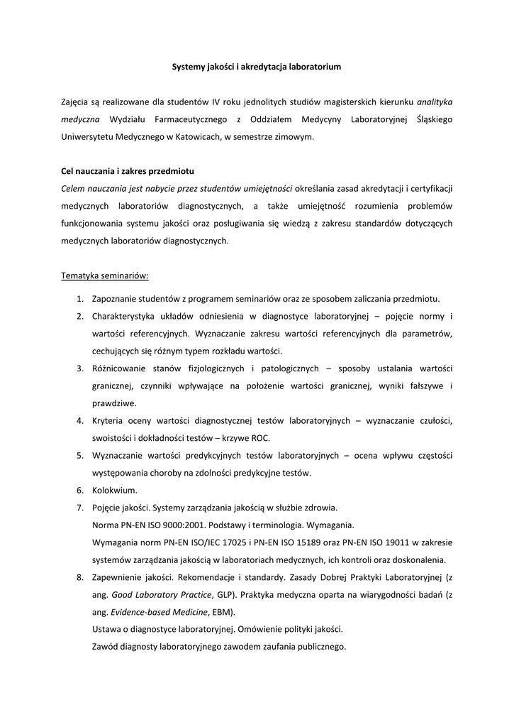 Systemy jakości i akredytacja laboratorium Zajęcia są realizowane dla studentów IV roku jednolitych studiów magisterskich kierunku analityka medyczna Wydziału Farmaceutycznego z Oddziałem Medycyny Laboratoryjnej Śląskiego Uniwersytetu Medycznego w Katowicach, w semestrze zimowym. Cel nauczania i zakres przedmiotu Celem nauczania jest nabycie przez studentów umiejętności określania zasad akredytacji i certyfikacji medycznych laboratoriów diagnostycznych, a także umiejętność rozumienia problemów funkcjonowania systemu jakości oraz posługiwania się wiedzą z zakresu standardów dotyczących medycznych laboratoriów diagnostycznych. Tematyka seminariów: 1. Zapoznanie studentów z programem seminariów oraz ze sposobem zaliczania przedmiotu. 2. Charakterystyka układów odniesienia w diagnostyce laboratoryjnej – pojęcie normy i wartości referencyjnych. Wyznaczanie zakresu wartości referencyjnych dla parametrów, cechujących się różnym typem rozkładu wartości. 3. Różnicowanie stanów fizjologicznych i patologicznych – sposoby ustalania wartości granicznej, czynniki wpływające na położenie wartości granicznej, wyniki fałszywe i prawdziwe. 4. Kryteria oceny wartości diagnostycznej testów laboratoryjnych – wyznaczanie czułości, swoistości i dokładności testów – krzywe ROC. 5. Wyznaczanie wartości predykcyjnych testów laboratoryjnych – ocena wpływu częstości występowania choroby na zdolności predykcyjne testów. 6. Kolokwium. 7. Pojęcie jakości. Systemy zarządzania jakością w służbie zdrowia. Norma PN-EN ISO 9000:2001. Podstawy i terminologia. Wymagania. Wymagania norm PN-EN ISO/IEC 17025 i PN-EN ISO 15189 oraz PN-EN ISO 19011 w zakresie systemów zarządzania jakością w laboratoriach medycznych, ich kontroli oraz doskonalenia. 8. Zapewnienie jakości. Rekomendacje i standardy. Zasady Dobrej Praktyki Laboratoryjnej (z ang. Good Laboratory Practice, GLP). Praktyka medyczna oparta na wiarygodności badań (z ang. Evidence-based Medicine, EBM). Ustawa o diagnostyce laboratoryjnej. Omówienie polityki jakości. Zawód diagnosty laboratoryjnego zawodem zaufania publicznego. 9. Zarządzanie jakością – walidacja metod badawczych. Metody walidacji w laboratoriach medycznych. Protokół z walidacji (parametry charakterystyki metody podlegające walidacji) 10. Medyczne laboratorium diagnostyczne. Wymagania, jakim powinno odpowiadać medyczne laboratorium diagnostyczne. Wytyczne dla medycznych laboratoriów diagnostycznych obowiązujące przy ubieganiu się o akredytację. Wymogi, normy, zalecenia dotyczące systemu jakości. 11. Tworzenie dokumentacji systemu jakości w laboratorium analitycznym PN:EN ISO 15189. Laboratoria medyczne – specyficzne wymagania dotyczące jakości i kompetencji. Budowa standardowych procedur operacyjnych, ich weryfikacja i efektywność. Praktyczne tworzenie Księgi Jakości; KLOG, SOP, procedury QAG. 12. Kontrola wewnątrzlaboratoryjna w medycznym laboratorium diagnostycznym jako element budowy systemu jakości. Jakość metody pomiarowej. Całkowity dopuszczalny błąd pomiaru. Błędy przypadkowe i systematyczne. Obciążenie. Karty kontrolne (Karty Levey-Jenningsa – sporządzanie, ocena reguł interpretacyjnych). 13. Systemy jakości oceny zewnętrznej medycznych laboratoriów diagnostycznych. Zasady certyfikacji i akredytacji medycznych laboratoriów diagnostycznych. 14. Kolokwium. 15. Zaliczenie przedmiotu. Forma zakończenia zajęć: zaliczenie na ocenę Warunki uzyskania zaliczenia: przedmiot zalicza się na podstawie obecności i aktywnego udziału studenta w seminariach oraz uzyskania pozytywnej oceny z dwóch kolokwiów, obejmujących zagadnienia omawiane podczas zajęć dydaktycznych. O wynikach kolokwium studenci informowani są w formie ustnej lub mailowej przez prowadzącego ćwiczenia. Piśmiennictwo: 1. Rozporządzenie Ministra Zdrowia z dnia 23 marca 2006 r. w sprawie standardów jakości dla medycznych laboratoriów diagnostycznych i mikrobiologicznych. 2. Rozporządzenie Ministra Zdrowia z dnia 21 stycznia 2009 r. zmieniające rozporządzenie w sprawie standardów jakości dla medycznych laboratoriów diagnostycznych i mikrobiologicznych Dz. U. nr 2006, 61, poz. 435. 3. Norma PN-EN ISO 9000:2001. Systemy zarządzania jakością. Podstawy i terminologia. 4. Norma PN-EN ISO 9000:2001. Systemy zarządzania jakością. Wymagania. 5. Norma PN-EN ISO/IEC 17025. Ogólne wymagania dotyczące kompetencji laboratoriów badawczych i wzorcujących. 6. Norma PN-EN ISO 15189. Laboratoria medyczne. Szczegółowe wymagania dotyczące jakości i kompetencji. 7. Krzysztof Opolski, Grażyna Dykowska, Monika Możdżonek: Zarządzanie przez jakość w usługach zdrowotnych. Teoria i Praktyka. Wyd. CeDeWu, Warszawa 2003. 8. Bożena Antes-Maciejczyk, Ewa Panek: Kontrola jakości badań laboratoryjnych. Wyd. ŚAM, Katowice 1990. 9. Badanie i Diagnoza. Miesięcznik – dla pracowników diagnostyki laboratoryjnej. 10. Diagnostyka Laboratoryjna. Kwartalnik. 11. Ustawa o diagnostyce laboratoryjnej. 12. Internet: Strony internetowe – Centrum Monitorowania Jakości w Ochronie Zdrowia; Centralnego Ośrodka Badań Jakości w Diagnostyce laboratoryjnej; Polskiego Centrum Akredytacji.