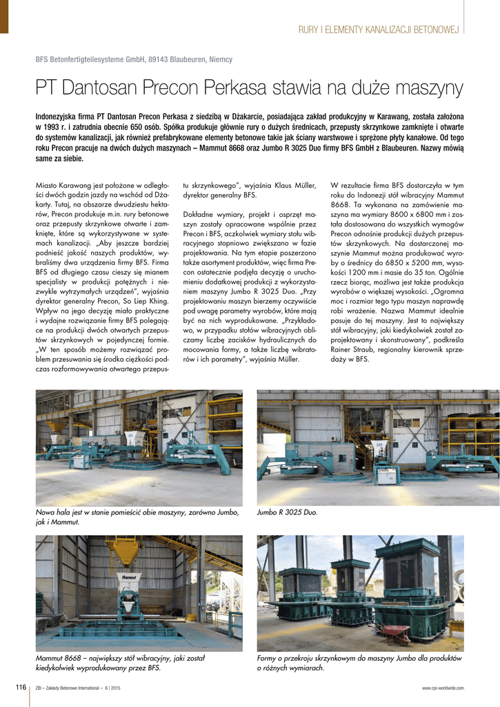 RURY I ELEMENTY KANALIZACJI BETONOWEJ BFS Betonfertigteilesysteme GmbH, 89143 Blaubeuren, Niemcy PT Dantosan Precon Perkasa stawia na duże maszyny Indonezyjska firma PT Dantosan Precon Perkasa z siedzibą w Dżakarcie, posiadająca zakład produkcyjny w Karawang, została założona w 1993 r. i zatrudnia obecnie 650 osób. Spółka produkuje głównie rury o dużych średnicach, przepusty skrzynkowe zamknięte i otwarte do systemów kanalizacji, jak również prefabrykowane elementy betonowe takie jak ściany warstwowe i sprężone płyty kanałowe. Od tego roku Precon pracuje na dwóch dużych maszynach – Mammut 8668 oraz Jumbo R 3025 Duo firmy BFS GmbH z Blaubeuren. Nazwy mówią same za siebie. Miasto Karawang jest położone w odległości dwóch godzin jazdy na wschód od Dżakarty. Tutaj, na obszarze dwudziestu hektarów, Precon produkuje m.in. rury betonowe oraz przepusty skrzynkowe otwarte i zamknięte, które są wykorzystywane w systemach kanalizacji. „Aby jeszcze bardziej podnieść jakość naszych produktów, wybraliśmy dwa urządzenia firmy BFS. Firma BFS od długiego czasu cieszy się mianem specjalisty w produkcji potężnych i niezwykle wytrzymałych urządzeń”, wyjaśnia dyrektor generalny Precon, So Liep Khing. Wpływ na jego decyzję miało praktyczne i wydajne rozwiązanie firmy BFS polegające na produkcji dwóch otwartych przepustów skrzynkowych w pojedynczej formie. „W ten sposób możemy rozwiązać problem przesuwania się środka ciężkości podczas rozformowywania otwartego przepus- 116 tu skrzynkowego”, wyjaśnia Klaus Müller, dyrektor generalny BFS. Dokładne wymiary, projekt i osprzęt maszyn zostały opracowane wspólnie przez Precon i BFS, aczkolwiek wymiary stołu wibracyjnego stopniowo zwiększano w fazie projektowania. Na tym etapie poszerzono także asortyment produktów, więc firma Precon ostatecznie podjęła decyzję o uruchomieniu dodatkowej produkcji z wykorzystaniem maszyny Jumbo R 3025 Duo. „Przy projektowaniu maszyn bierzemy oczywiście pod uwagę parametry wyrobów, które mają być na nich wyprodukowane. „Przykładowo, w przypadku stołów wibracyjnych obliczamy liczbę zacisków hydraulicznych do mocowania formy, a także liczbę wibratorów i ich parametry”, wyjaśnia Müller. W rezultacie firma BFS dostarczyła w tym roku do Indonezji stół wibracyjny Mammut 8668. Ta wykonana na zamówienie maszyna ma wymiary 8600 x 6800 mm i została dostosowana do wszystkich wymogów Precon odnośnie produkcji dużych przepustów skrzynkowych. Na dostarczonej maszynie Mammut można produkować wyroby o średnicy do 6850 x 5200 mm, wysokości 1200 mm i masie do 35 ton. Ogólnie rzecz biorąc, możliwa jest także produkcja wyrobów o większej wysokości. „Ogromna moc i rozmiar tego typu maszyn naprawdę robi wrażenie. Nazwa Mammut idealnie pasuje do tej maszyny. Jest to największy stół wibracyjny, jaki kiedykolwiek został zaprojektowany i skonstruowany”, podkreśla Rainer Straub, regionalny kierownik sprzedaży w BFS. Nowa hala jest w stanie pomieścić obie maszyny, zarówno Jumbo, jak i Mammut. Jumbo R 3025 Duo. Mammut 8668 – największy stół wibracyjny, jaki został kiedykolwiek wyprodukowany przez BFS. Formy o przekroju skrzynkowym do maszyny Jumbo dla produktów o różnych wymiarach. ZBI – Zakłady Betonowe International – 6 | 2015 www.cpi-worldwide.com RURY I ELEMENTY KANALIZACJI BETONOWEJ Przepust skrzynkowy wyprodukowany na maszynie Jumbo podczas rozformowywania. Dojrzała technologia Firma BFS skonstruowała dla Precon wyjątkowo stabilny i odporny na wstrząsy stół wibracyjny, wyposażony w zawieszenie pneumatyczne, które sprawia, że maszyna jest zawsze precyzyjnie wyważona i ustawiona w pozycji poziomej – niezależnie od obciążenia. „Dzięki układowi łożyskowemu stołu siły wibrowania są w całości wykorzystywane w celu zagęszczania betonu; otoczenie maszyny i jej podstawa są odizolowane od wibracji stołu”, mówi Müller, wyjaśniając zalety zawieszenia pneumatycznego. Wibracje stołu wibracyjnego są wytwarzane przez 14 niezwykle mocnych wibratorów. Są one przymocowane na spodzie stołu w dwóch rzędach po siedem wibratorów i są ze sobą połączone. Napędzane są dwoma mocnymi napędami elektrycznymi. Dwa układy napędowe działają synchronicznie, co gwarantuje równomierną dużą siłę zagęszczania w każdym punkcie stołu, a tym samym szybkie i bardzo dobre zagęszczenie wyrobu. Napędy elektryczne sterowane częstotliwością zmniejszają poziom hałasu oraz zabezpieczają materiał podczas produkcji. Ponadto umożliwia to lepsze i łatwiejsze dostosowanie siły wibracji, co pozytywnie wpływa na jakość wyrobów. Poza tym napęd elektryczny skutecznie przeciwdziała problemom termicznym i wyciekom oleju. BFS świadomie zdecydowała się na napęd elektryczny zamiast rozwiązania hydraulicznego w celu rozwiązania problemu termicznego. „Ten system sprawdził się w szczególności w bardzo ciepłych krajach”, mówi Straub. Krótki czas przezbrojenia, niższe koszty Płaszcz formy jest zamocowany za pomocą zacisków hydraulicznych, które są sterowane standardowo za pomocą przycisku. „Jest to rozwiązanie proste w obsłudze i pozwala zaoszczędzić czas, ponieważ rozwww.cpi-worldwide.com Przepust skrzynkowy wyprodukowany na stole wibracyjnym Mammut podczas rozformowywania. formowywanie następuje bardzo szybko”, mówi zadowolony So Liep Khing. W zaciskach firma BFS zintegrowała hydrauliczne siłowniki rozformowywania w celu zminimalizowania obciążenia suwnicy, a tym samym obniżenia kosztów. Kolejną zaletą jest to, że wspomaganie rozformowywania można w prosty sposób przestawiać za pomocą hydraulicznych zacisków. „Dzięki temu czas przezbrojenia jest jeszcze krótszy”, wyjaśnia Straub. Do wewnętrznej formy przymocowane jest hydrauliczne urządzenie prasujące jednostki formującej bosy koniec . Zapewnia to idealne formowanie bosego 