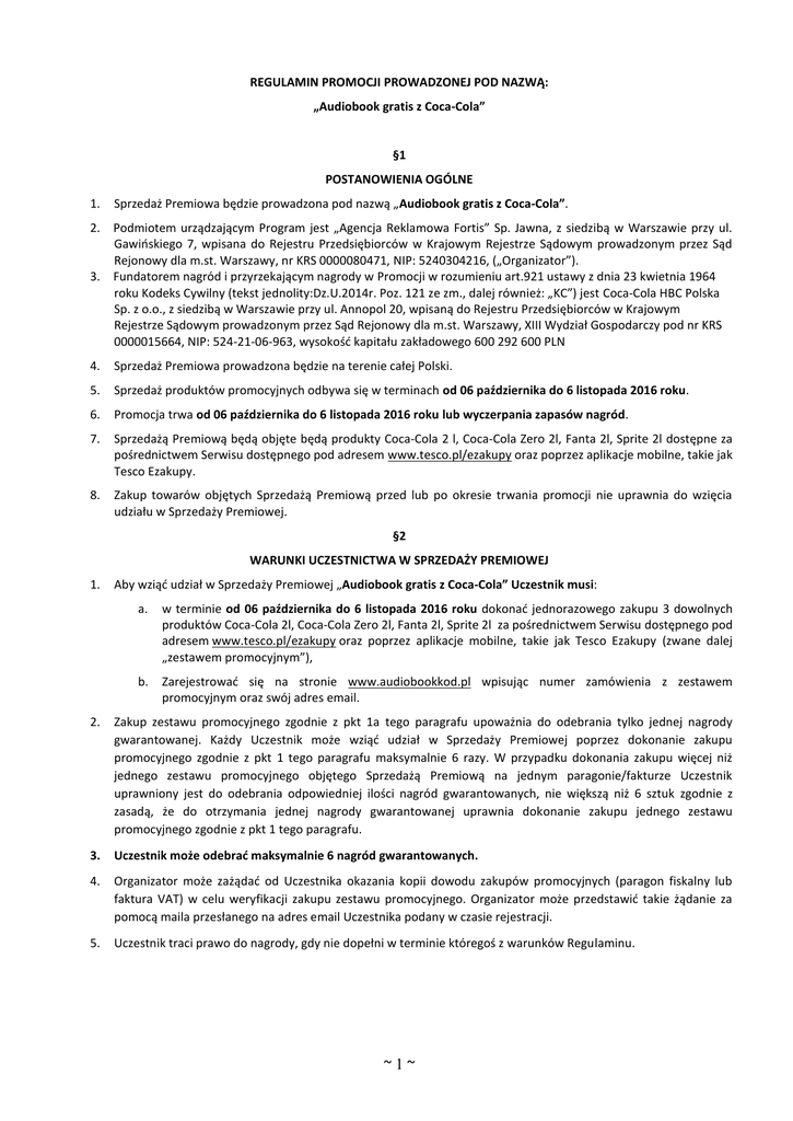 REGULAMIN PROMOCJI PROWADZONEJ POD NAZWĄ: „Audiobook gratis z Coca-Cola” §1 POSTANOWIENIA OGÓLNE 1. Sprzedaż Premiowa będzie prowadzona pod nazwą „Audiobook gratis z Coca-Cola”. 2. Podmiotem urządzającym Program jest „Agencja Reklamowa Fortis” Sp. Jawna, z siedzibą w Warszawie przy ul. Gawińskiego 7, wpisana do Rejestru Przedsiębiorców w Krajowym Rejestrze Sądowym prowadzonym przez Sąd Rejonowy dla m.st. Warszawy, nr KRS 0000080471, NIP: 5240304216, („Organizator”). 3. Fundatorem nagród i przyrzekającym nagrody w Promocji w rozumieniu art.921 ustawy z dnia 23 kwietnia 1964 roku Kodeks Cywilny (tekst jednolity:Dz.U.2014r. Poz. 121 ze zm., dalej również: „KC”) jest Coca-Cola HBC Polska Sp. z o.o., z siedzibą w Warszawie przy ul. Annopol 20, wpisaną do Rejestru Przedsiębiorców w Krajowym Rejestrze Sądowym prowadzonym przez Sąd Rejonowy dla m.st. Warszawy, XIII Wydział Gospodarczy pod nr KRS 0000015664, NIP: 524-21-06-963, wysokość kapitału zakładowego 600 292 600 PLN 4. Sprzedaż Premiowa prowadzona będzie na terenie całej Polski. 5. Sprzedaż produktów promocyjnych odbywa się w terminach od 06 października do 6 listopada 2016 roku. 6. Promocja trwa od 06 października do 6 listopada 2016 roku lub wyczerpania zapasów nagród. 7. Sprzedażą Premiową będą objęte będą produkty Coca-Cola 2 l, Coca-Cola Zero 2l, Fanta 2l, Sprite 2l dostępne za pośrednictwem Serwisu dostępnego pod adresem www.tesco.pl/ezakupy oraz poprzez aplikacje mobilne, takie jak Tesco Ezakupy. 8. Zakup towarów objętych Sprzedażą Premiową przed lub po okresie trwania promocji nie uprawnia do wzięcia udziału w Sprzedaży Premiowej. §2 WARUNKI UCZESTNICTWA W SPRZEDAŻY PREMIOWEJ 1. Aby wziąć udział w Sprzedaży Premiowej „Audiobook gratis z Coca-Cola” Uczestnik musi: a. w terminie od 06 października do 6 listopada 2016 roku dokonać jednorazowego zakupu 3 dowolnych produktów Coca-Cola 2l, Coca-Cola Zero 2l, Fanta 2l, Sprite 2l za pośrednictwem Serwisu dostępnego pod adresem www.tesco.pl/ezakupy oraz poprzez aplikacje mobilne, takie jak Tesco Ezakupy (zwane dalej „zestawem promocyjnym”), b. Zarejestrować się na stronie www.audiobookkod.pl wpisując numer zamówienia z zestawem promocyjnym oraz swój adres email. 2. Zakup zestawu promocyjnego zgodnie z pkt 1a tego paragrafu upoważnia do odebrania tylko jednej nagrody gwarantowanej. Każdy Uczestnik może wziąć udział w Sprzedaży Premiowej poprzez dokonanie zakupu promocyjnego zgodnie z pkt 1 tego paragrafu maksymalnie 6 razy. W przypadku dokonania zakupu więcej niż jednego zestawu promocyjnego objętego Sprzedażą Premiową na jednym paragonie/fakturze Uczestnik uprawniony jest do odebrania odpowiedniej ilości nagród gwarantowanych, nie większą niż 6 sztuk zgodnie z zasadą, że do otrzymania jednej nagrody gwarantowanej uprawnia dokonanie zakupu jednego zestawu promocyjnego zgodnie z pkt 1 tego paragrafu. 3. Uczestnik może odebrać maksymalnie 6 nagród gwarantowanych. 4. Organizator może zażądać od Uczestnika okazania kopii dowodu zakupów promocyjnych (paragon fiskalny lub faktura VAT) w celu weryfikacji zakupu zestawu promocyjnego. Organizator może przedstawić takie żądanie za pomocą maila przesłanego na adres email Uczestnika podany w czasie rejestracji. 5. Uczestnik traci prawo do nagrody, gdy nie dopełni w terminie któregoś z warunków Regulaminu. ~1~ §3 NAGRODY I ZASADY ICH PRZYZNAWANIA 1. Nagrodą w Promocji jest kod umożliwiający ściągnięcie audiobooka - 6 wybranych audiobooków za pomocą strony http://pages.audioteka.com/pl/coca-cola/ albo aplikacji mobilnej Audioteka. Lista audiobooków stanowi Załącznik nr 1 2. Łączna ilość nagród gwarantowanych przeznaczonych do wydania to 10 000 sztuk. 3. Wartość nagród podana jest w Załączniku nr 1. 4. Nagrody są gwarantowane dla każdego Uczestnika, który kupi produkty objęte promocją i zarejestruje się na stronie www.audiobookkod.pl zgodnie z §2 niniejszego regulaminu. 5. Ilość nagród gwarantowanych jest ograniczona. Nagrody wydawane będą od 06 października do 6 listopada 2016 roku lub do wyczerpania zapasów. 6. Odebranie nagród po wyczerpaniu zapasów lub po terminie od 06 października do 6 listopada 2016 nie będzie możliwe. 7. Kody na Audiobooki można realizować do 15.11.2016 roku. §4 ODEBRANIE NAGRÓD 1. Nagrody w postaci kodów na Audiobook wysyłane będą na adres email podany w czasie rejestracji na stronie www.audiobookkod.pl 2. Warunkiem odebrania nagrody po otrzymaniu maila z kodem promocyjnym i linkiem do strony http://pages.audioteka.com/pl/coca-cola/ jest: a.) wybranie 1 Audiobooka dostępnego na stronie http://pages.audioteka.com/pl/coca-cola/ i przejście do "koszyka" z wybraną pozycją oraz zalogowanie się w Serwisie Audioteka bądź zarejestrowanie w Serwisie Audioteka. b.) wpisanie przy wybranej pozycji Audiobooka dostępnego na stronie http://pages.audioteka.com/pl/coca-cola/ Kodu promocyjnego w polu: „Mam kod promocyjny” i zatwierdzenie operacji Zakupu Audiobooka przy wykorzystaniu Kodu Promocyjnego, c.) podanie danych niezbędnych do finalizacji Zakupu wybranego Audiobooka (w tym w szczególności danych niezbędnych do utworzenia konta/ zalogowania się na już istniejącym koncie) i umożliwienia pobrania Audiobooka z Serwisu Audioteka, zgodnie z warunkami Regulaminu Organizatora d.) pobranie na urządzenie mobilne (telefon, tablet) bezpłatnej aplikacji Audioteka, która umożliwi odsłuchanie audiobooka zakupionego za pomocą Kodu promocyjnego otrzymanego od Partnera. Audiobook zakupiony przy użyciu Kodu promocyjnego będzie możliwy do odsłuchania tylko i wyłącznie w aplikacji Audioteka. 3. By wziąć udział w Promocji i dokonać Zakupu wybranego Audiobooka z Kolekcji za pomocą Kodu promocyjnego należy dokonać uprzedniej rejestracji konta w Serwisie Audioteka. Aby dokonać rejestracji konta należy wejść na stronę Serwisu Audioteka p